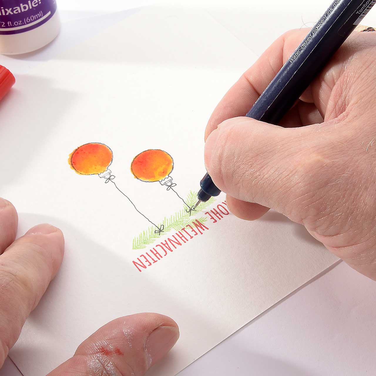 Ziehen Sie mit dem Tombow Fineliner je eine dünne Linie von dem Christbaumkugel Motiv zum Tannenzweig Motiv.