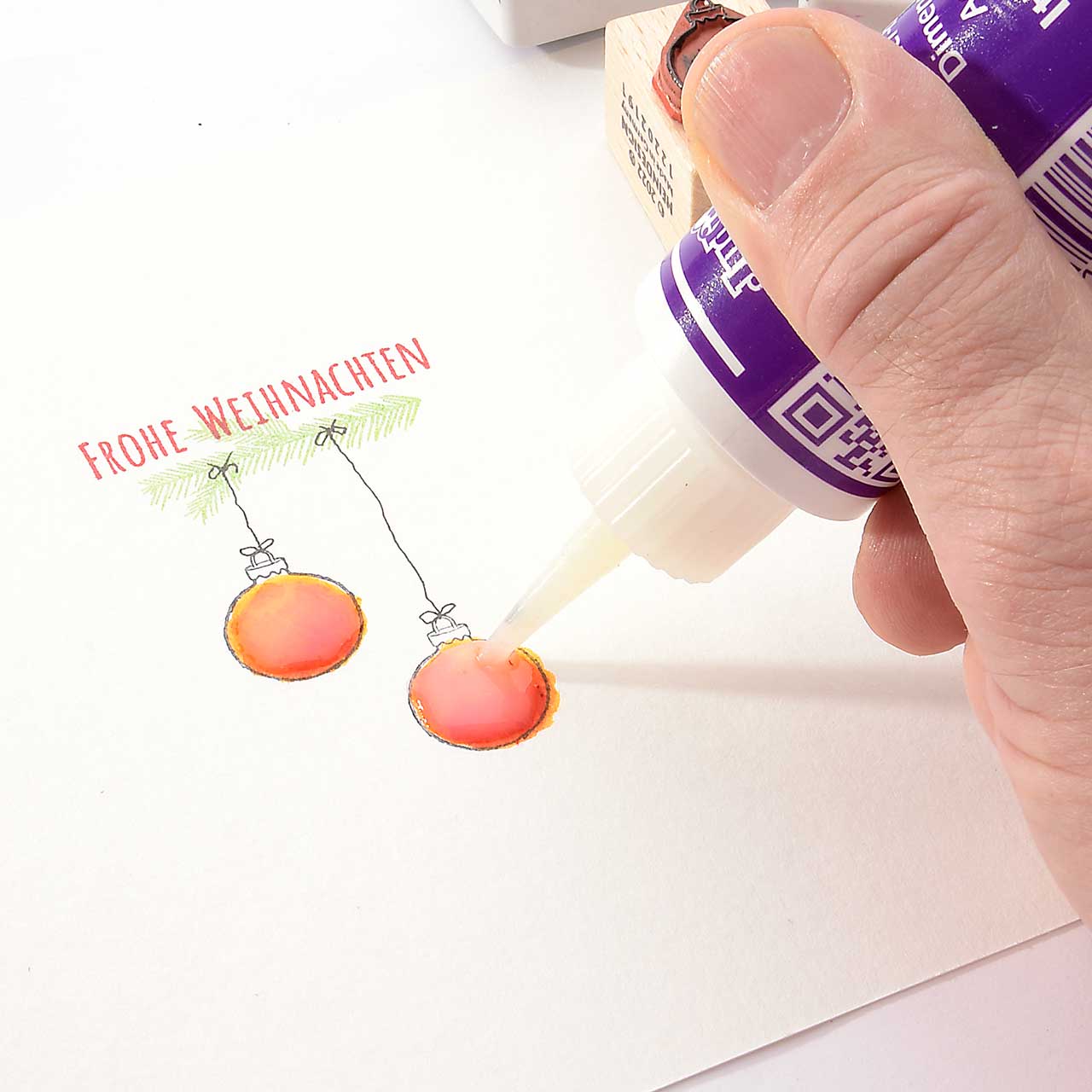 Geben Sie den Christbaumkugel Motiven eine dicke Glasur mit Diamond Glaze. Lassen Sie die Glasur mehrere Stunden trocknen.