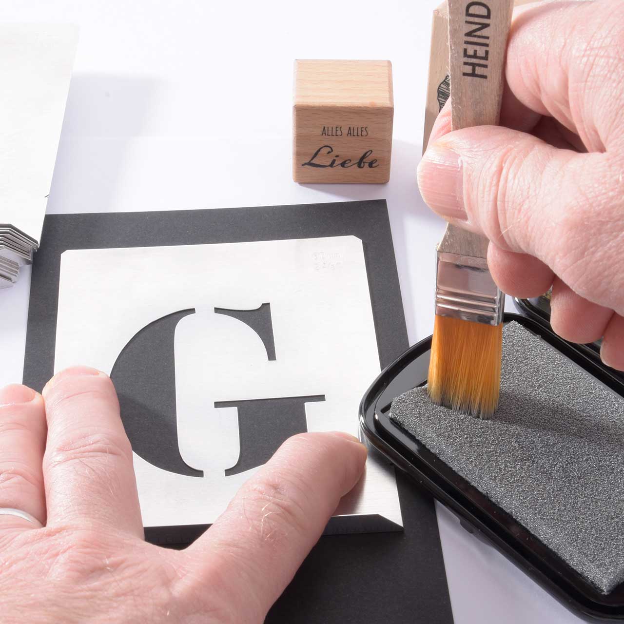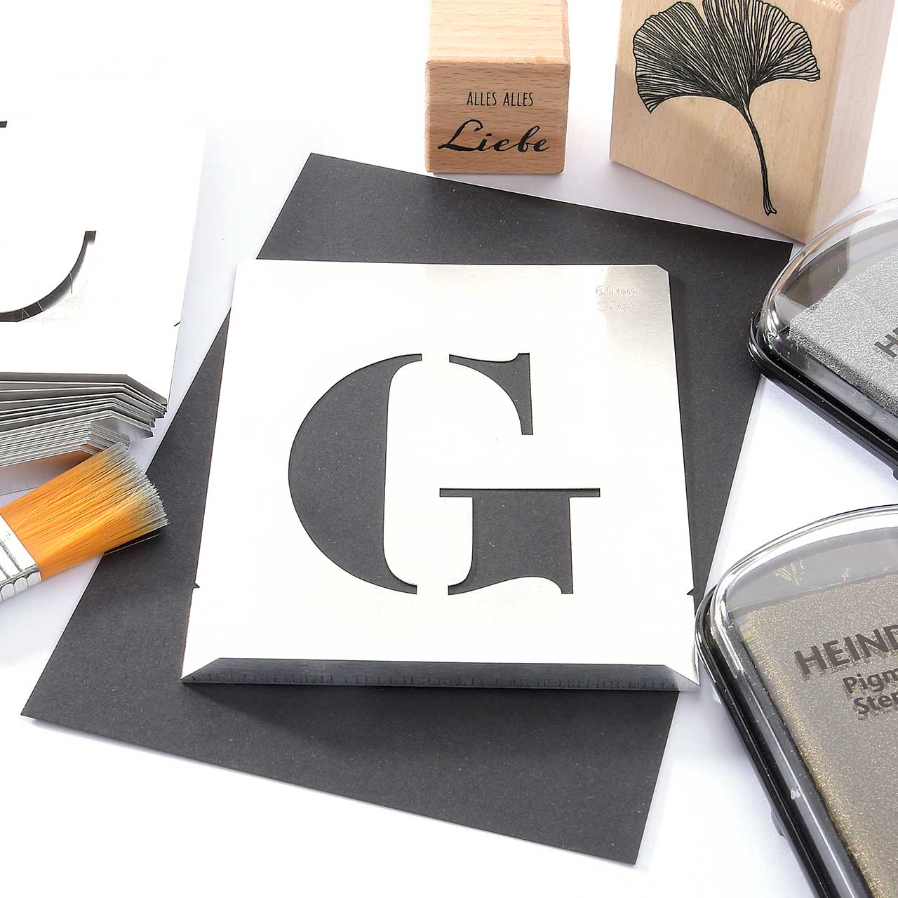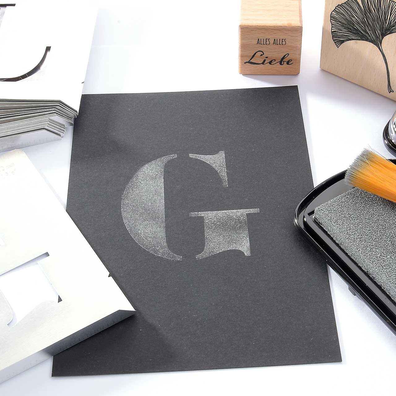 Legen Sie die „G“ Schablone* in die Mitte Ihrer Karte und tupfen Sie mit dem Pinsel Farbe aus dem silbernen Pigment-Stempelkissen* auf.