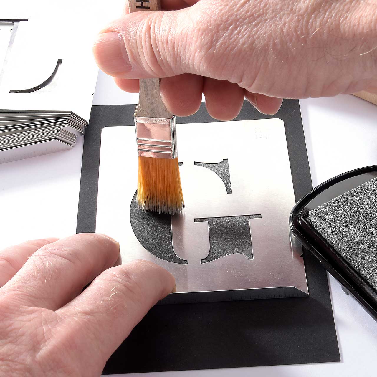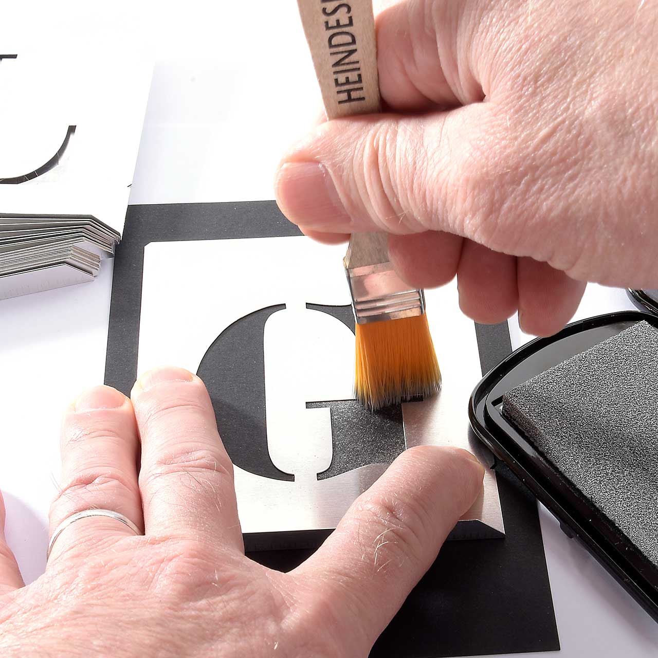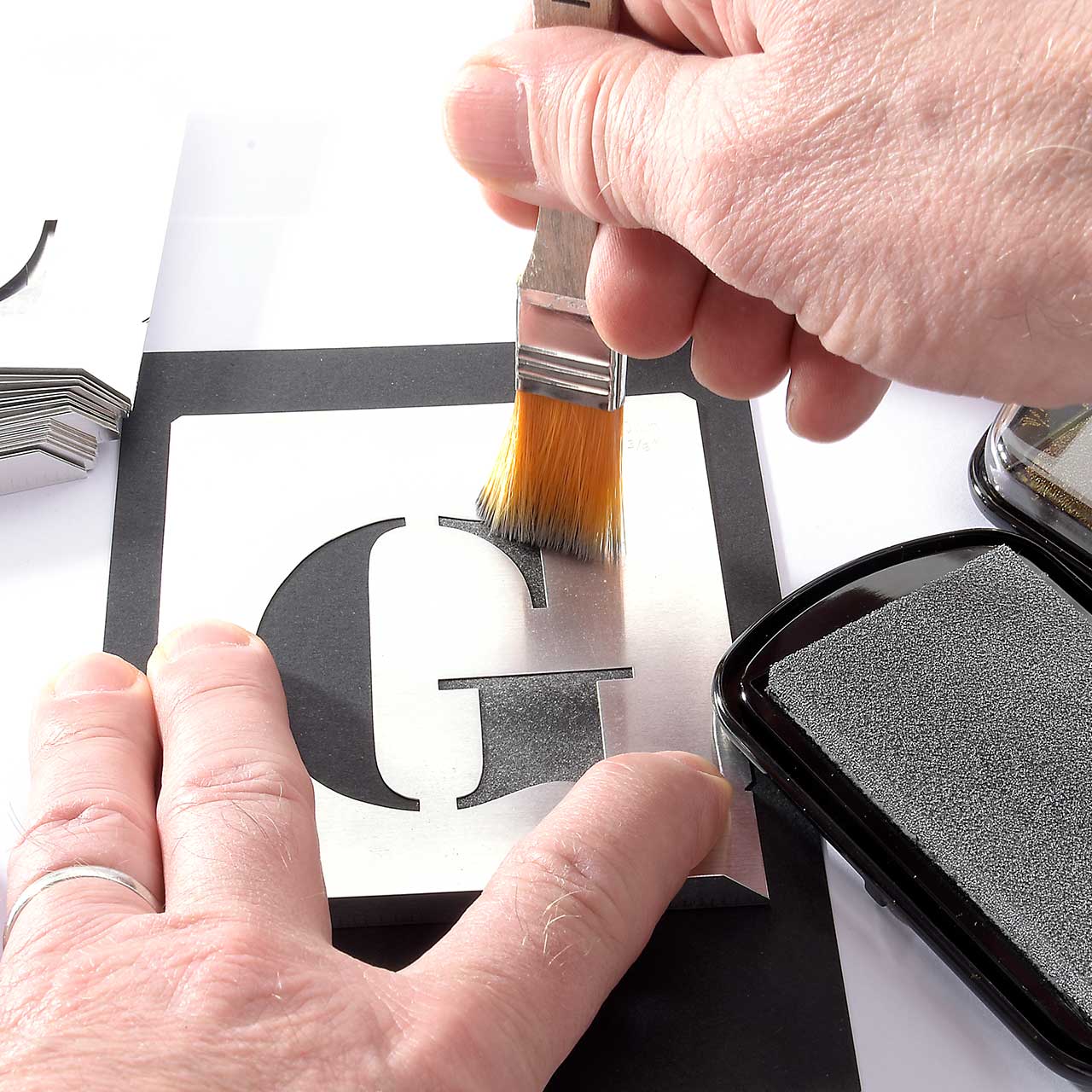 Legen Sie die „G“ Schablone* in die Mitte Ihrer Karte und tupfen Sie mit dem Pinsel Farbe aus dem silbernen Pigment-Stempelkissen* auf.