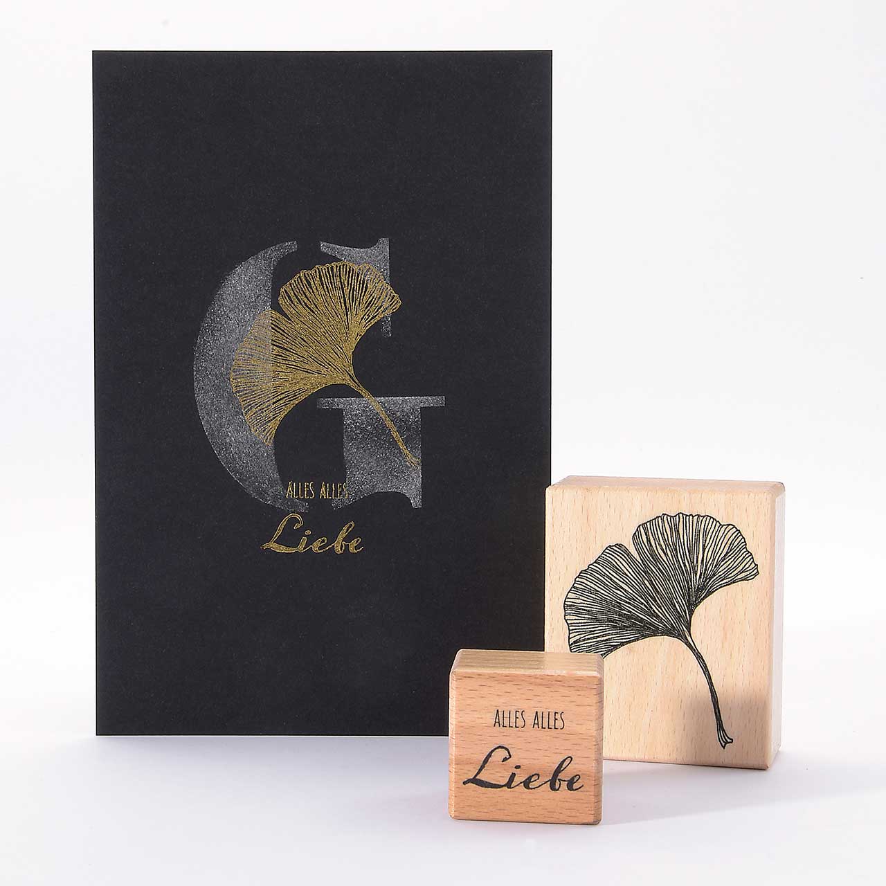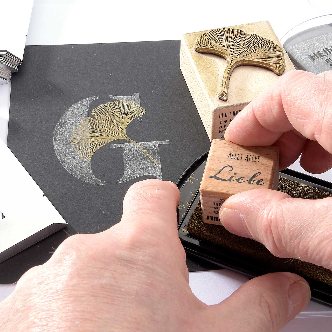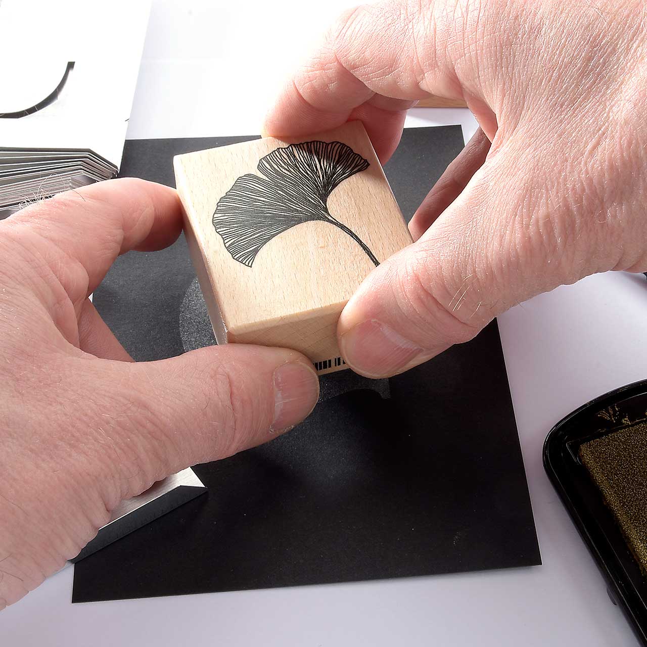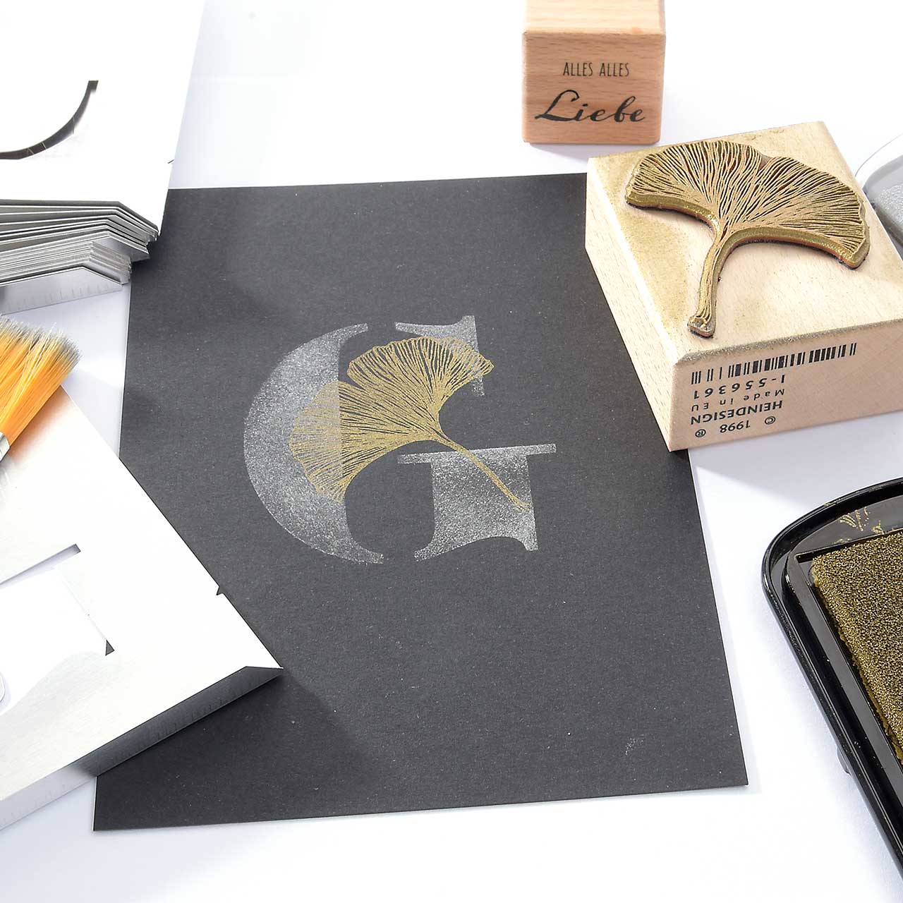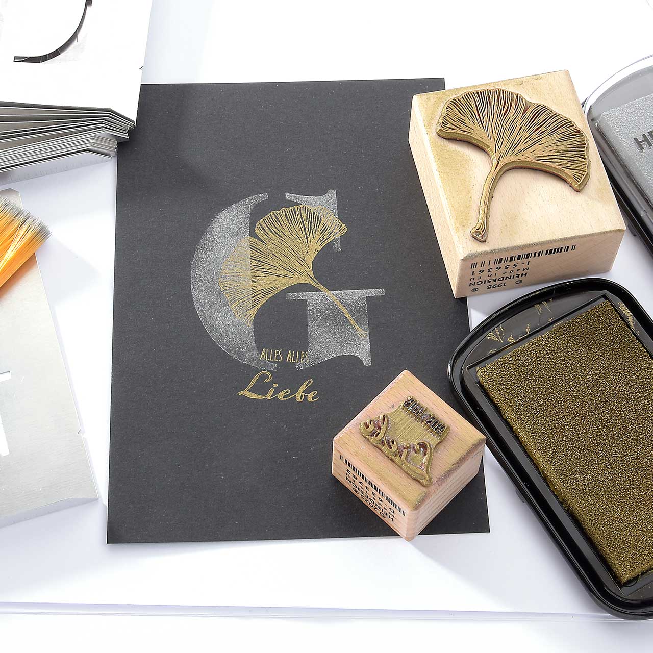 Nehmen Sie die Schablone weg und stempeln Sie das Ginkgo Motiv mit dem goldenen Pigment-Stempelkissen* in die Mitte ihrer Karte.