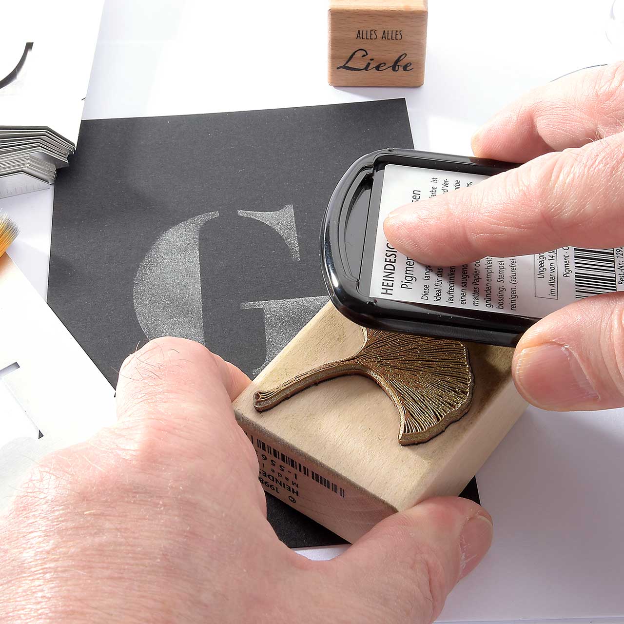 * Die metallischen Pigment-Stempelkissen sehen auf dem schwarzen Karton echt toll aus, brauchen aber relativ lang zum Trocknen.