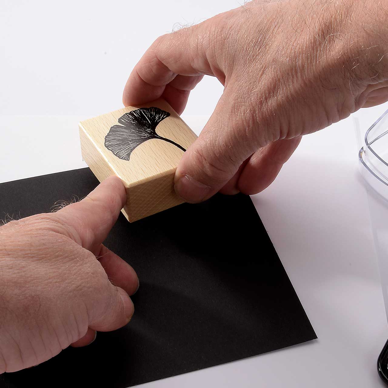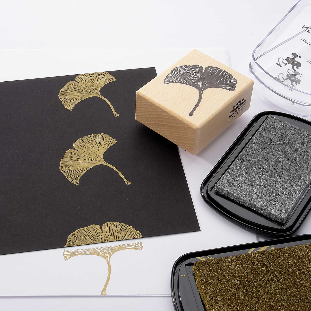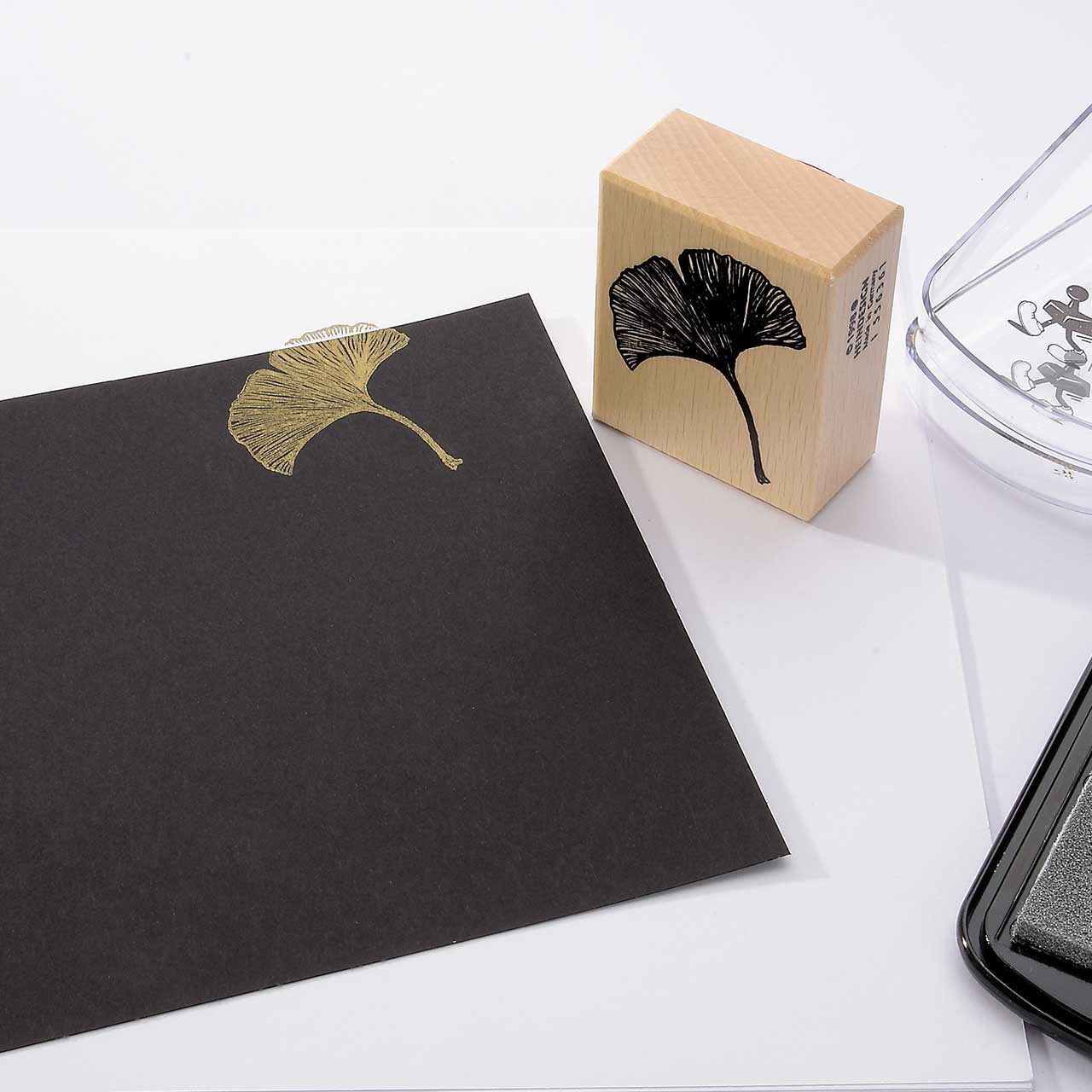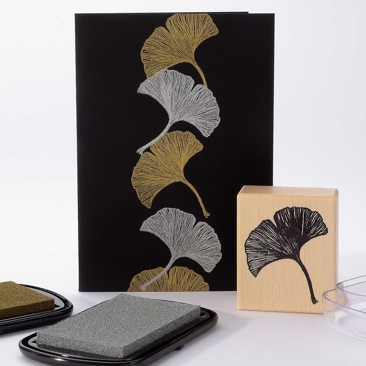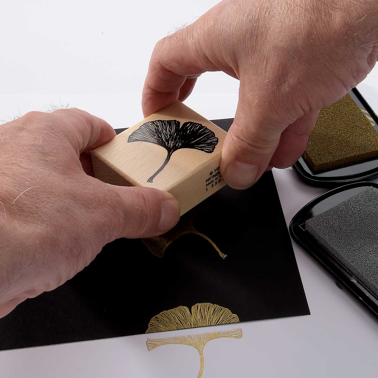 Stempeln Sie das Ginkgo Motiv mit dem goldenen Stempelkissen dreimal untereinander auf Ihre Karte. Lassen Sie zwischen den Motiven genügend Abstand für weitere Abdrucke. Für ein gleichmäßiges Druckbild färben Sie den Stempel vor jedem Abdruck erneut ein.