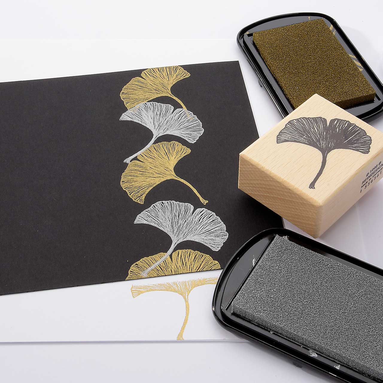 Stempeln Sie das Ginkgo Motiv mit dem silbernen Stempelkissen zweimal jeweils zwischen die goldenen Ginkgo Motive. Für ein gleichmäßiges Druckbild färben Sie den Stempel vor jedem Abdruck erneut ein.