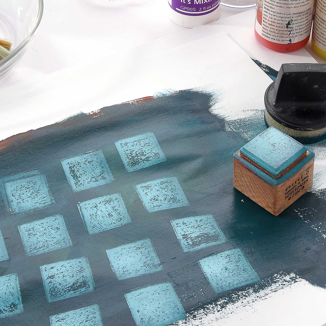 Streichen Sie den Pinsel auf einem Stück Schmierpapier aus und geben Sie weiße Acrylfarbe hinzu. Nehmen Sie die Farbe mit einem Farbtupfer Schwämmchen auf und färben Sie den kleinen Qudratflächen Stempel ein. Stempeln Sie das Motiv mehrmals auf Ihr Blatt. Für ein gleichmäßiges Druckbild färben Sie den Stempel vor jedem Abdruck erneut ein. Reinigen Sie den Stempel und das Schwämmchen mit reichlich Wasser.