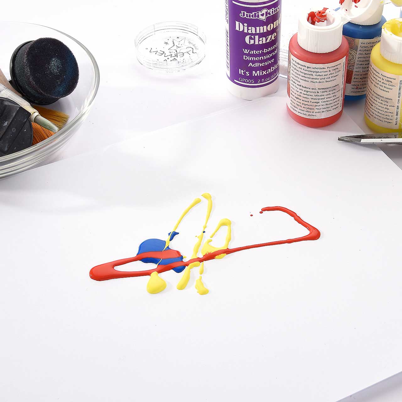 Geben Sie Blaue, Gelbe und Rote Acrylfarbe auf Ihr Kopierpapier und vermalen Sie die Farbe mit einem Pinsel.