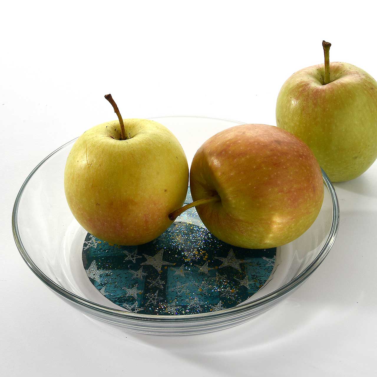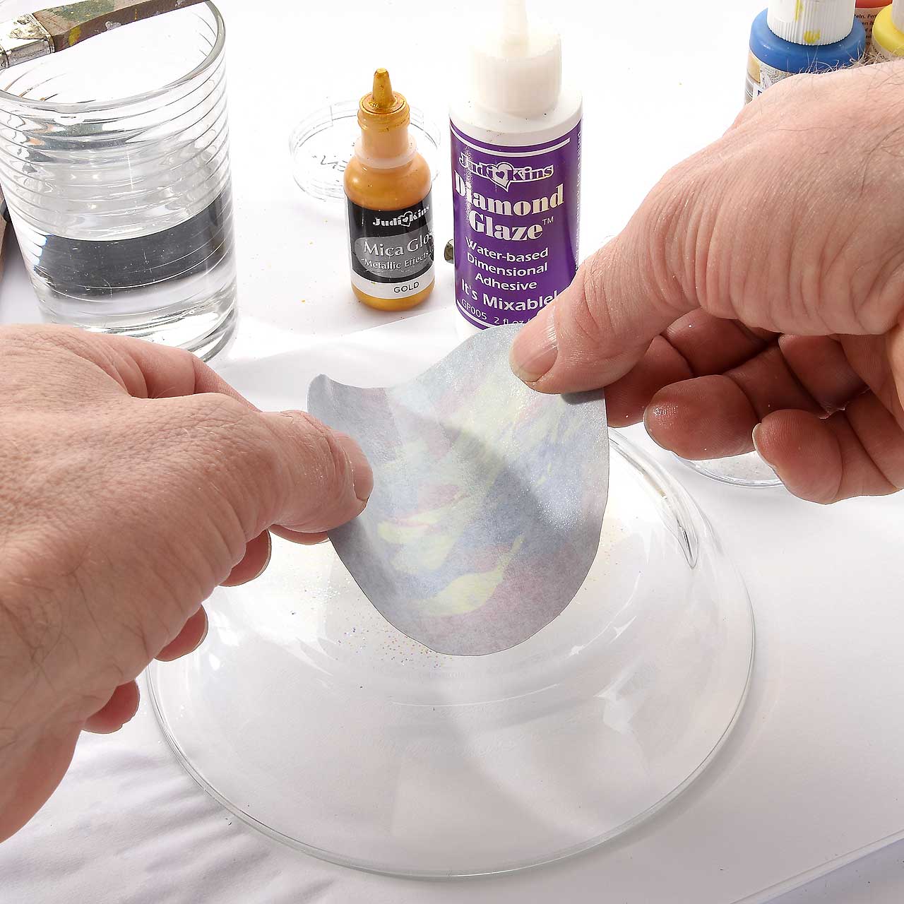 Benetzen Sie Ihren Papierkreis von beiden Seiten mit einem nassen Pinsel. Lassen Sie das Papier einen Moment einweichen. Dann legen Sie es vorsichtig auf die Diamond Glaze Schicht. Luftblasen kann man nur sehr schwer entfernen, darum biegen Sie das Papier ein wenig und legen es vorsichtig von der Mitte nach außen auf das Diamond Glaze. Das Diamond Glaze trocknen recht langsam, darum haben Sie genügend Zeit um den Papierkreis an die richtige Stelle zu schieben. Lassen Sie das Glasschälchen über Nacht trocknen.