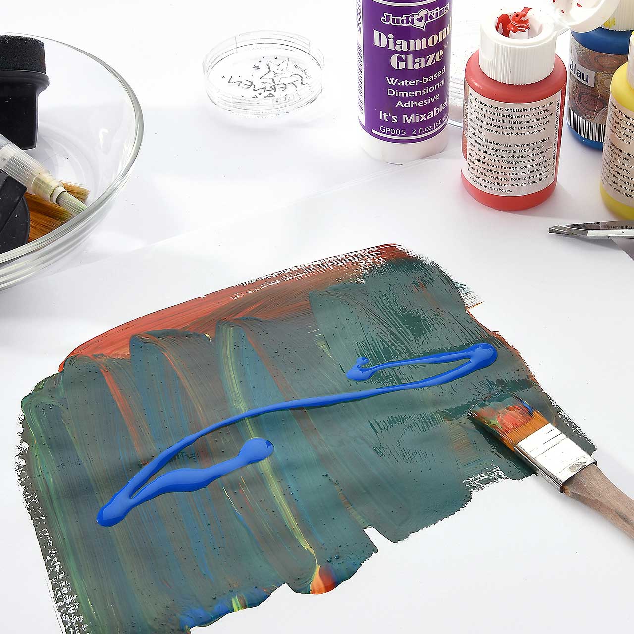 Erscheint der Farbton bräunlich grün, geben Sie noch etwas blaue Acrylfarbe hinzu.
