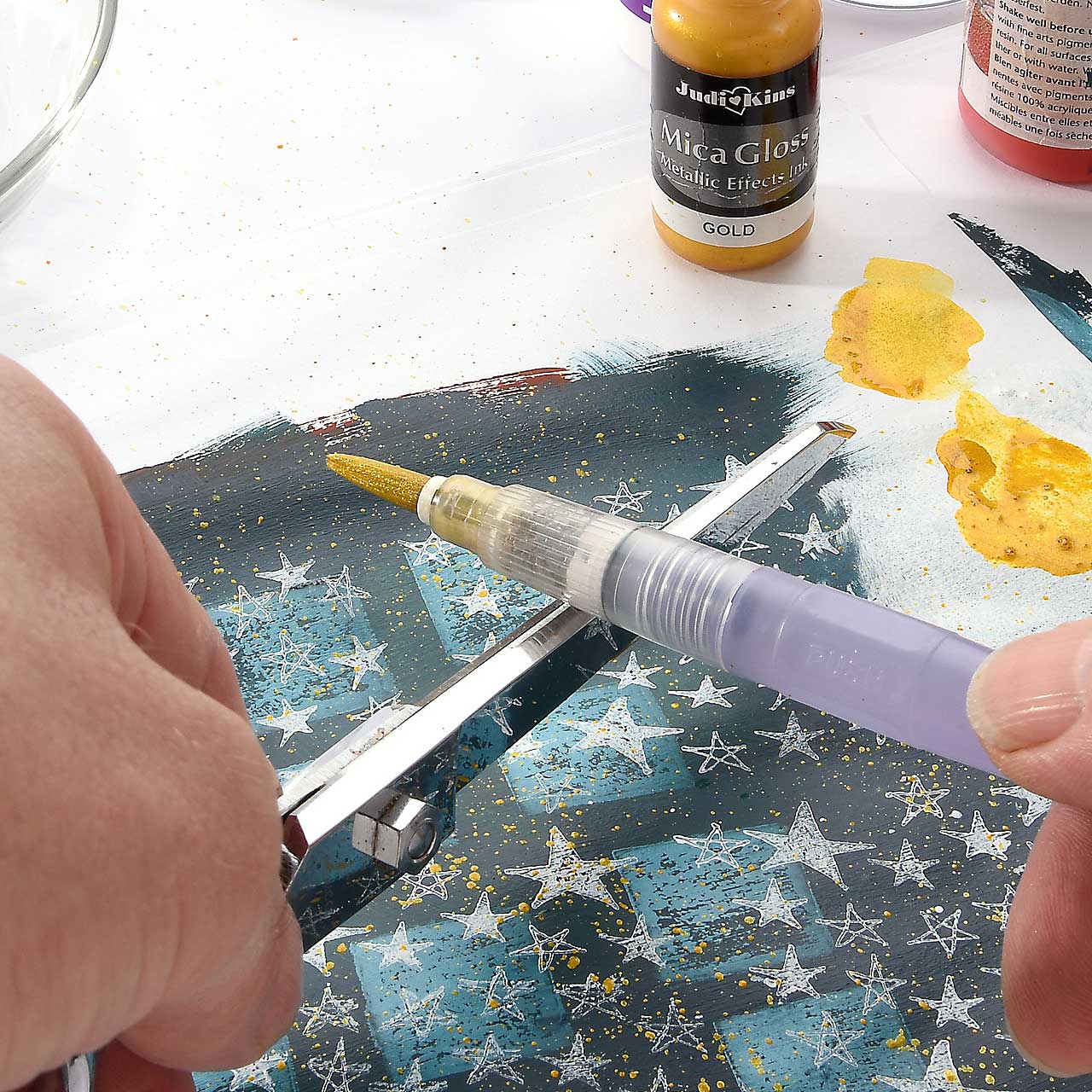 Klecksen Sie mit dem Füller Pinsel und der Mica Gloss Farbe einige goldene Sprenkel auf Ihr Blatt. Lassen Sie die Farbe gut trocknen.