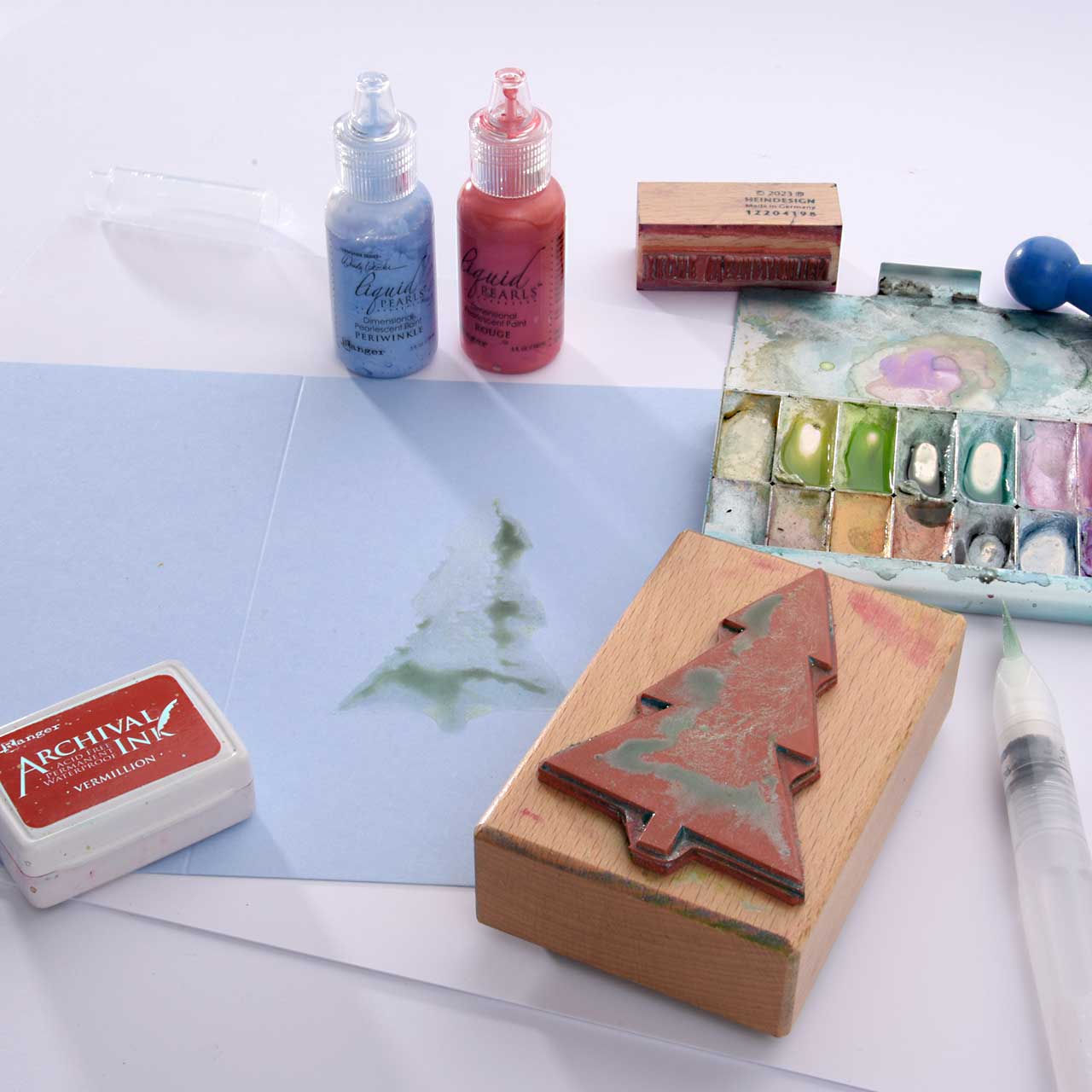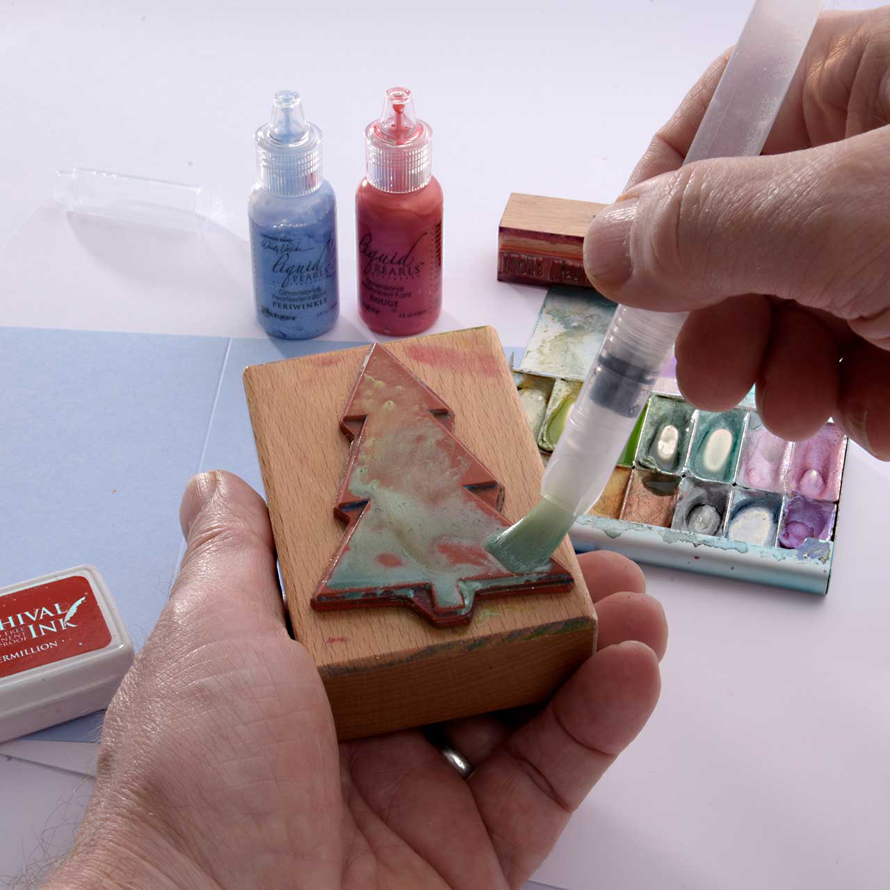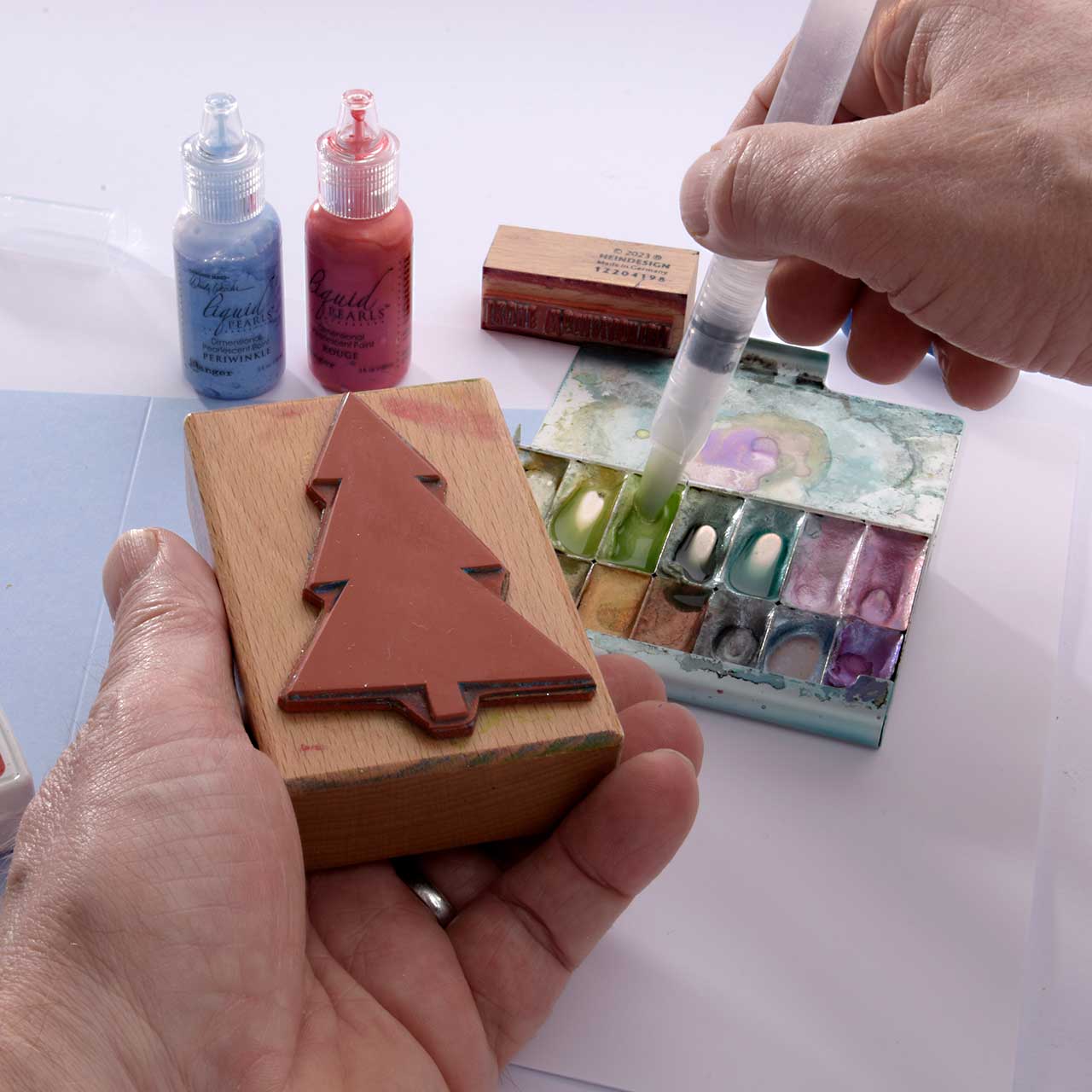 Nehmen Sie mit dem nassen Pinsel metallische Aquarellfarbe aus dem Malkasten auf und färben Sie den Tannenbaum Flächenstempel ein. Wählen Sie hierfür drei Grüntöne, hell, mittel, dunkel.