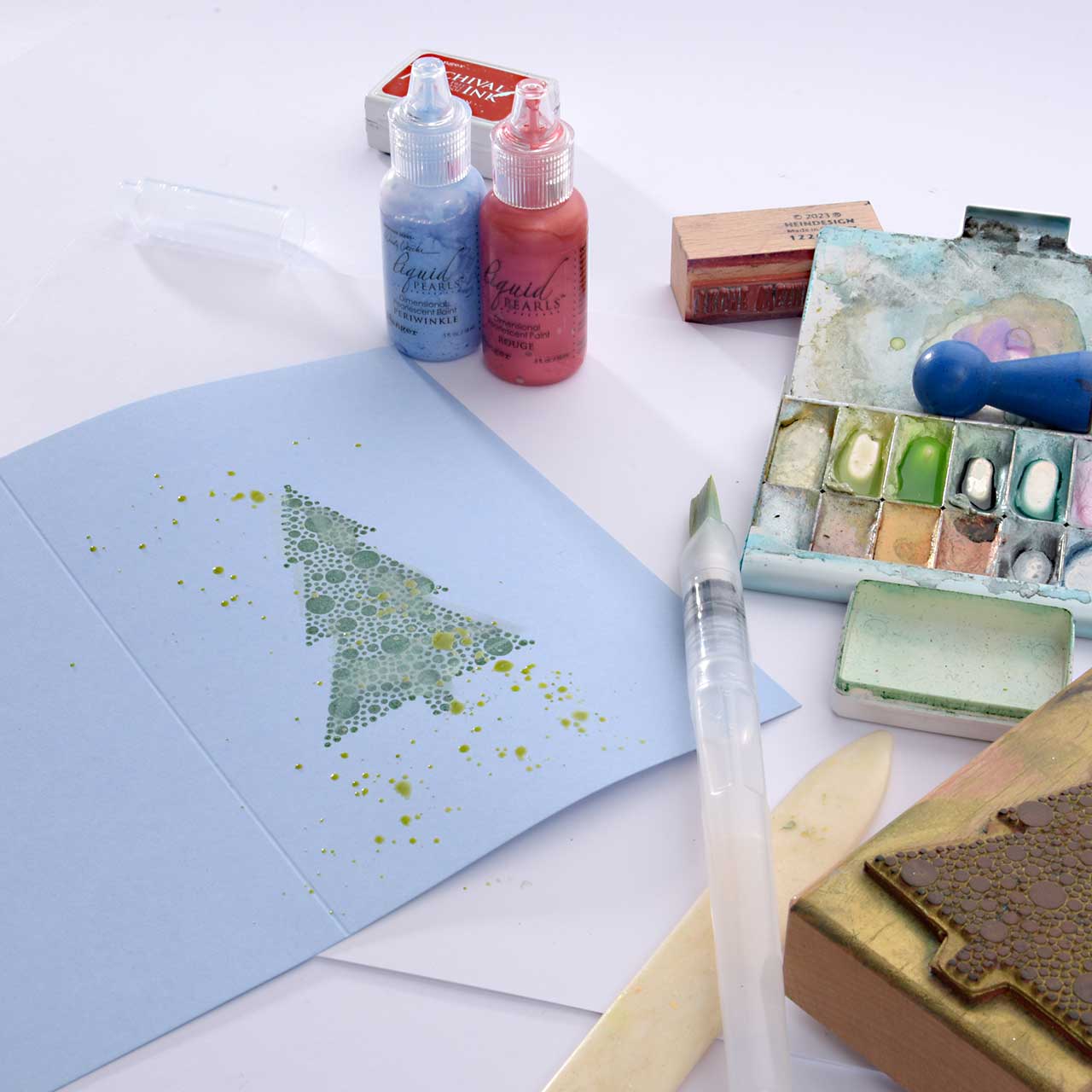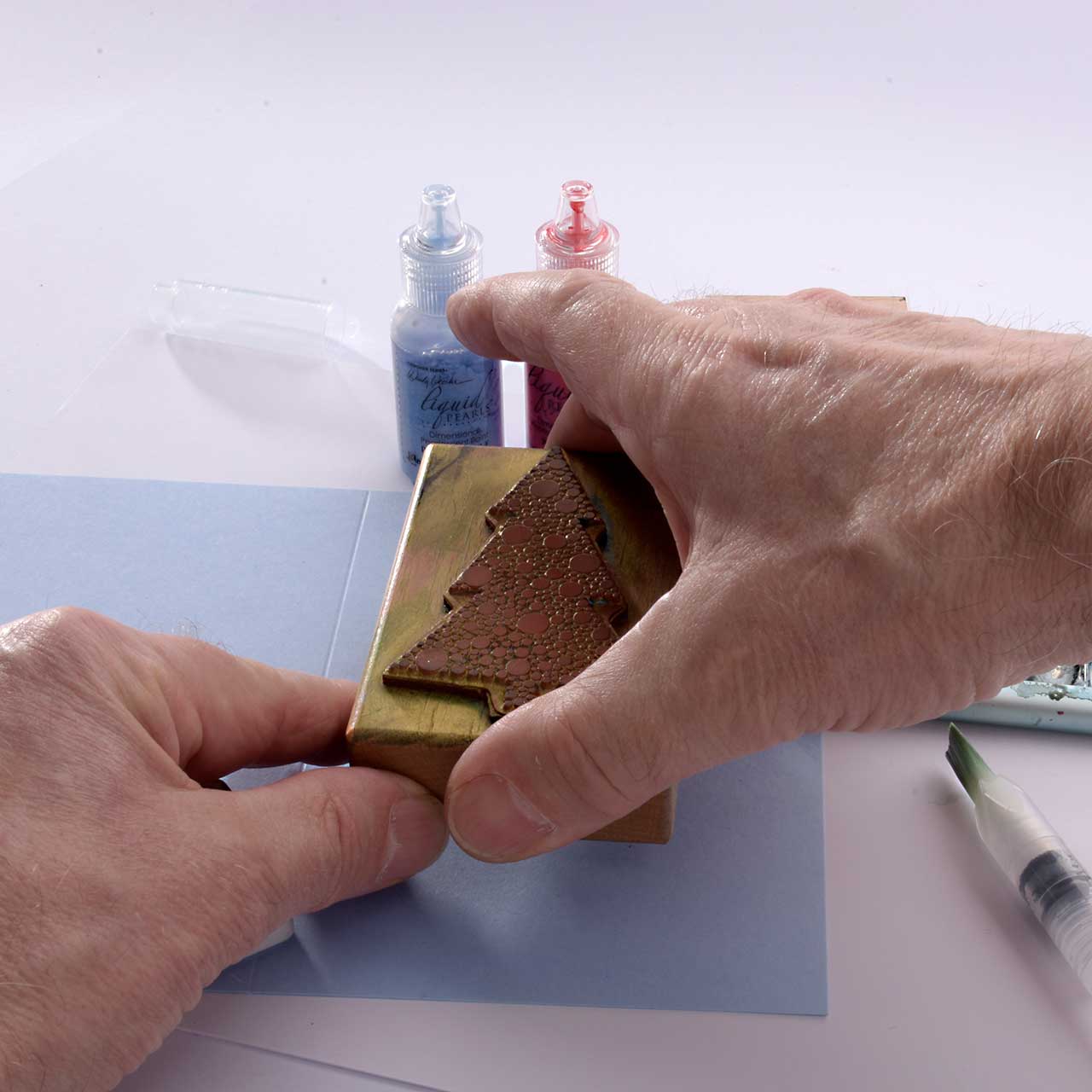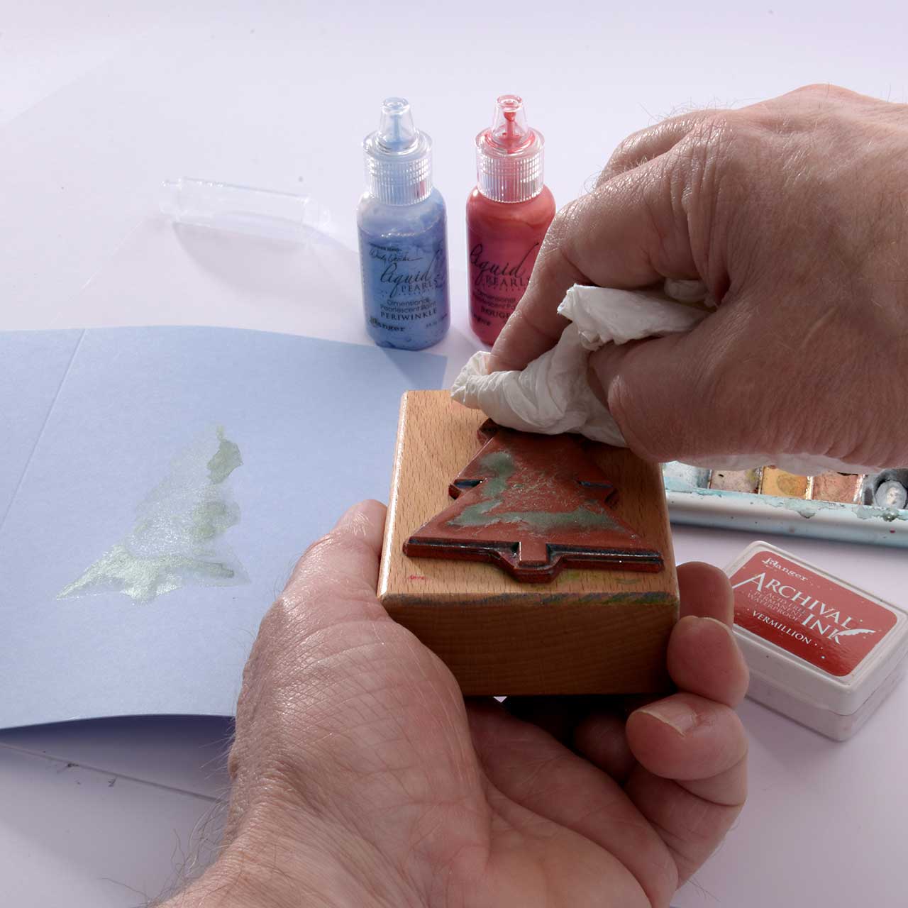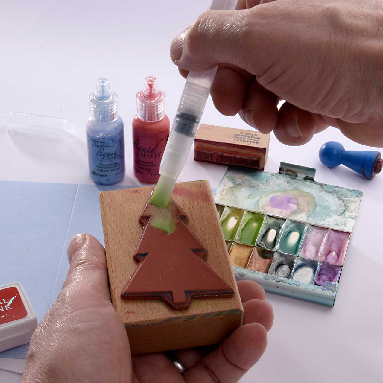 Nehmen Sie mit dem nassen Pinsel metallische Aquarellfarbe aus dem Malkasten auf und färben Sie den Tannenbaum Flächenstempel ein. Wählen Sie hierfür drei Grüntöne, hell, mittel, dunkel.