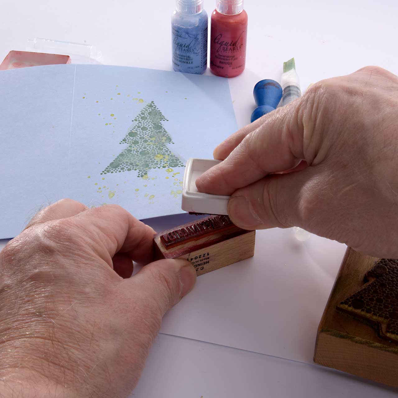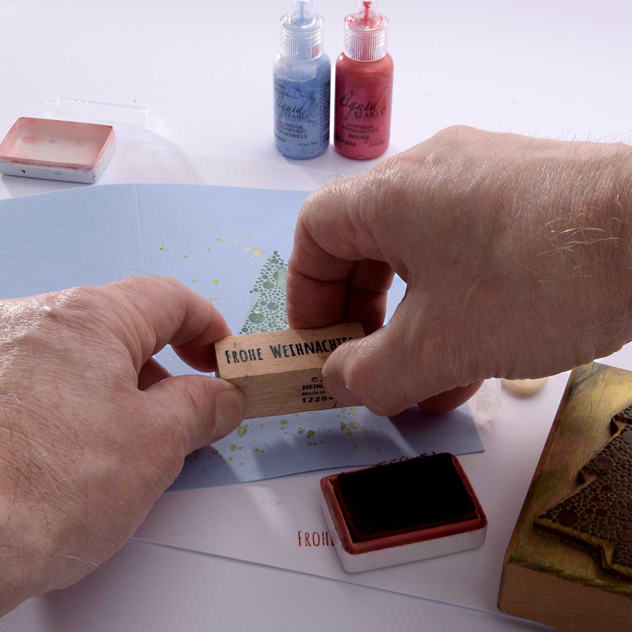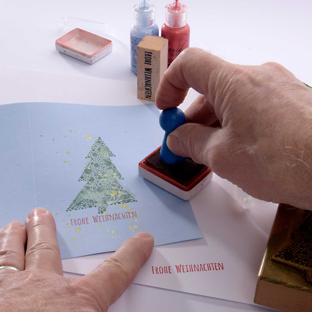 Stempeln Sie das „Frohe Weihnachten“ Textmotiv mit dem roten Stempelkissen unter das Tannenbaum Motiv.
