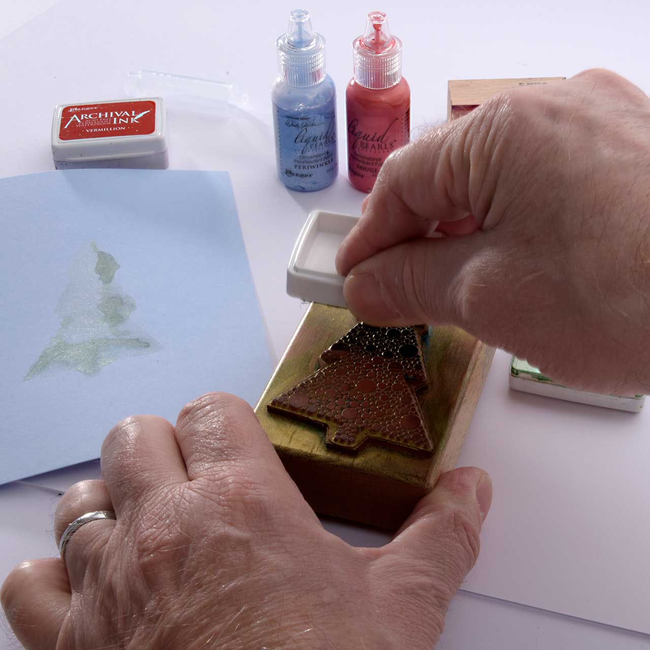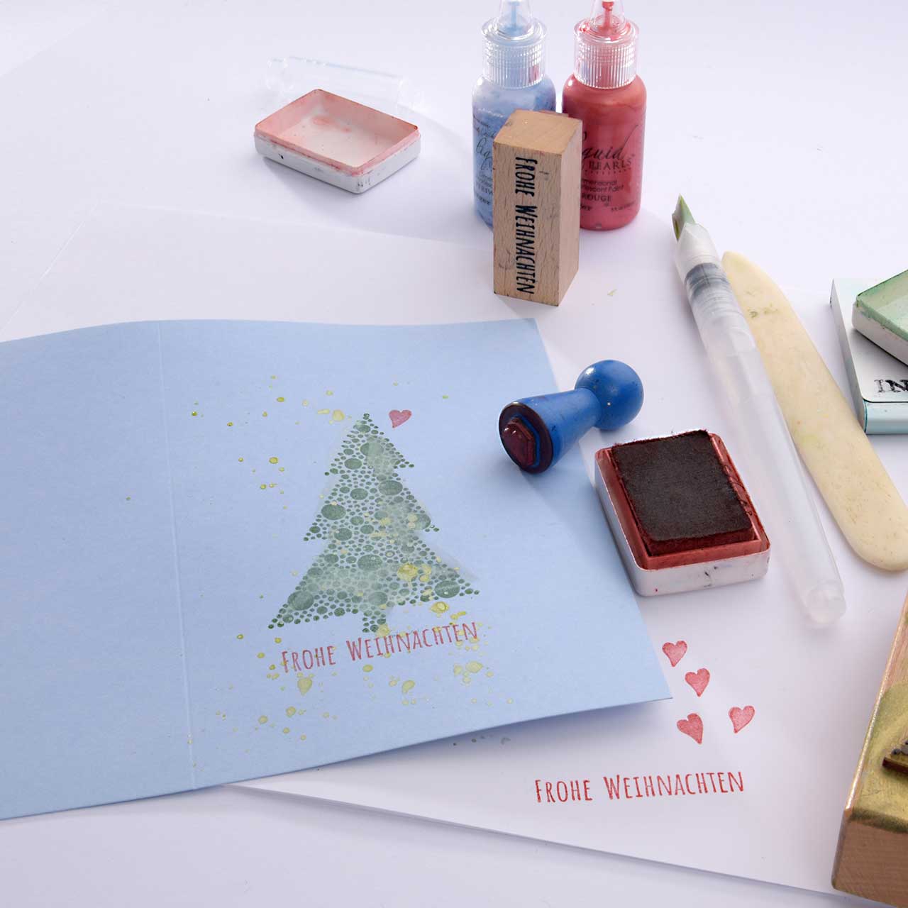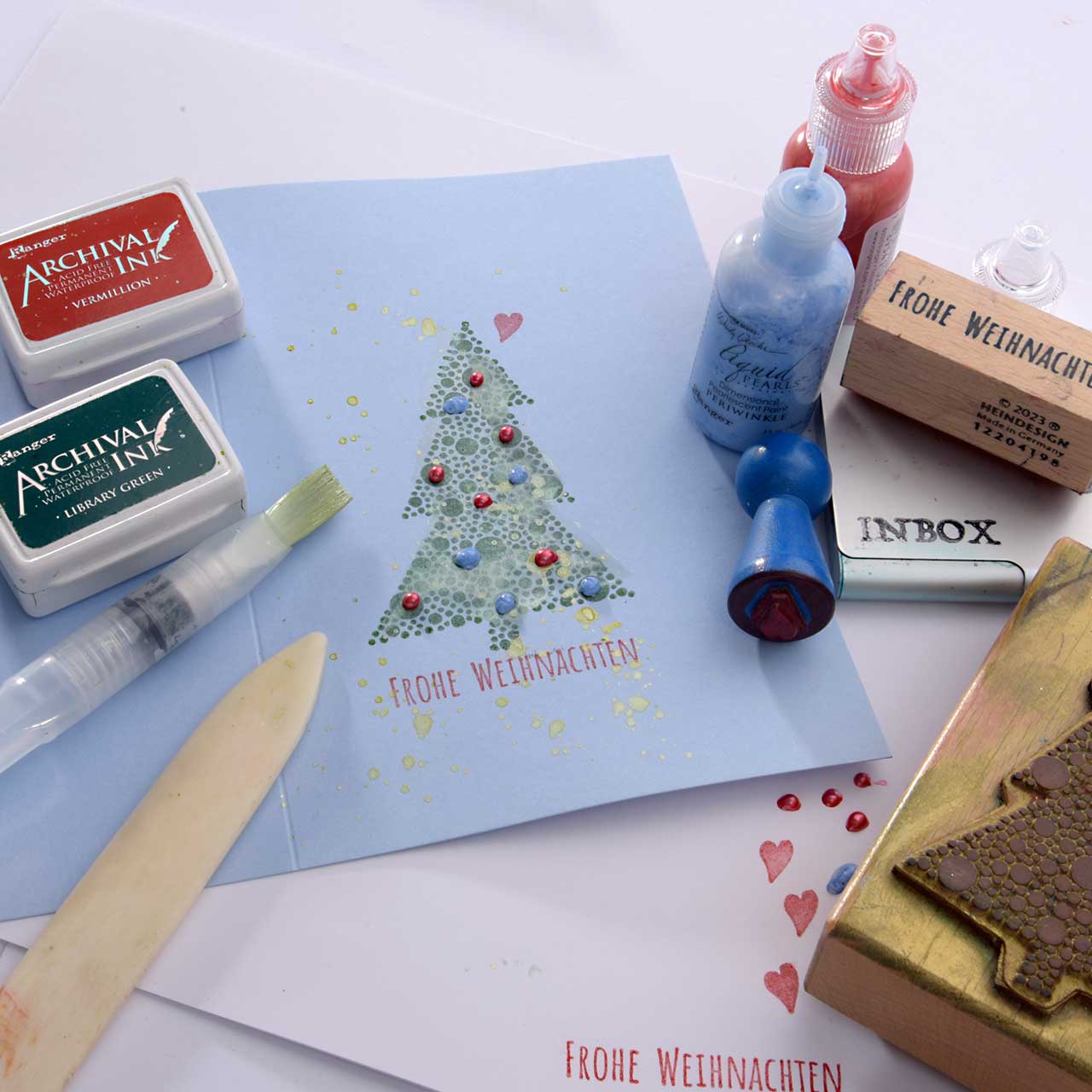 Stempeln Sie das „Frohe Weihnachten“ Textmotiv mit dem roten Stempelkissen unter das Tannenbaum Motiv.