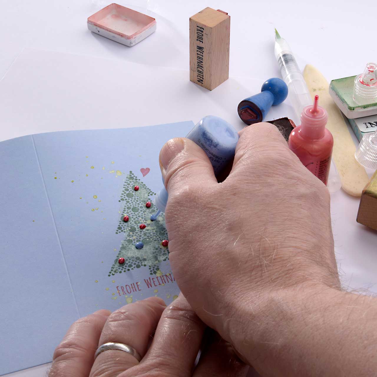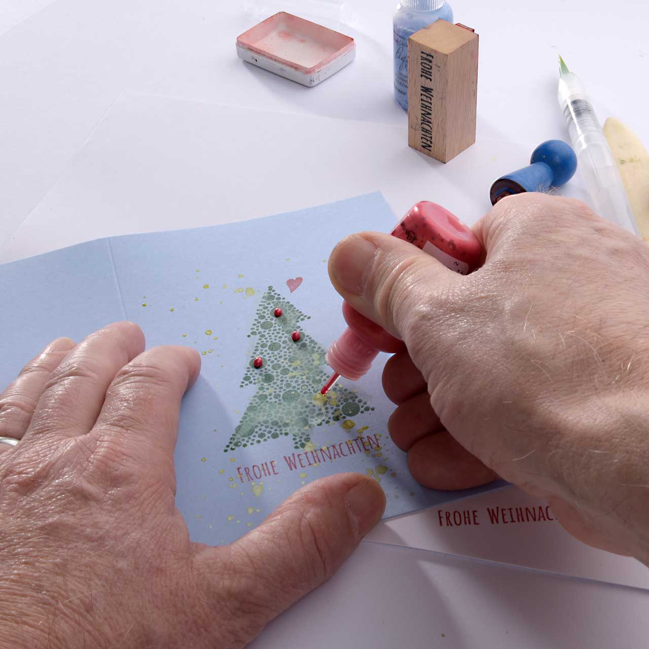Fügen Sie dem Motiv mit den Liquid Pearls* noch rote und blaue Christbaumkugeln hinzu.