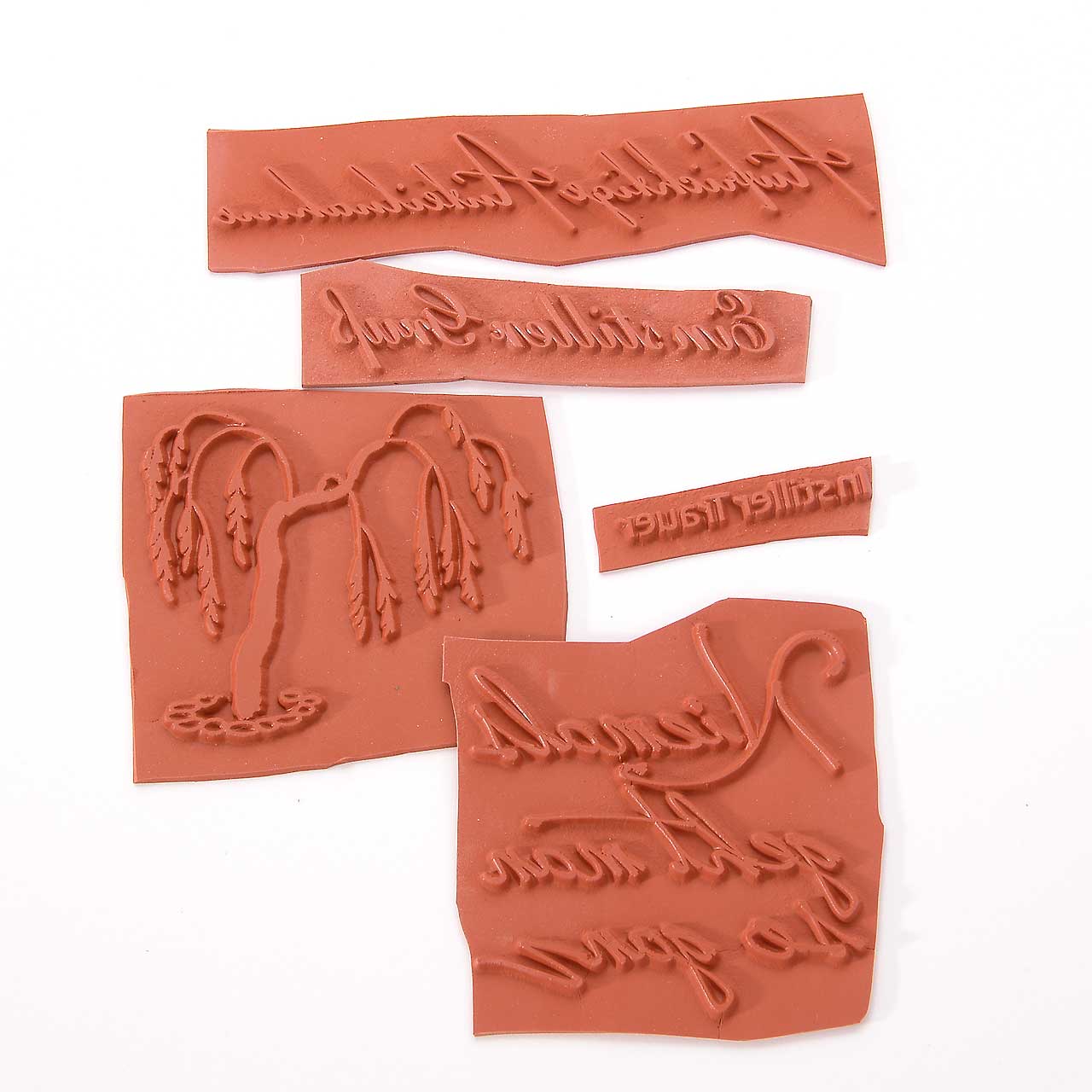 Vulkanisierte Stempelgummis mit einem tiefen Relief für die Selbst-Montage auf Handgriffe aus Holz oder Kunststoff.