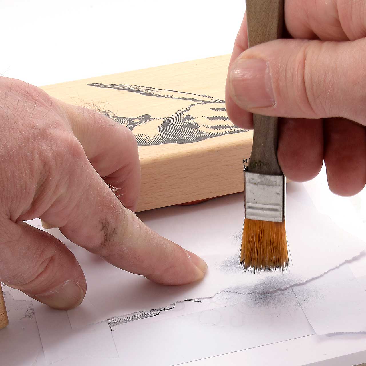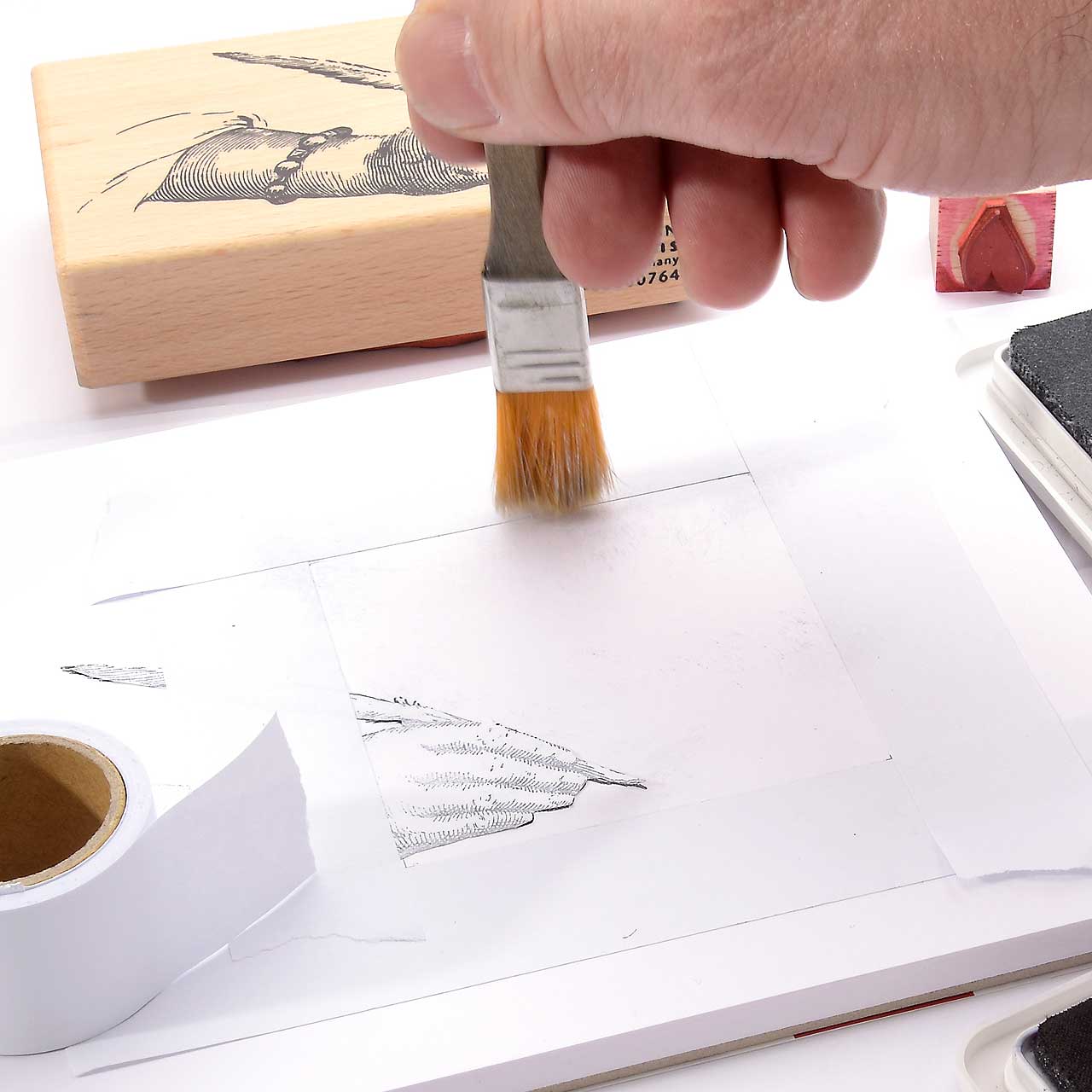 Reißen Sie ein Stück Kopierpapier ab und decken Sie den oberen Teil Ihrer Karte ab. Tupfen Sie mit dem Pinsel Farbe aus dem schwarzen Stempelkissen auf den freigebliebenen teil des Quadrates auf.