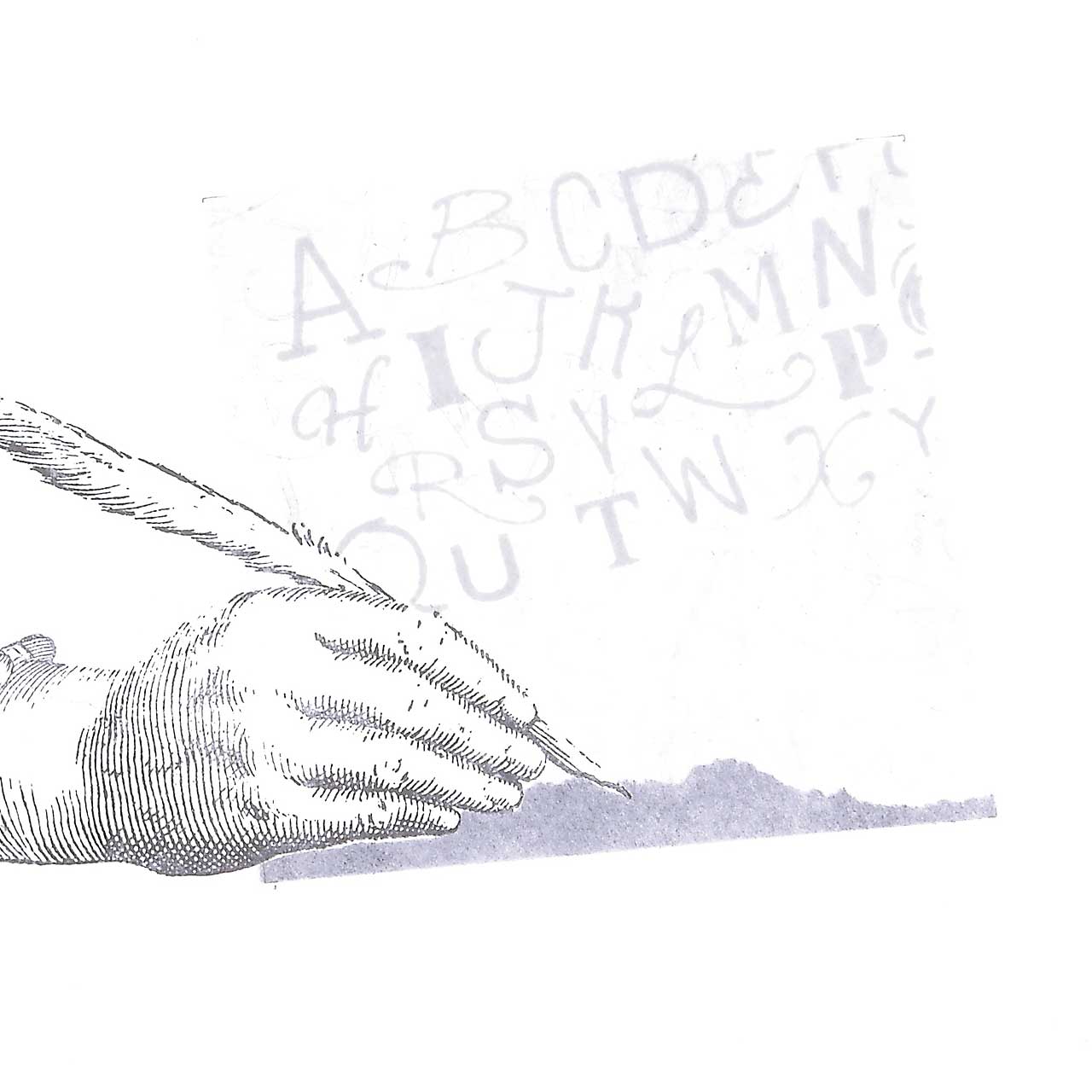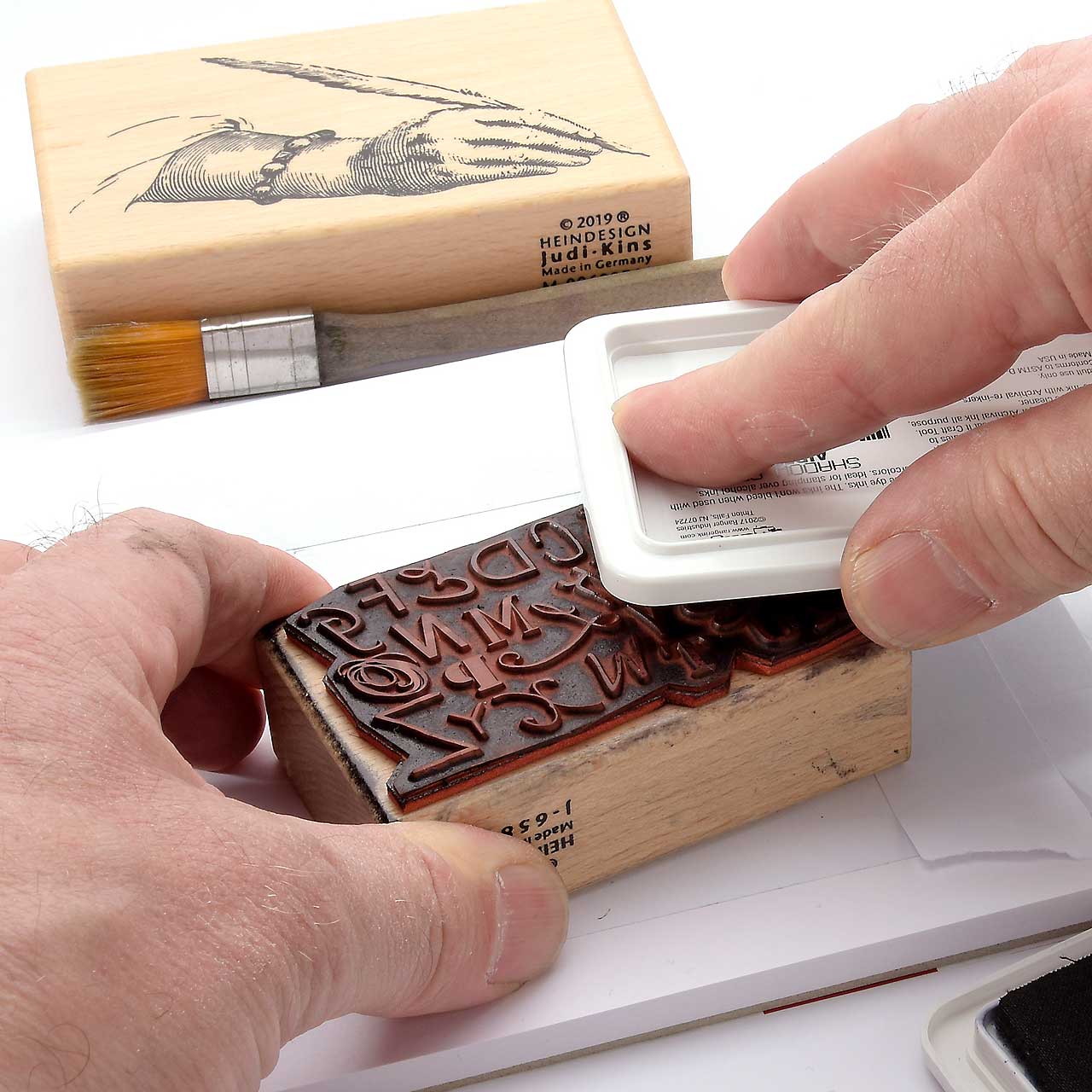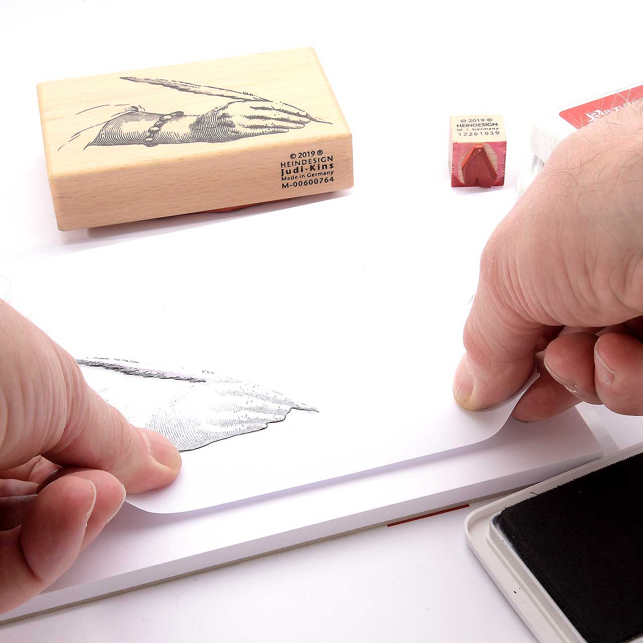 Stempeln Sie das Schreibende Hand Motiv mit dem schwarzen Stempelkissen so auf Ihre Karte, dass die Spitze der Schreibfeder in die untere Mitte des angezeichneten Quadrates zeigt.