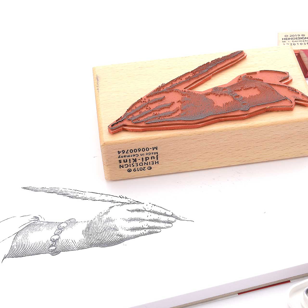 Stempeln Sie das Motiv ein zweites Mal auf ein Stück Kopierpapier und schneiden Sie es mit der Schere aus. Decken Sie mit dem ausgeschnitten Hand-Motiv das gestempelte Motiv ab (fixieren Sie die Abdeckung mit einem Stück Eclipse Papier gegen das Verrutschen).