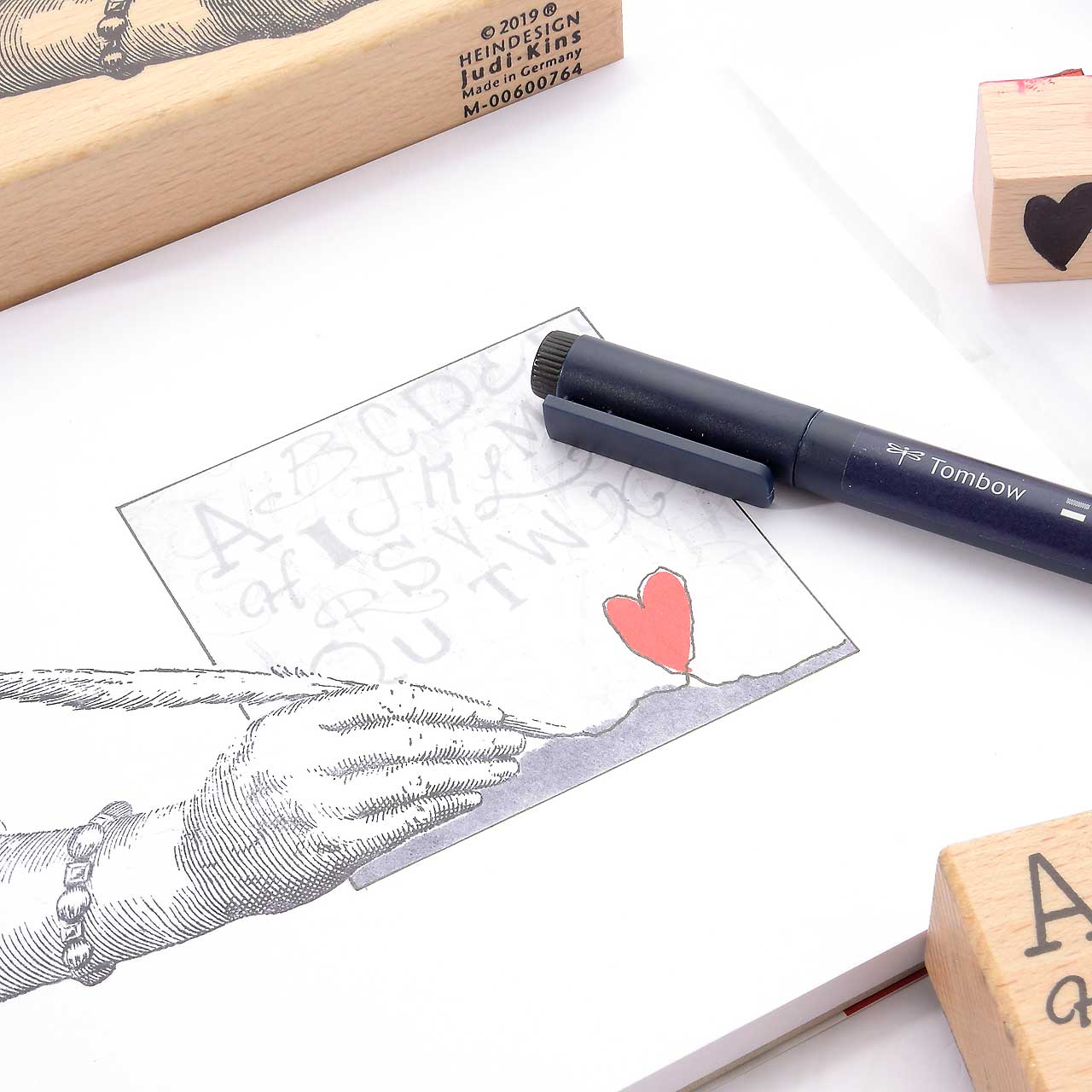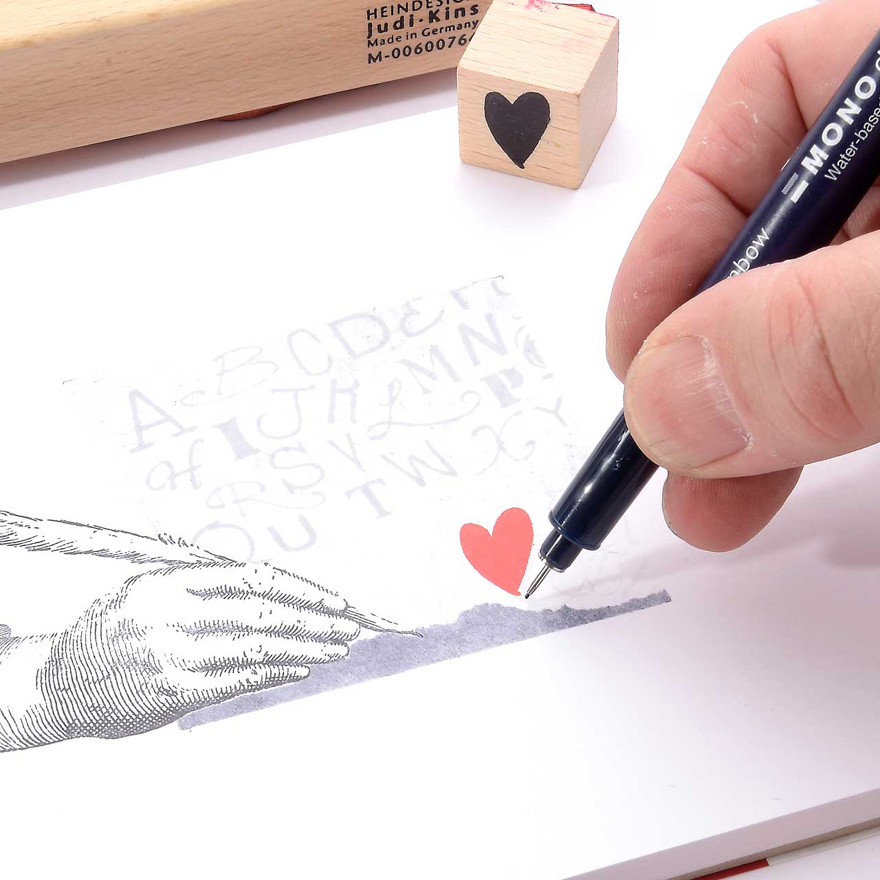 Ziehen Sie mit dem Tombow Fineliner eine dünne Linie, ausgehend von der Schreibfederspitze um das Herz zum Rand des Quadrates.