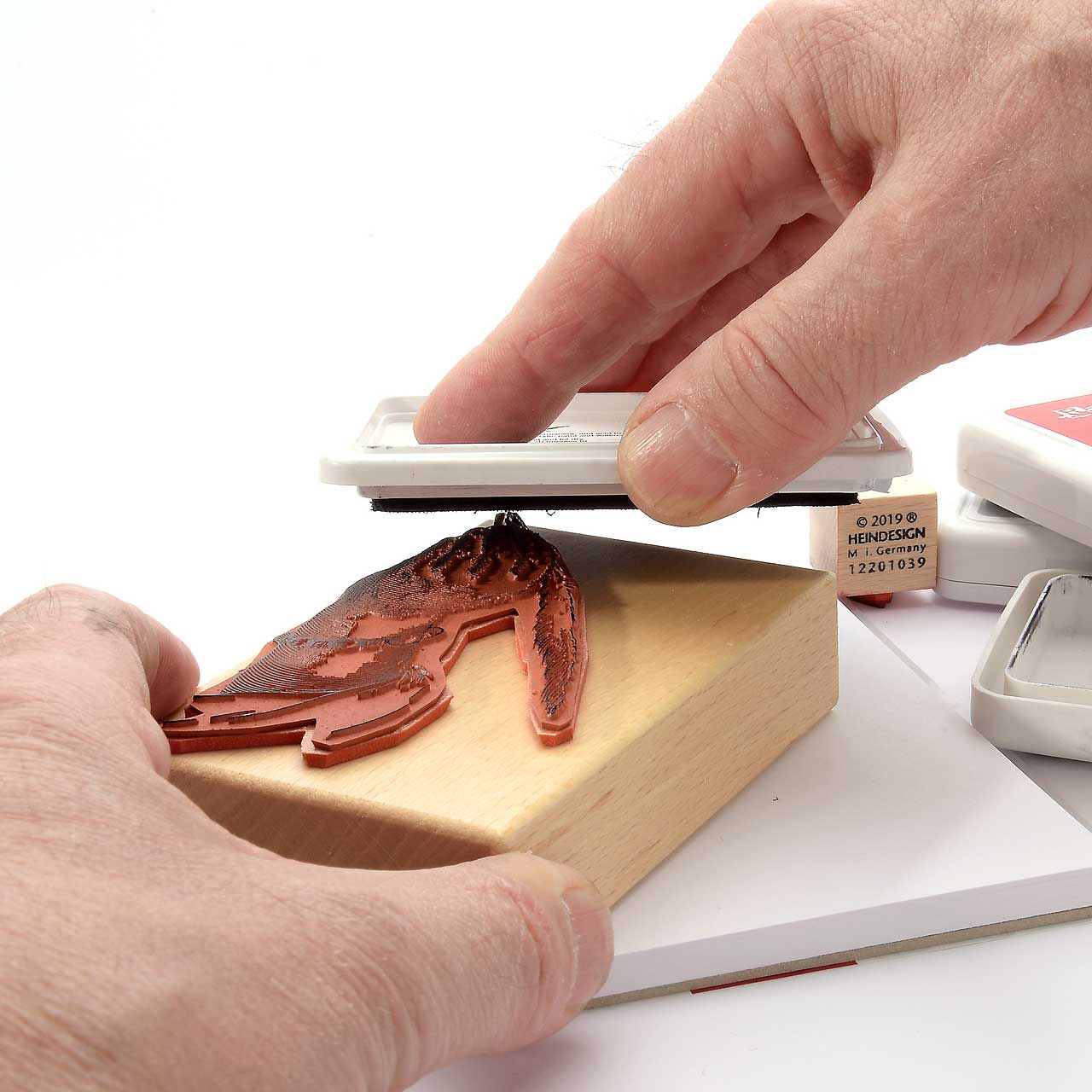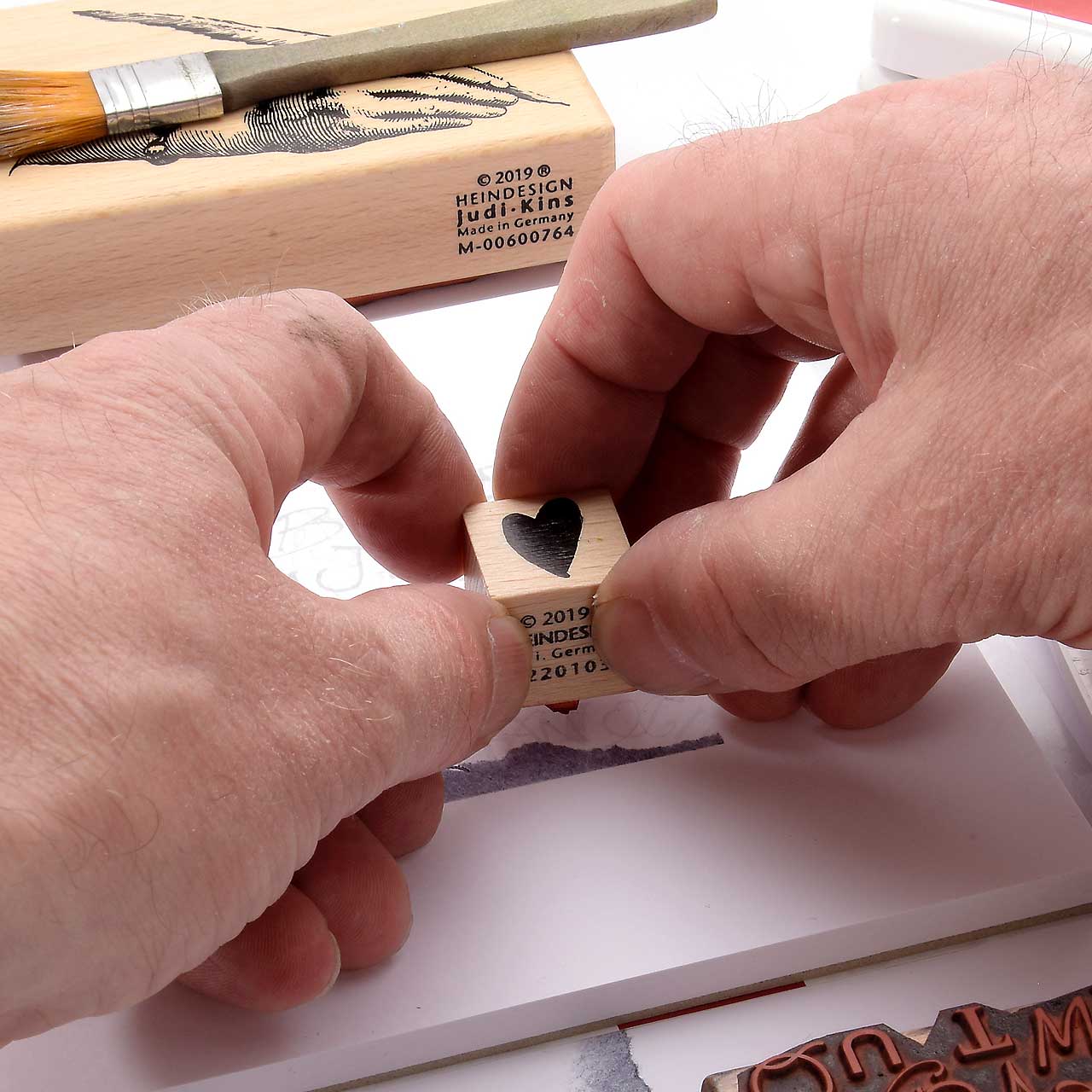 Stempeln Sie das Herz Motiv mit dem roten Stempelkissen in die rechte Ecke untere Hälfte ihres Quadrates.