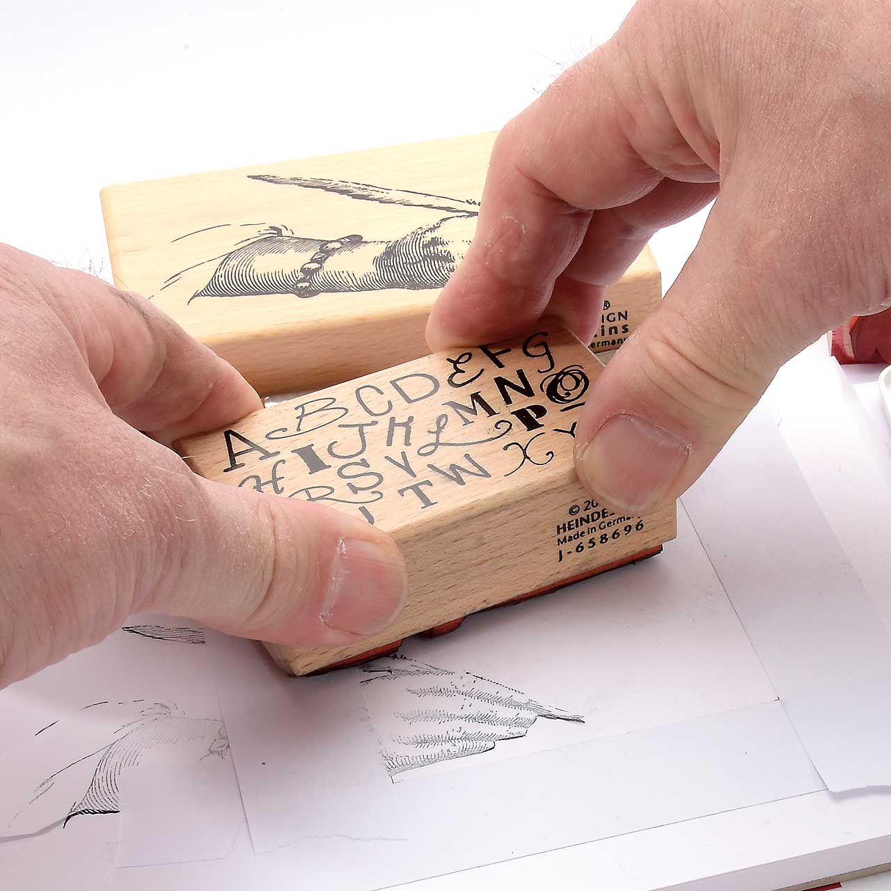 Stempeln Sie das Buchstaben Motiv mit dem grauen Stempelkissen mehrmals auf Ihr Quadrat. Nehmen Sie dabei nur einmal Farbe auf und stempeln Sie immer heller werdende Abdrucke.