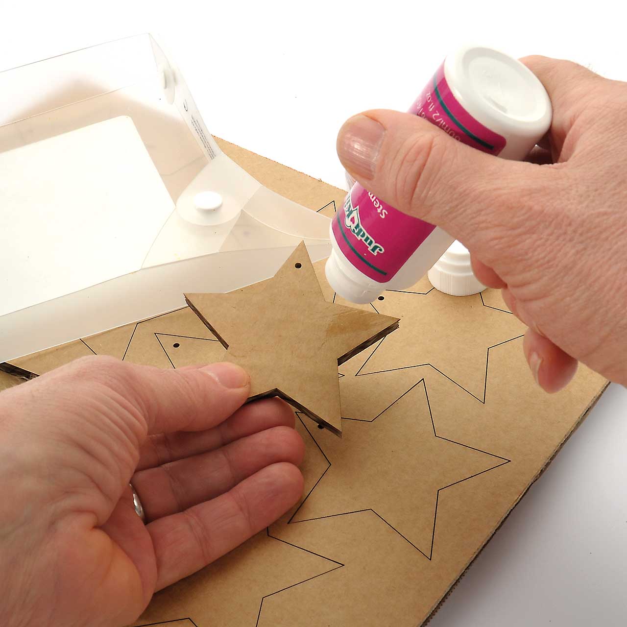 Kleben Sie den roten Stern mit je einem Stückchen Takki Klebeband auf das bestempelte Quadrat.