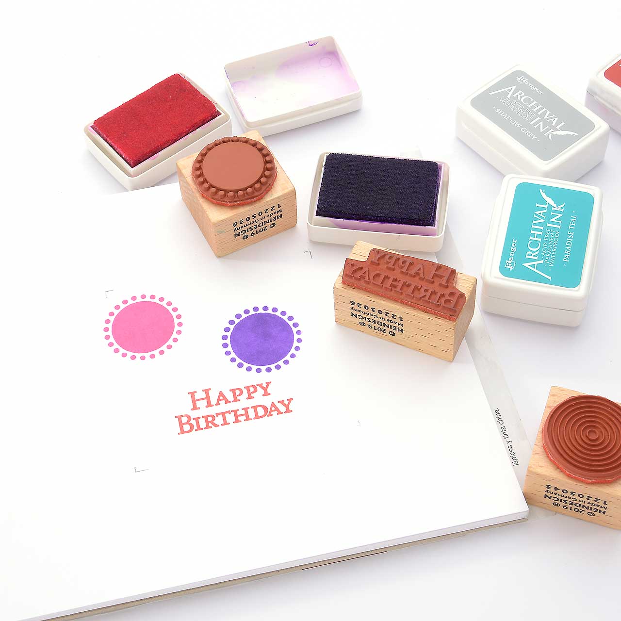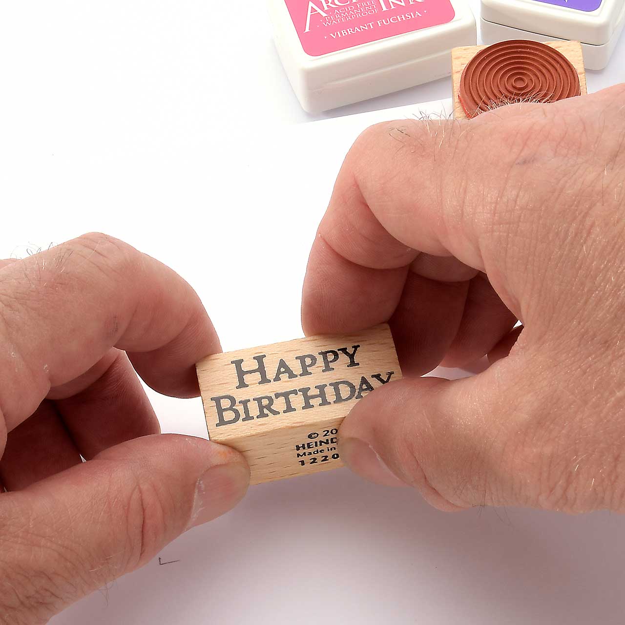Stempeln Sie das „Happy Birthday“-Textmotiv mit dem roten Stempelkissen in die untere Mitte des Quadrats.