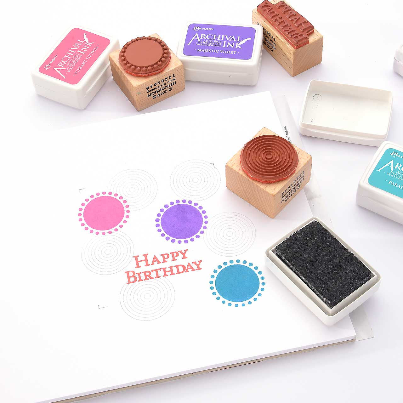 Stempeln Sie das Kreis mit Punkten Motiv mit den verschiedenen, farbigen Stempelkissen um das Textmotiv verteilt auf. Beginnen Sie mit der hellsten Farbe und reinigen Sie den Stempel vor jedem Wechsel der Farben.