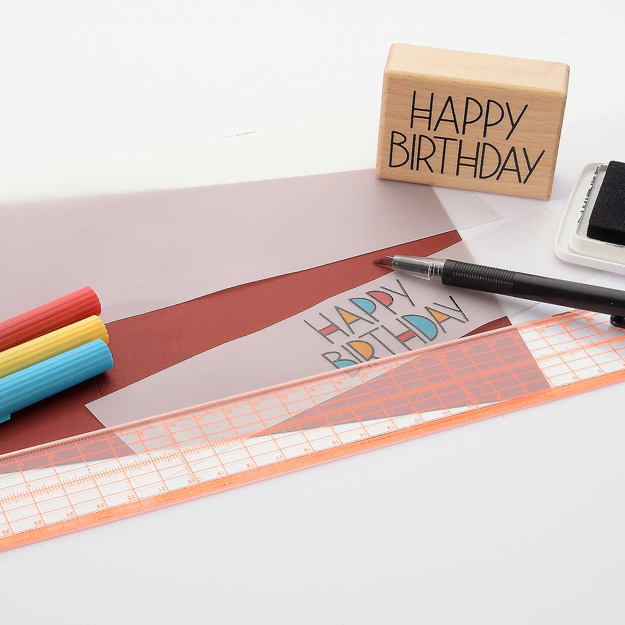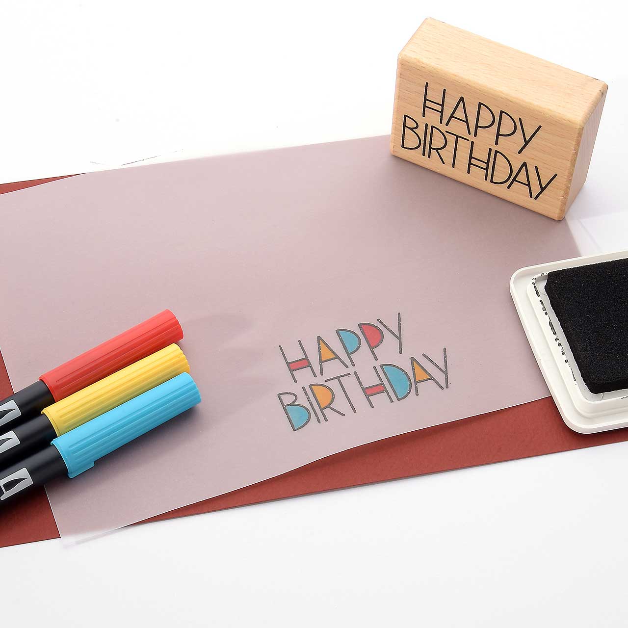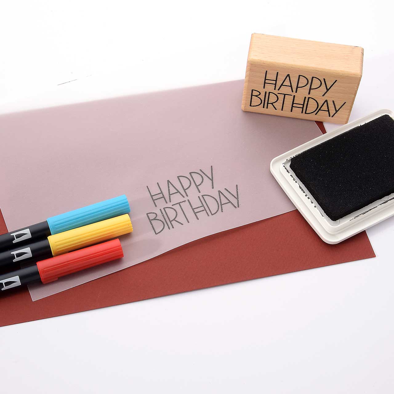 Stempeln und embossen Sie das „Happy Birthday“-Textmotiv mit dem schwarzen Sternenstaub auf ein Blatt Amadeo Transparentpapier.