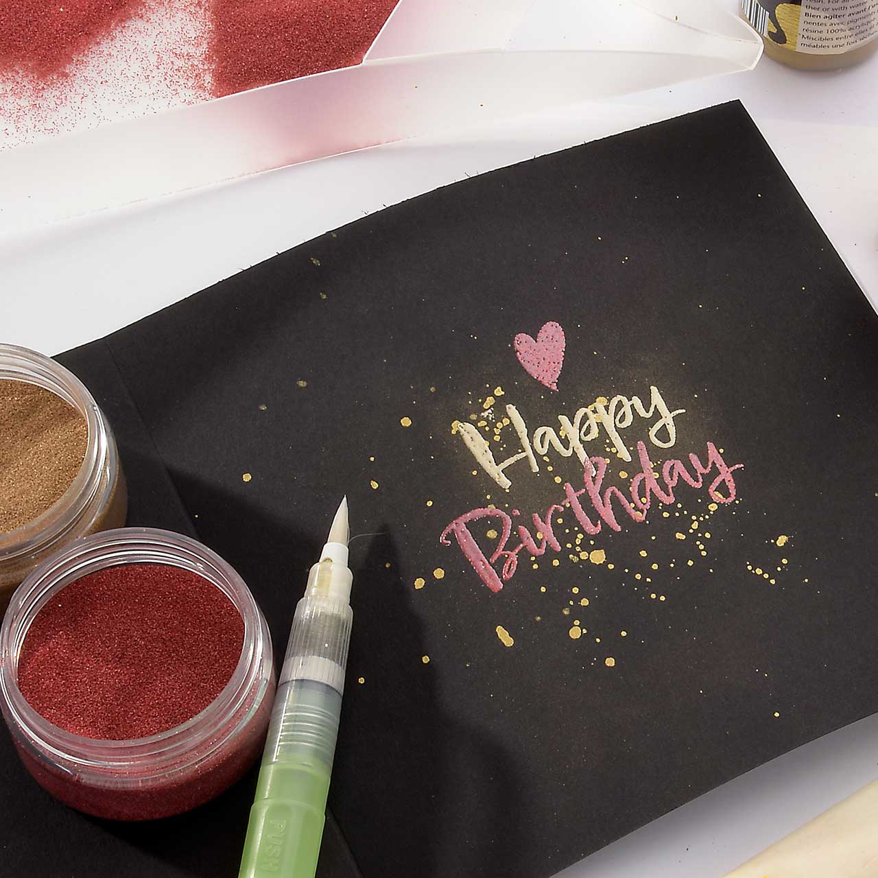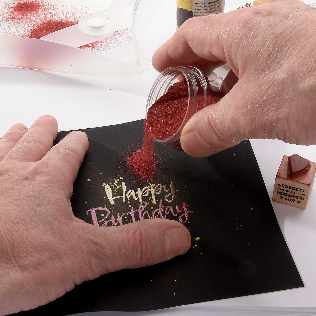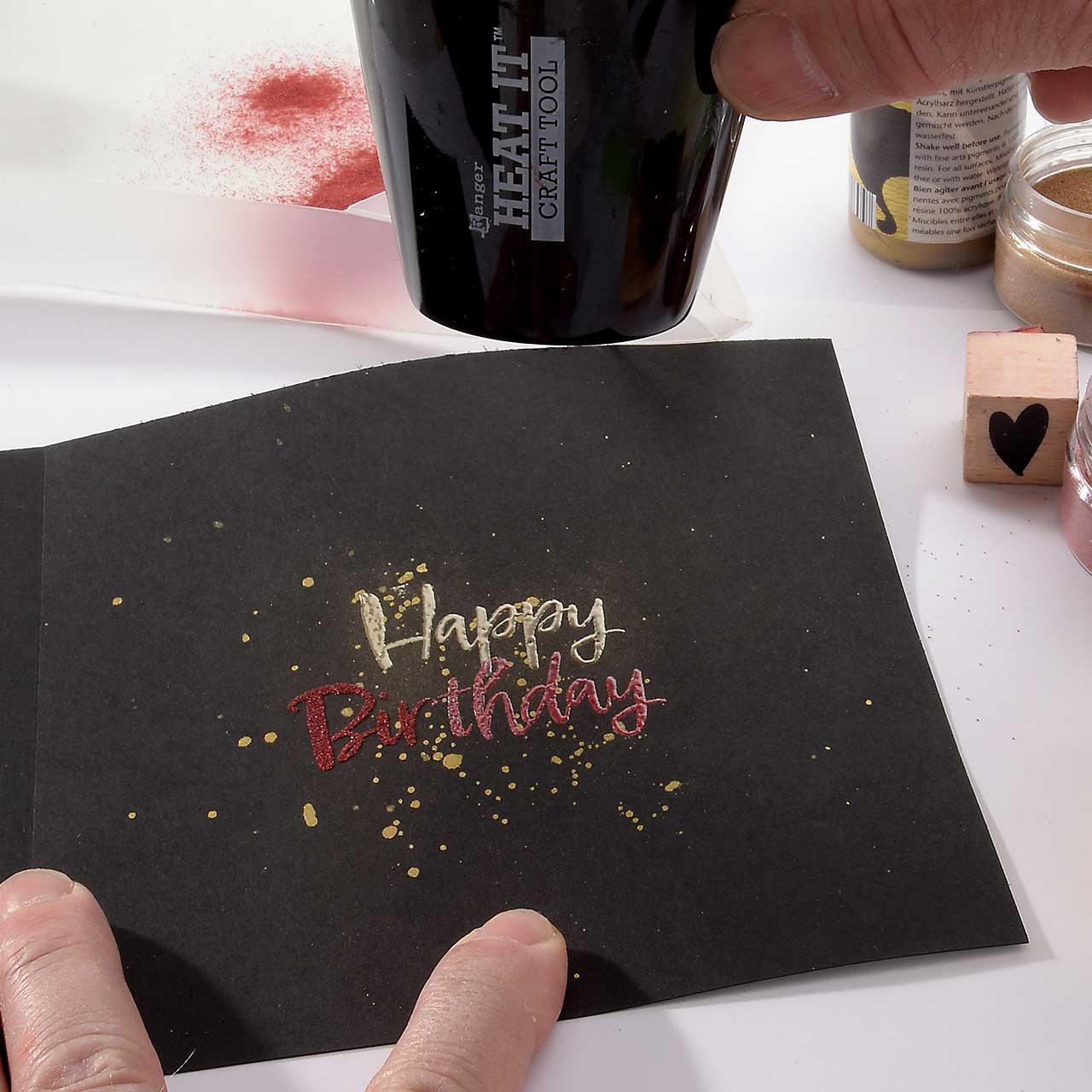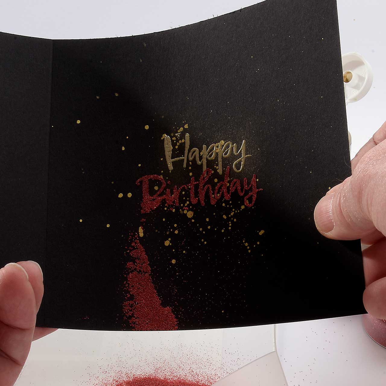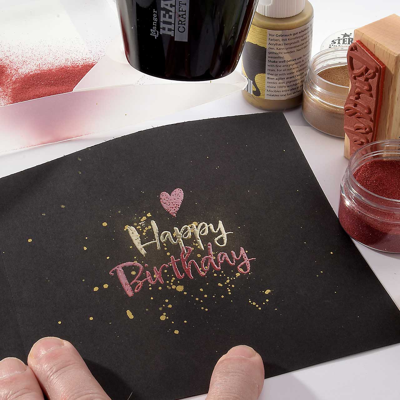 Stempeln und embossen Sie das „Birthday“ Textmotiv mit dem roten Sternenstaub in die Mitte Ihrer Karte.