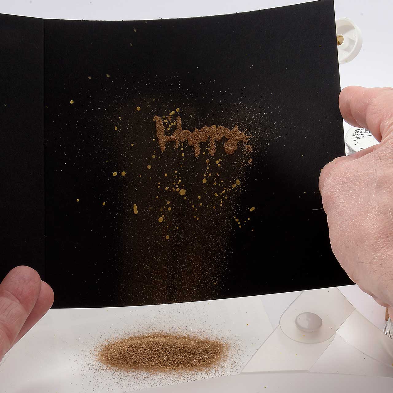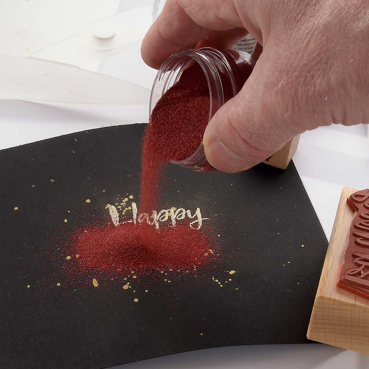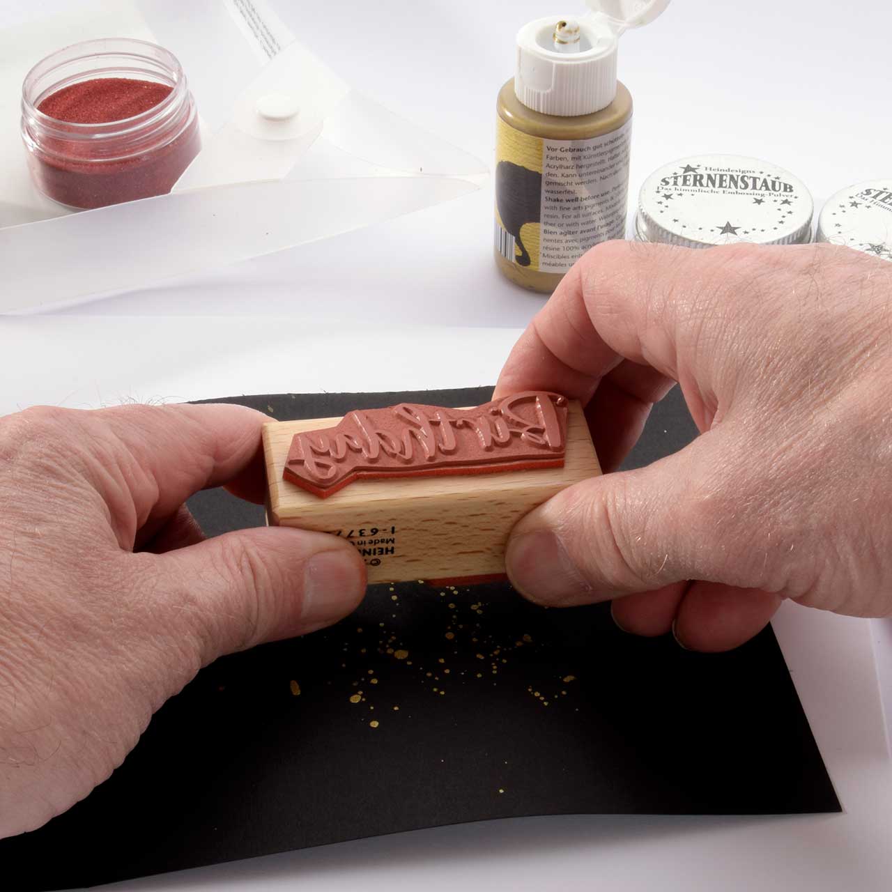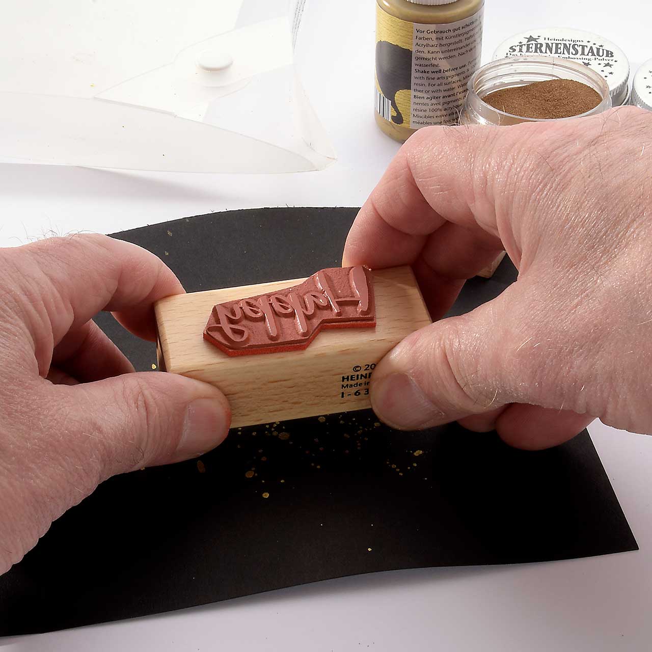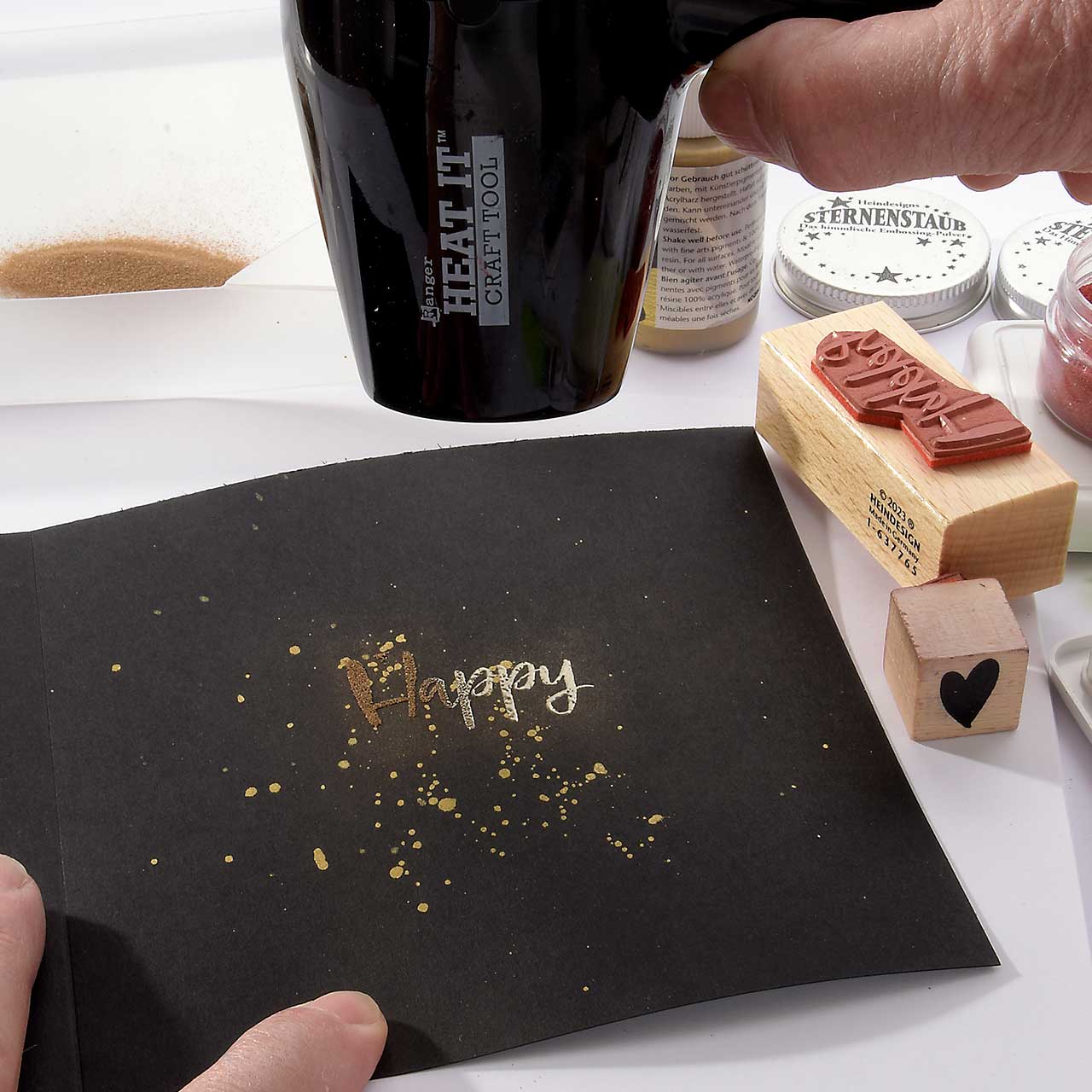 Stempeln und embossen Sie das „Happy“ Textmotiv mit dem goldenen Sternenstaub in die Mitte Ihrer Karte.