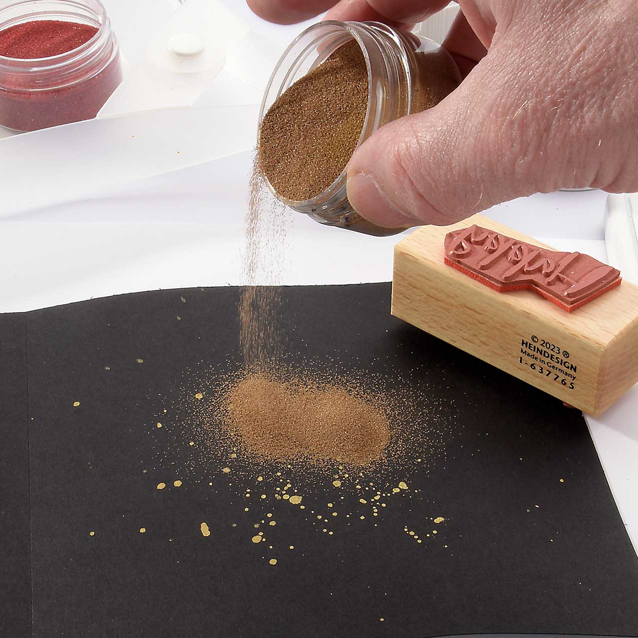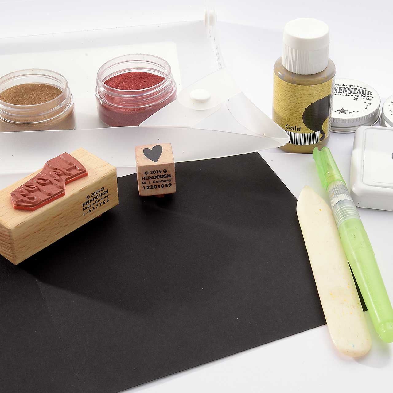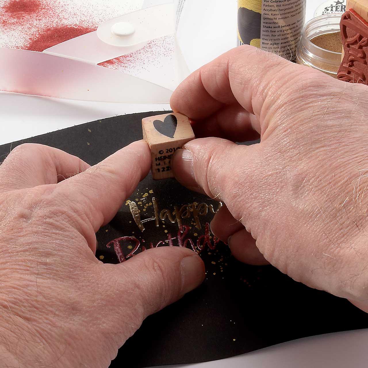 Stempeln und embossen Sie das Herz Motiv mit dem roten Sternenstaub in die Mitte Ihrer Karte.