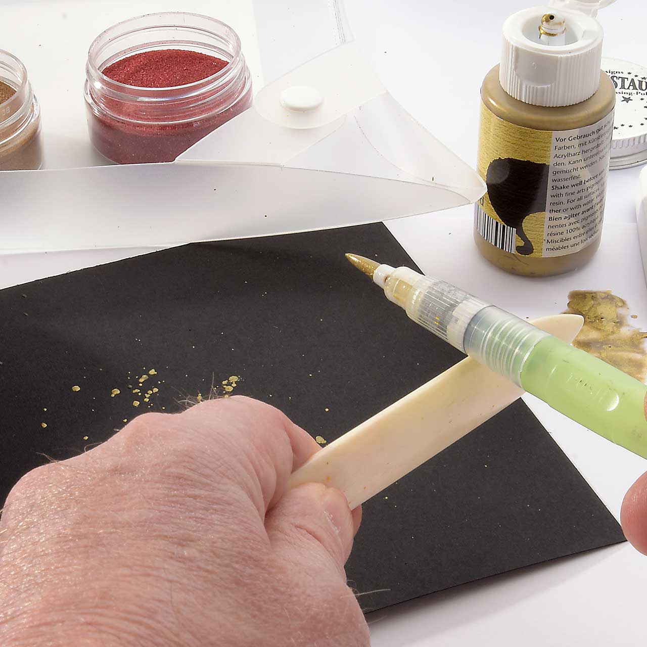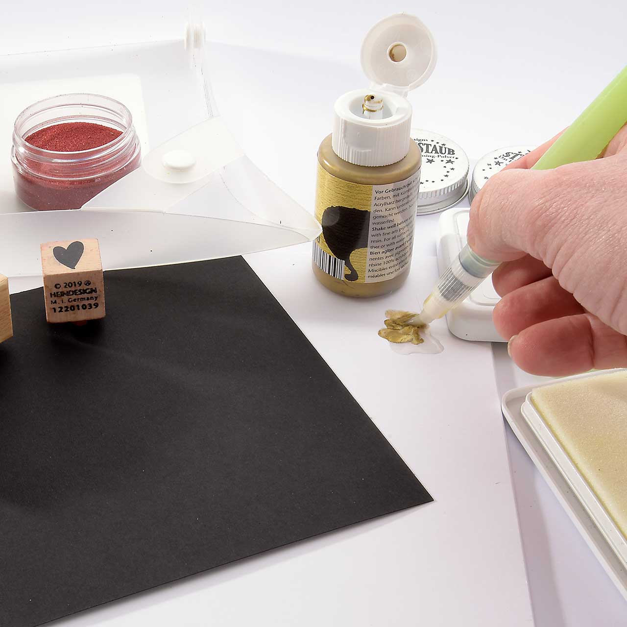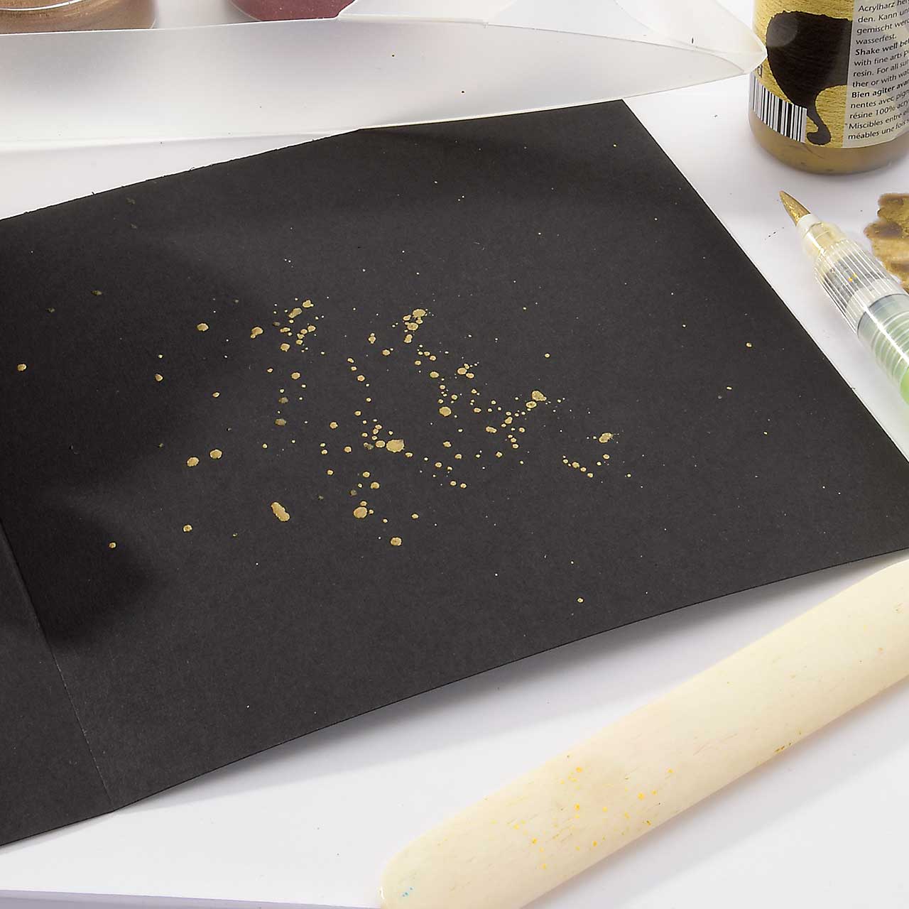 Nehmen Sie mit dem nassen Füllerpinsel goldene Acrylfarbe auf und klecksen Sie einige Sprenkel auf Ihre Karte.