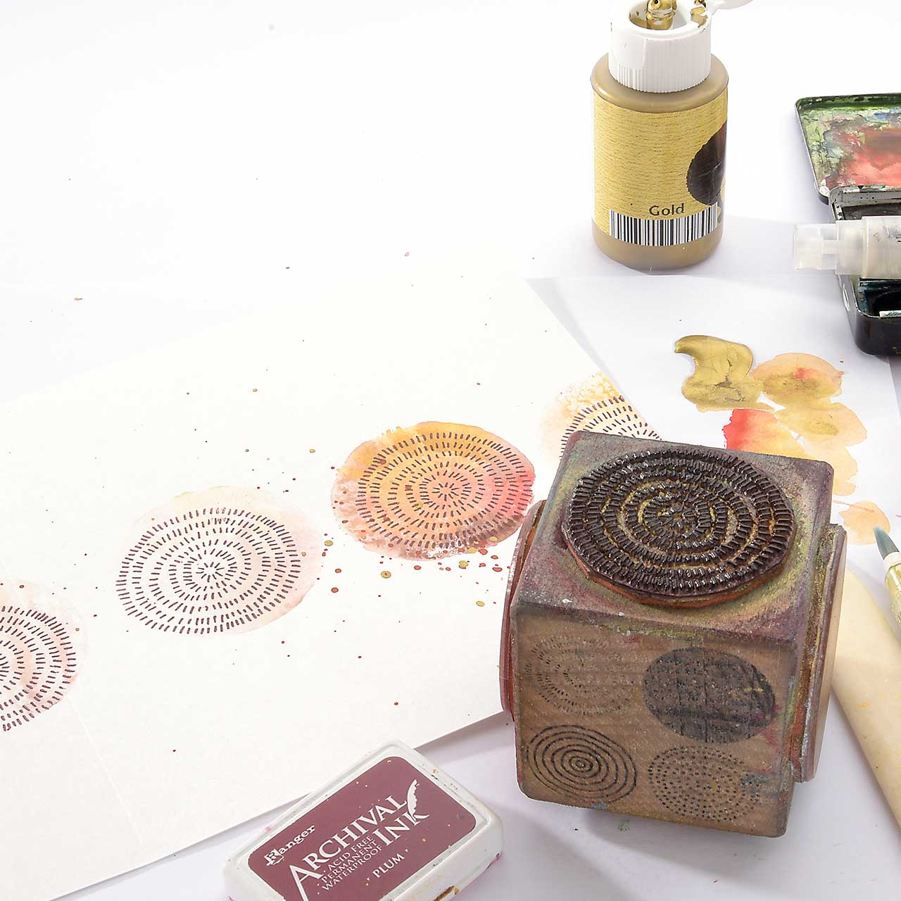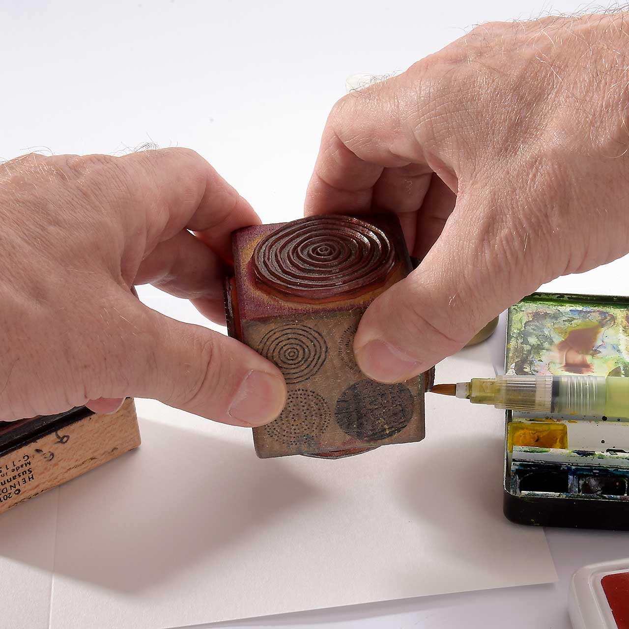 Färben Sie ihren kreisigen Kreise Stempel mit einem nassen Pinsel und Aquarellfarben ein. Wählen Sie drei Farbtöne - hell, mittel und dunkel - und tragen Sie sie relativ nass auf.
