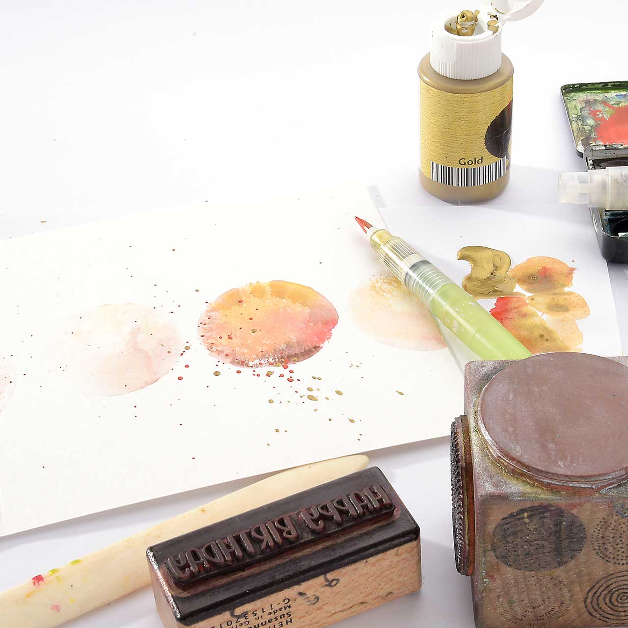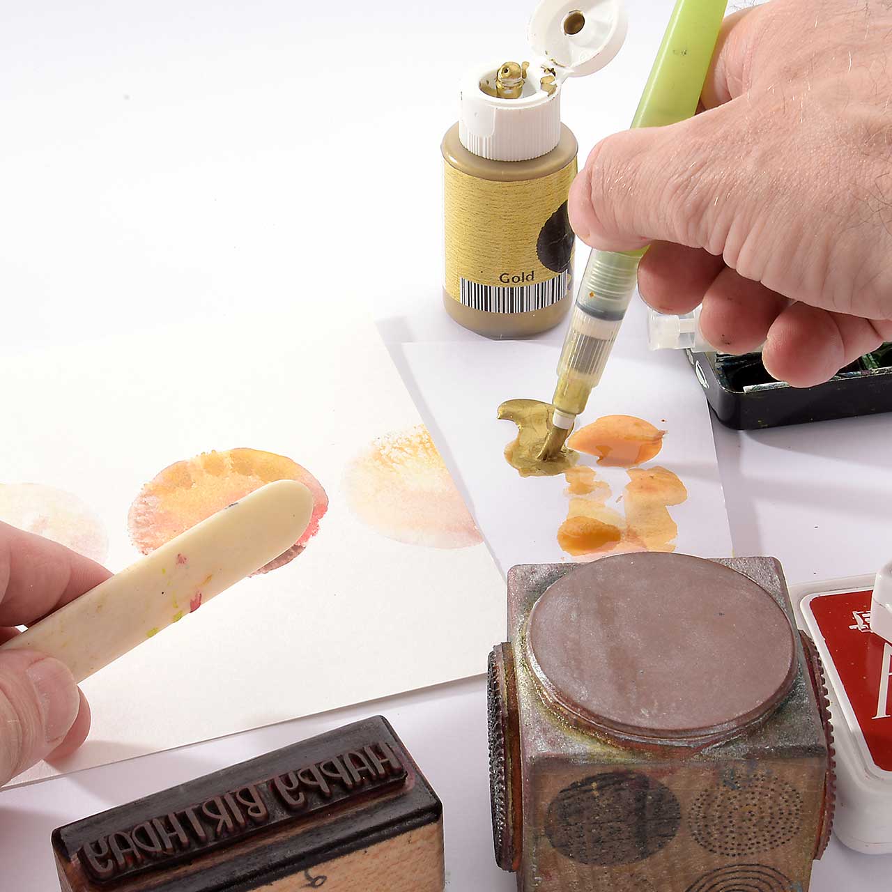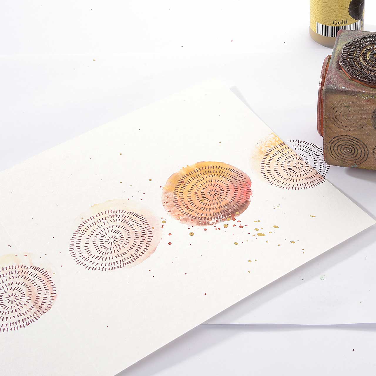 Sprenkeln Sie mit dem Pinsel goldene und rote Kleckse auf Ihre Karte.
