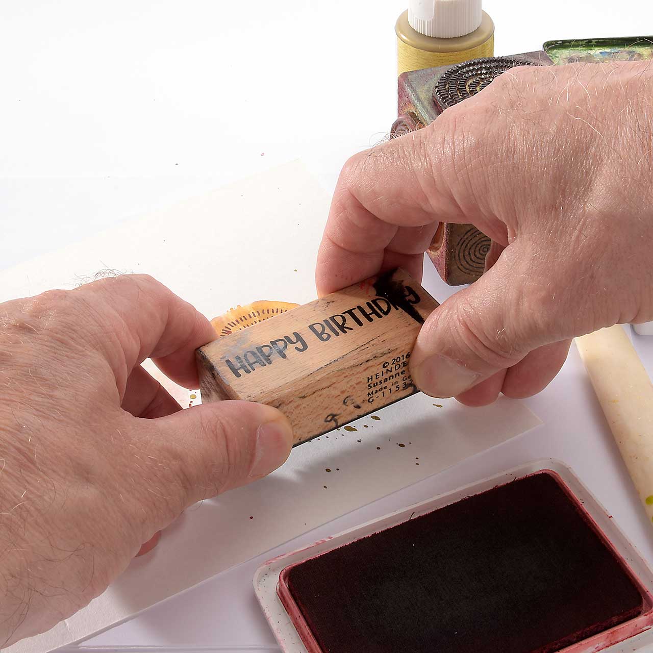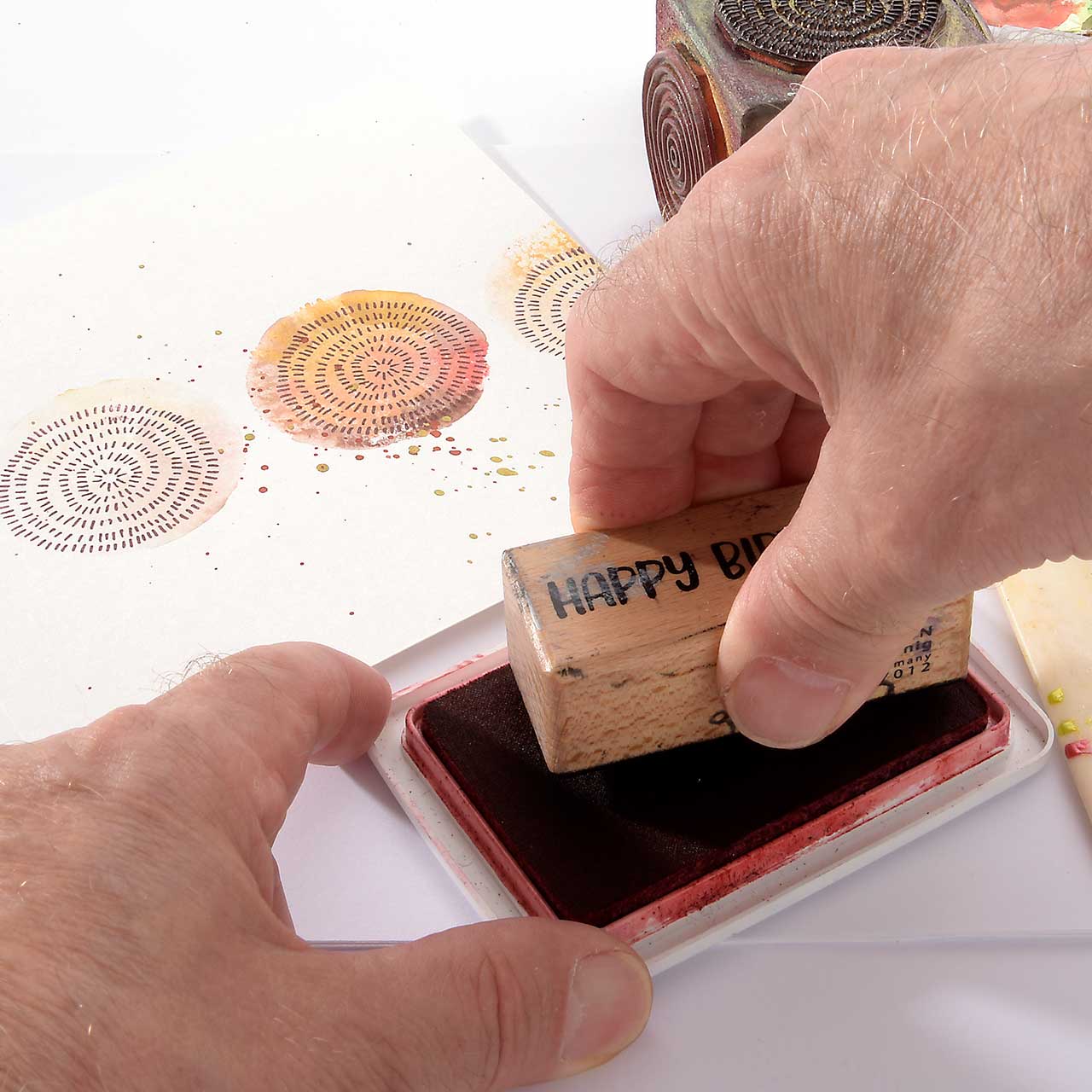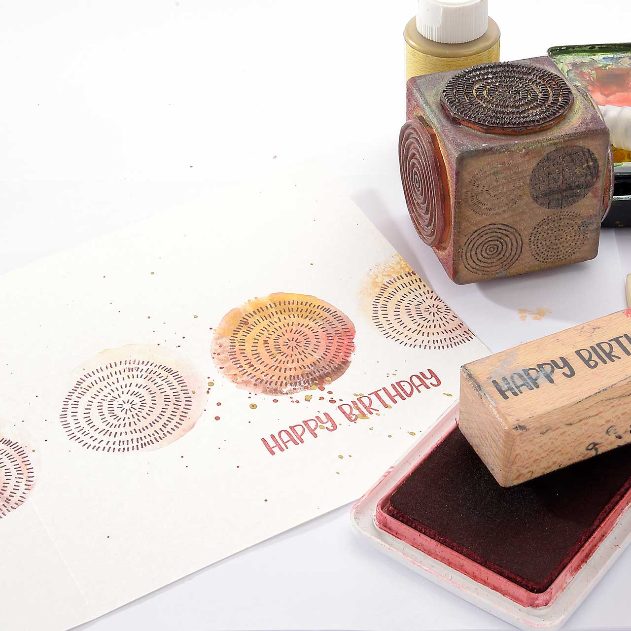 Stempeln Sie das „Happy Birthday“ Textmotiv mit dem roten Stempelkissen mittig unter den Kreis, mit der kräftigsten Farbe.