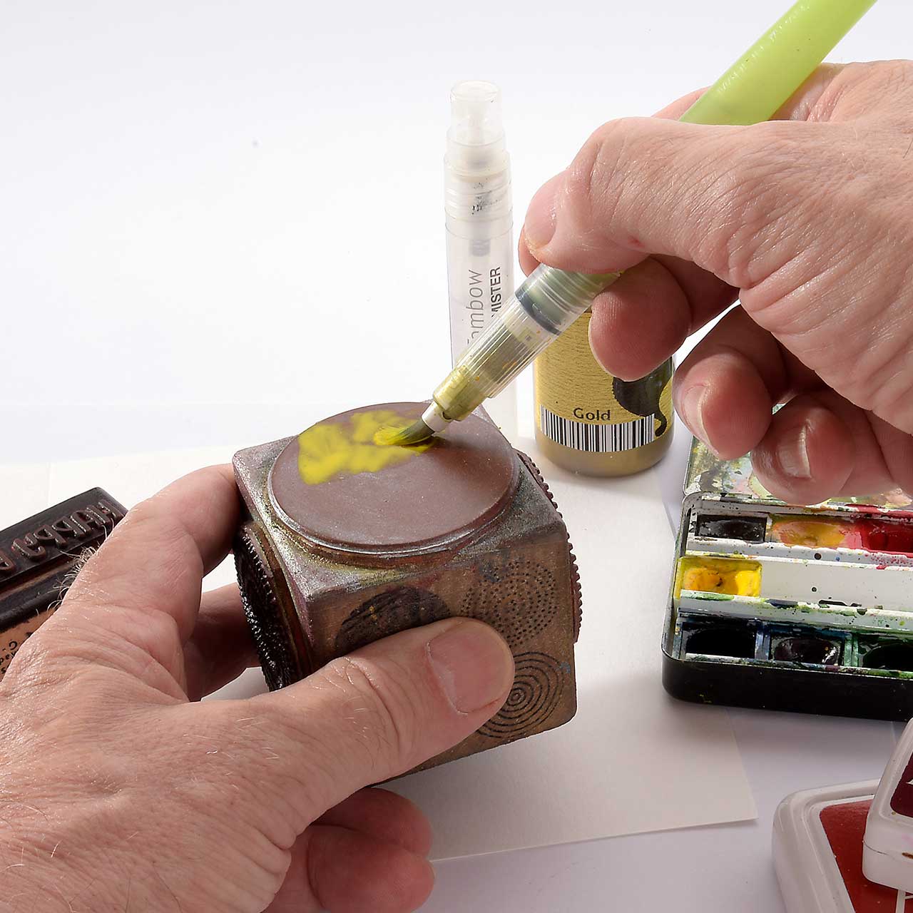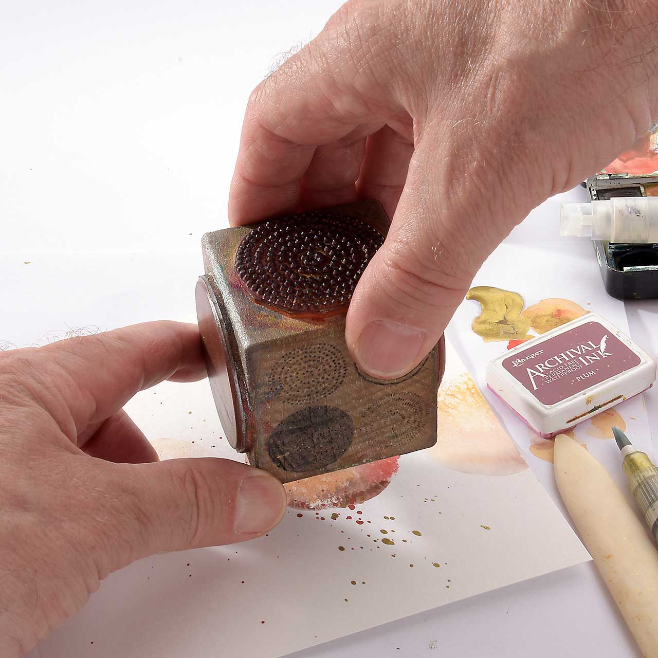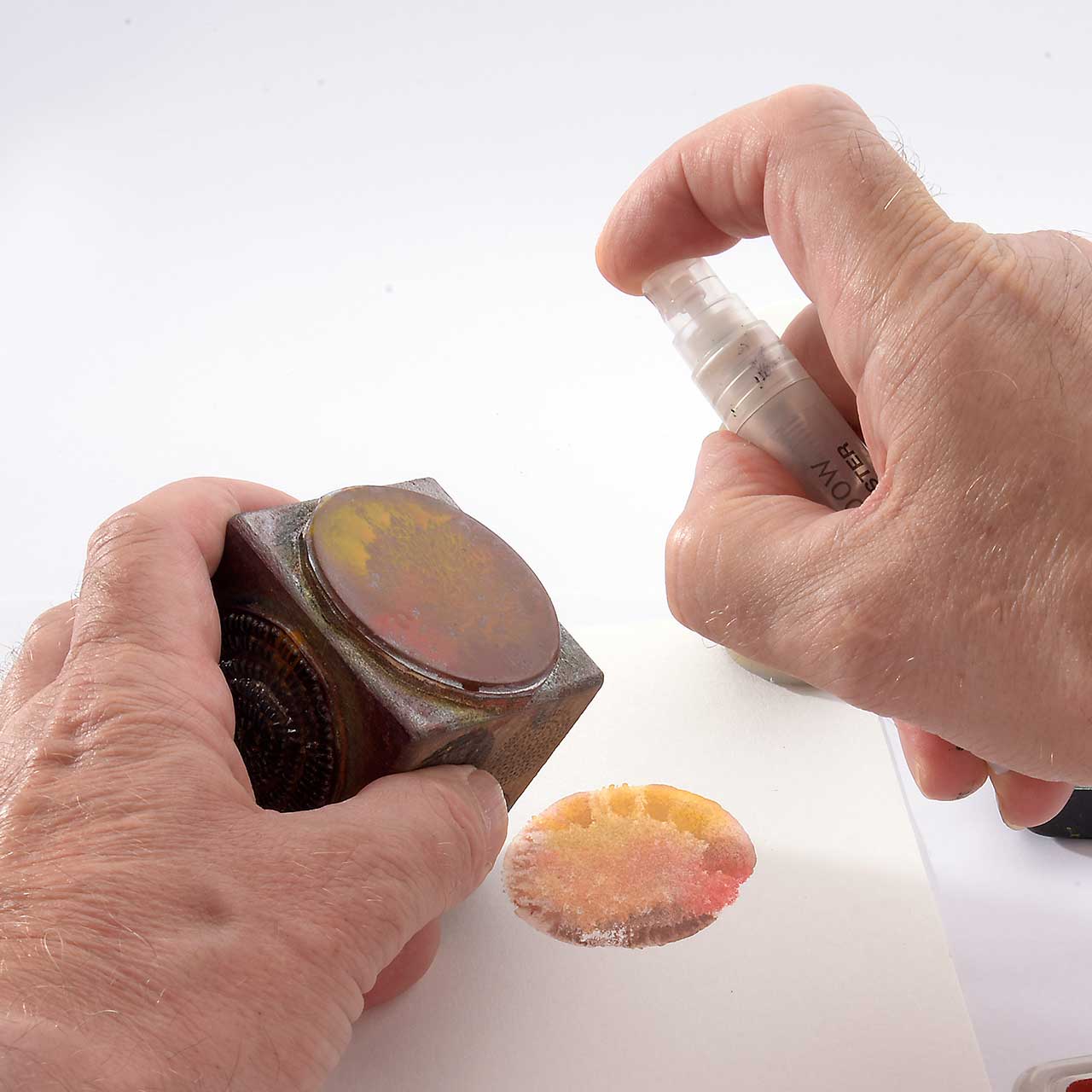Nach dem ersten, kräftigen Abdruck ist noch genügend Farbe, für weitere Abdrucke an dem Stempel. Benetzen Sie das Stempelgummi mit einem Sprühfläschchen und stempeln rechts neben dem ersten Abdruck.