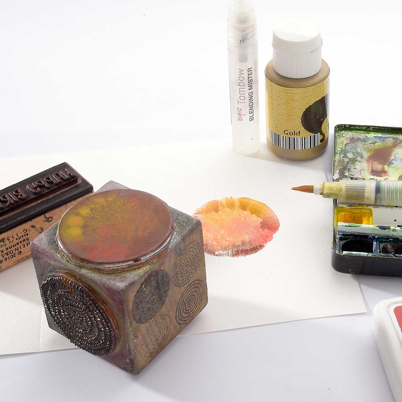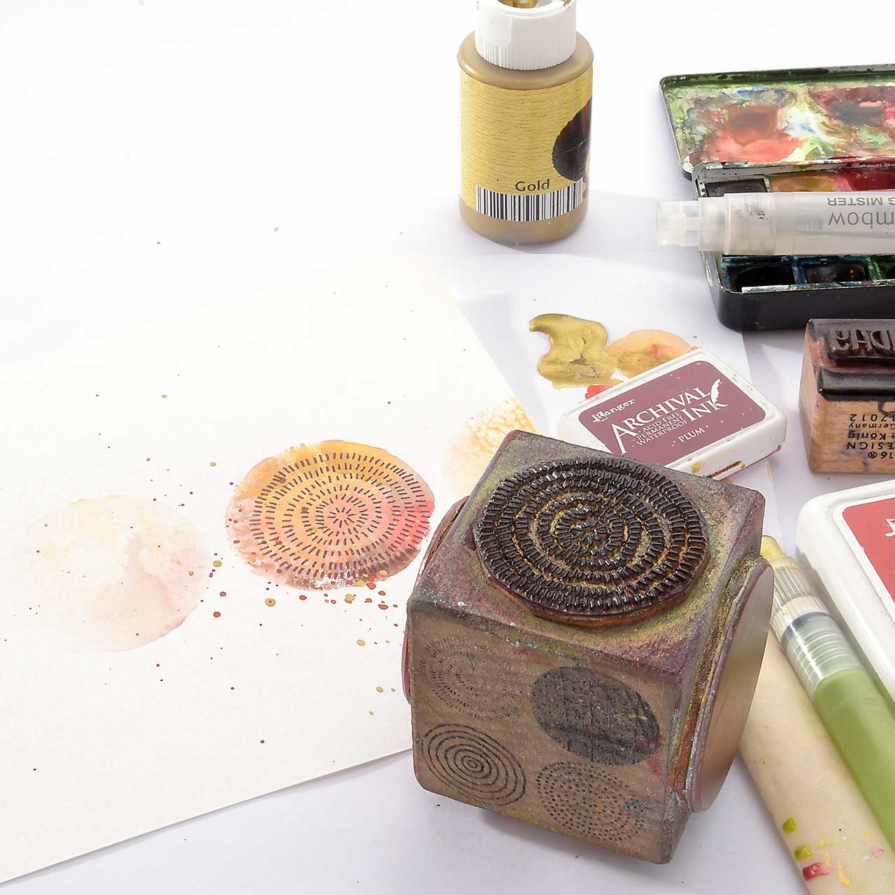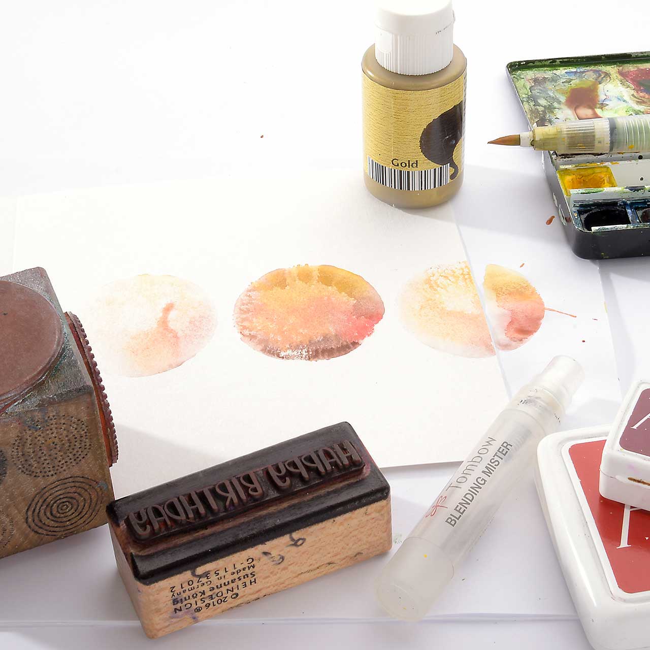 Nach dem ersten, kräftigen Abdruck ist noch genügend Farbe, für weitere Abdrucke an dem Stempel. Benetzen Sie das Stempelgummi mit einem Sprühfläschchen und stempeln rechts neben dem ersten Abdruck.