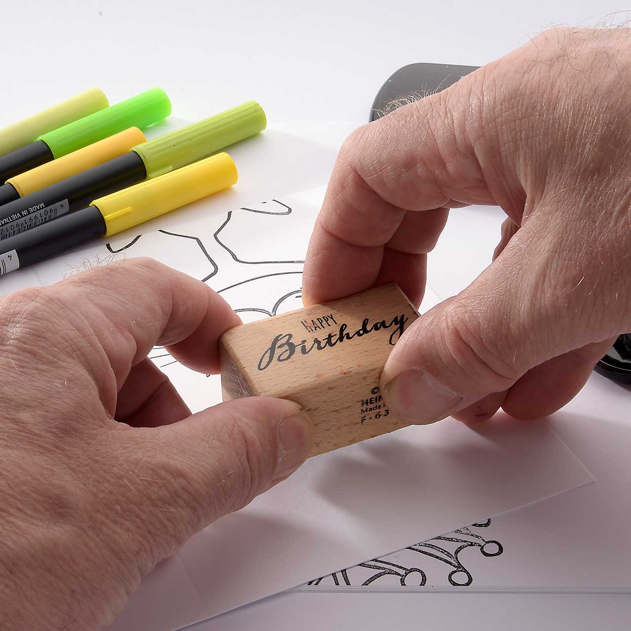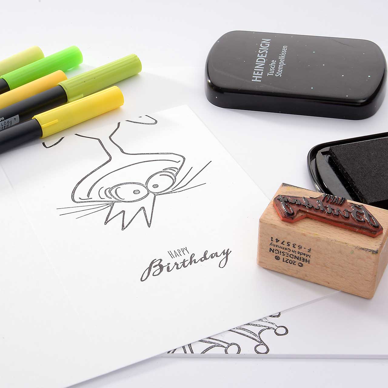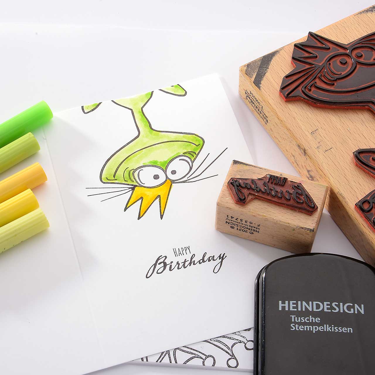 Drehen Sie die Karte herum, so dass das Froschkönig nun auf dem Kopf erscheint und stempeln Sie das „Happy Birthday“ Textmotiv mit dem schwarzen Stempelkissen unter das Froschkönig Motiv.