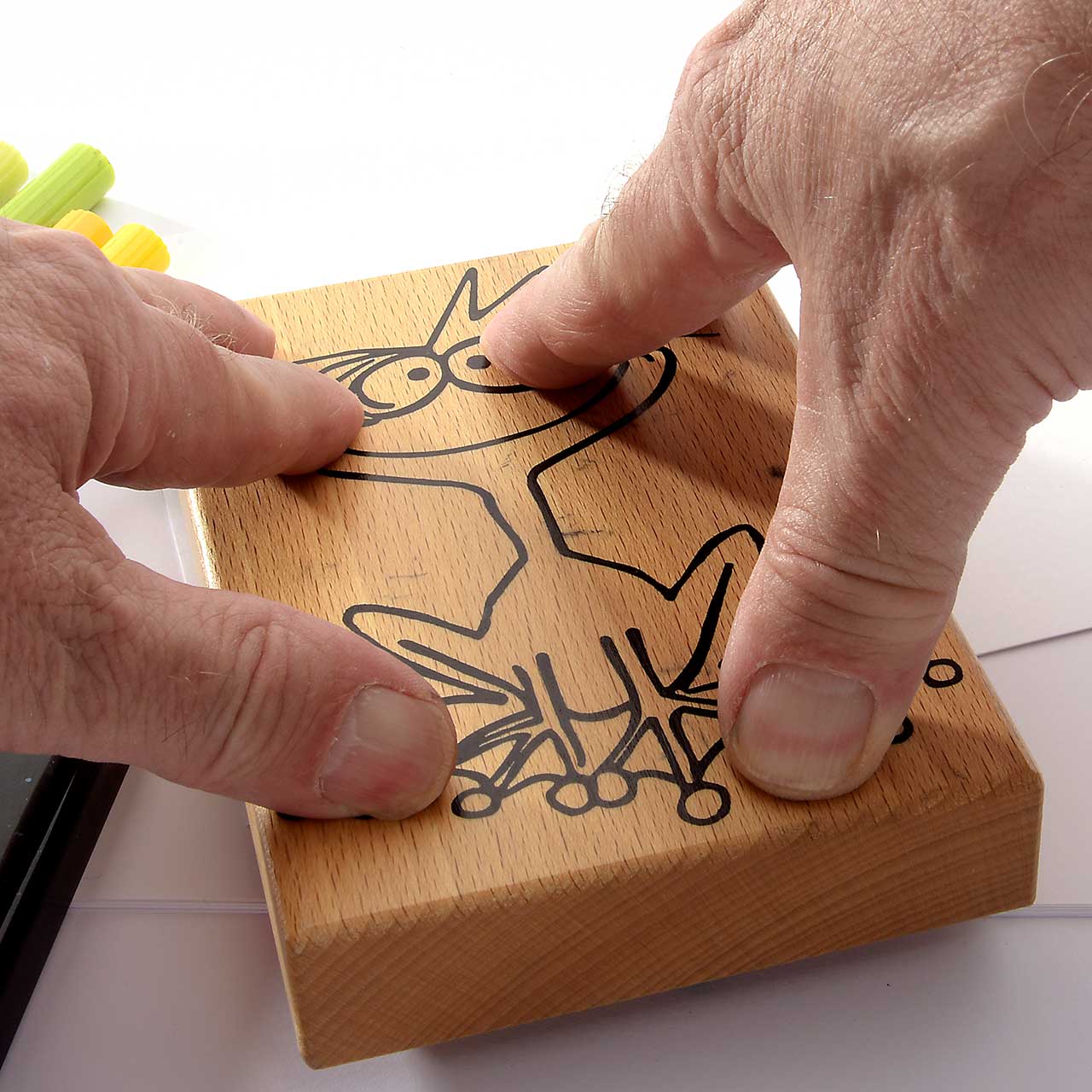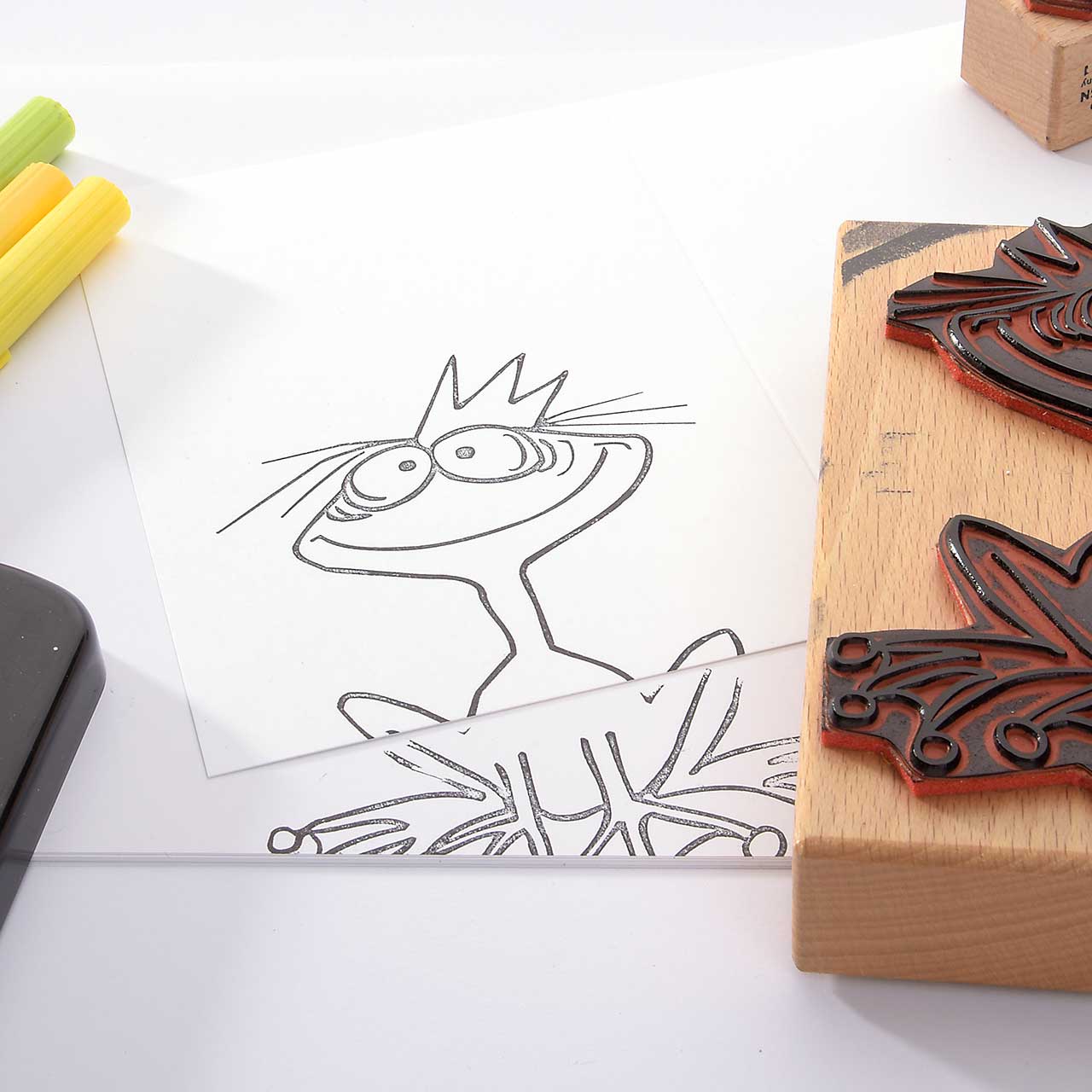 Stempeln Sie das Froschkönig Motiv mit dem schwarzen Stempelkissen auf die linke Seite Ihrer weißen Doppelkarte.