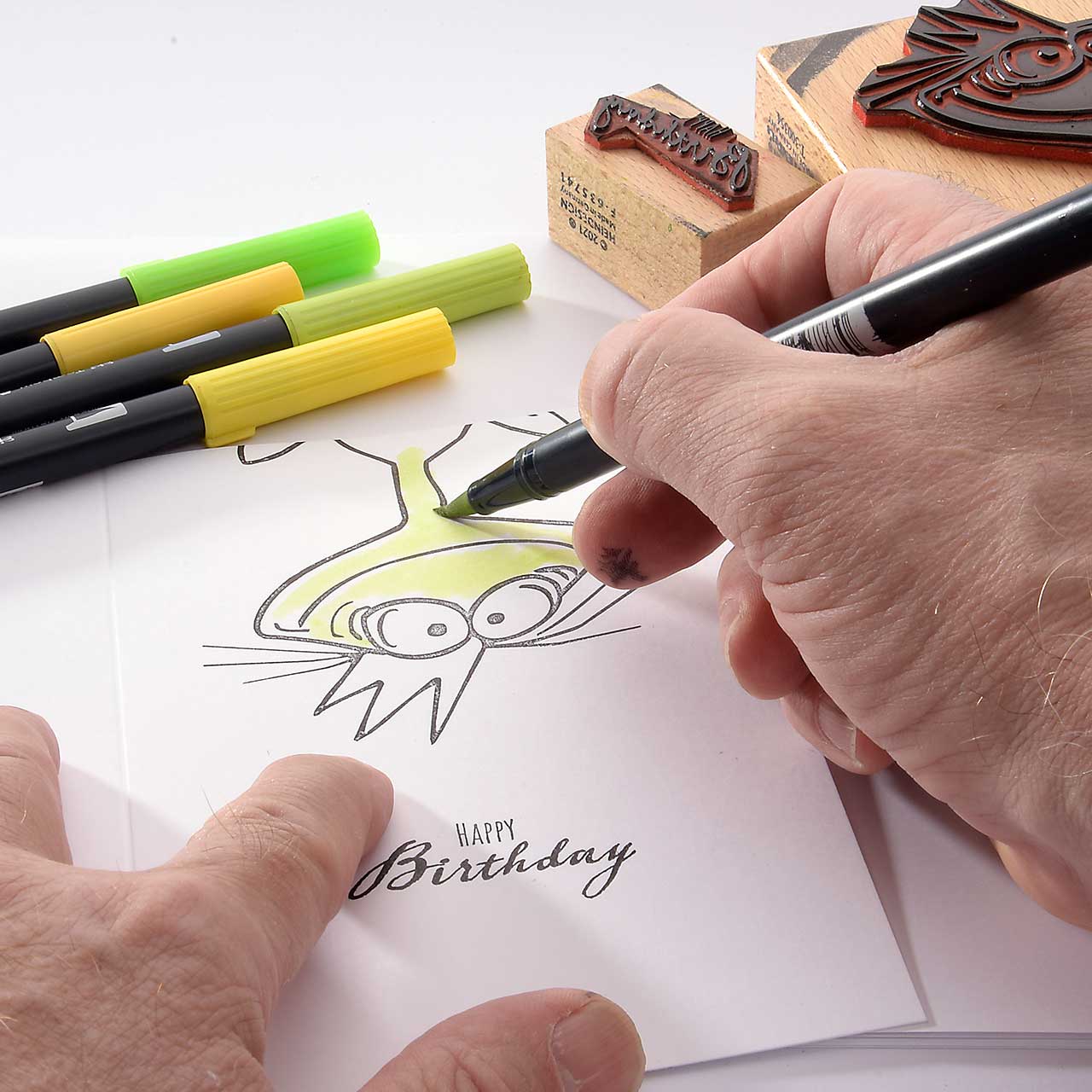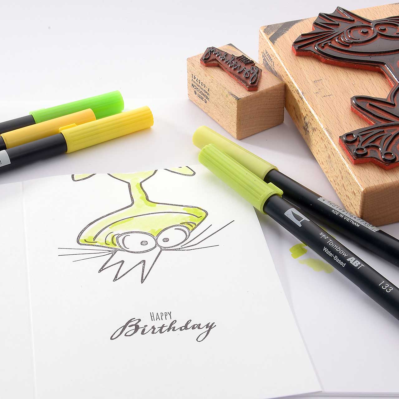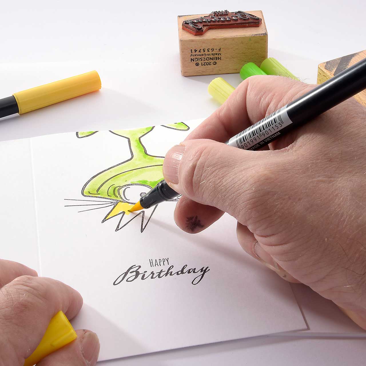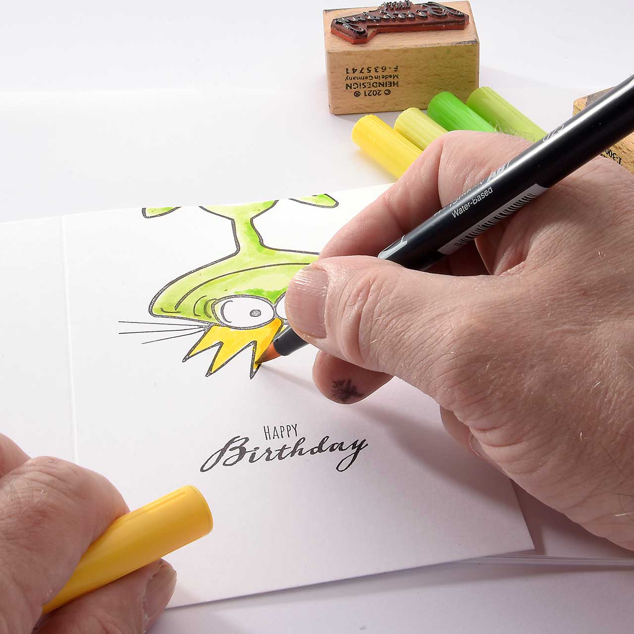 Kolorieren Sie das Froschkönig Motiv mit den gelben und grünen Tombow Dual Brushpen Faserschreibern.