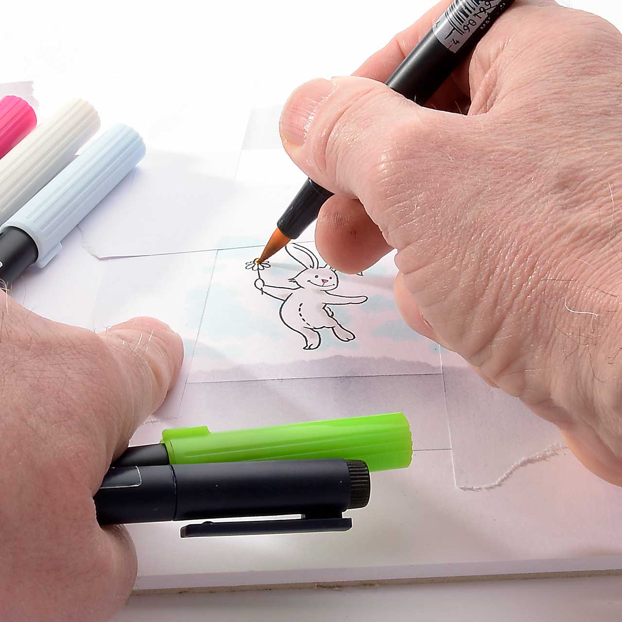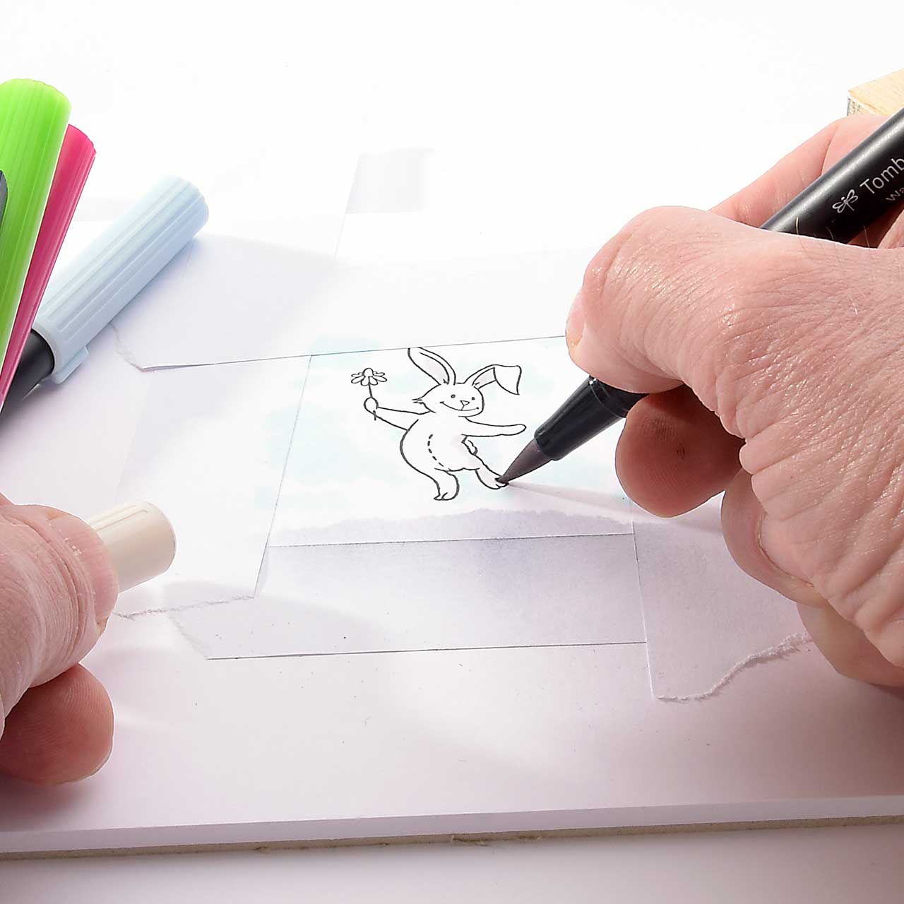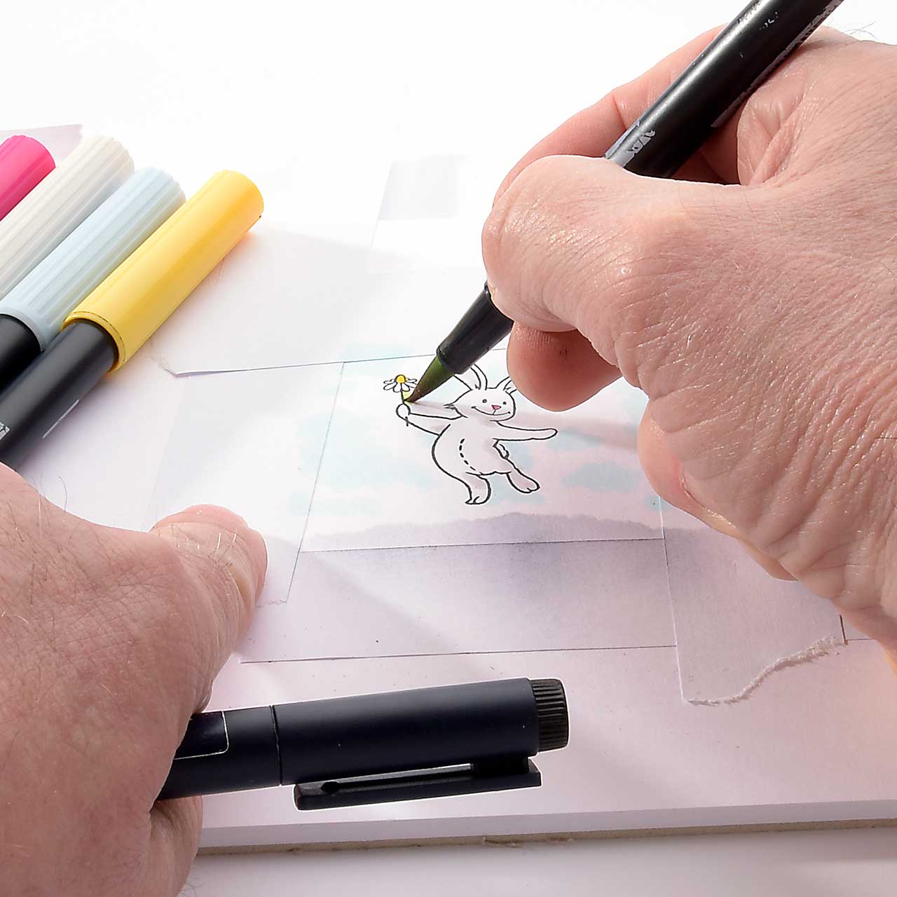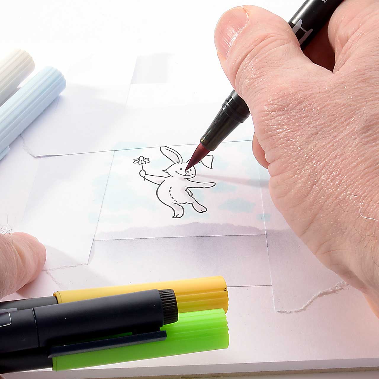 Deuten Sie mit dem hellgrauen Tombow Dual Brushpen Faserschreiber (ABT) die schattigen Stellen an dem Hasi Motiv an.