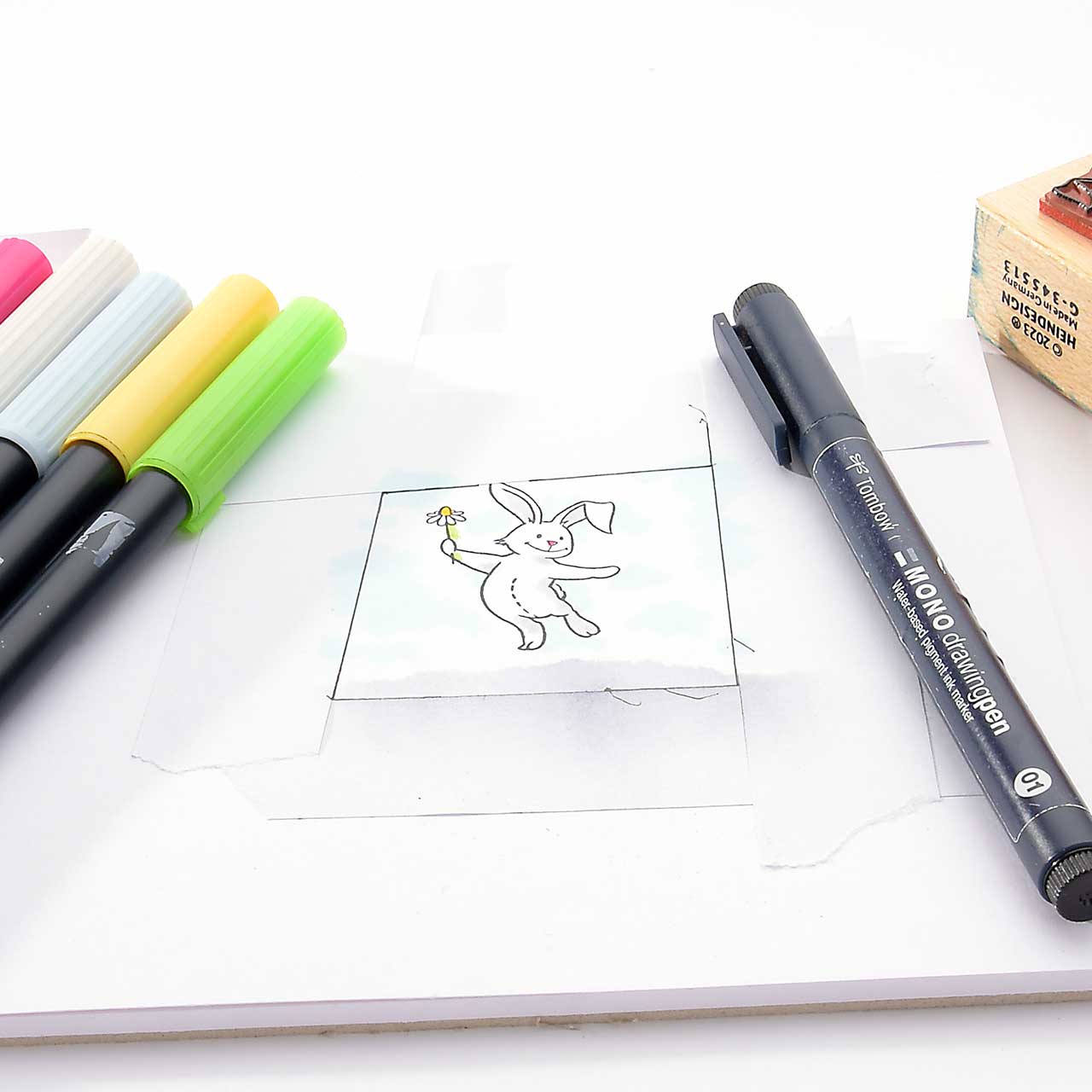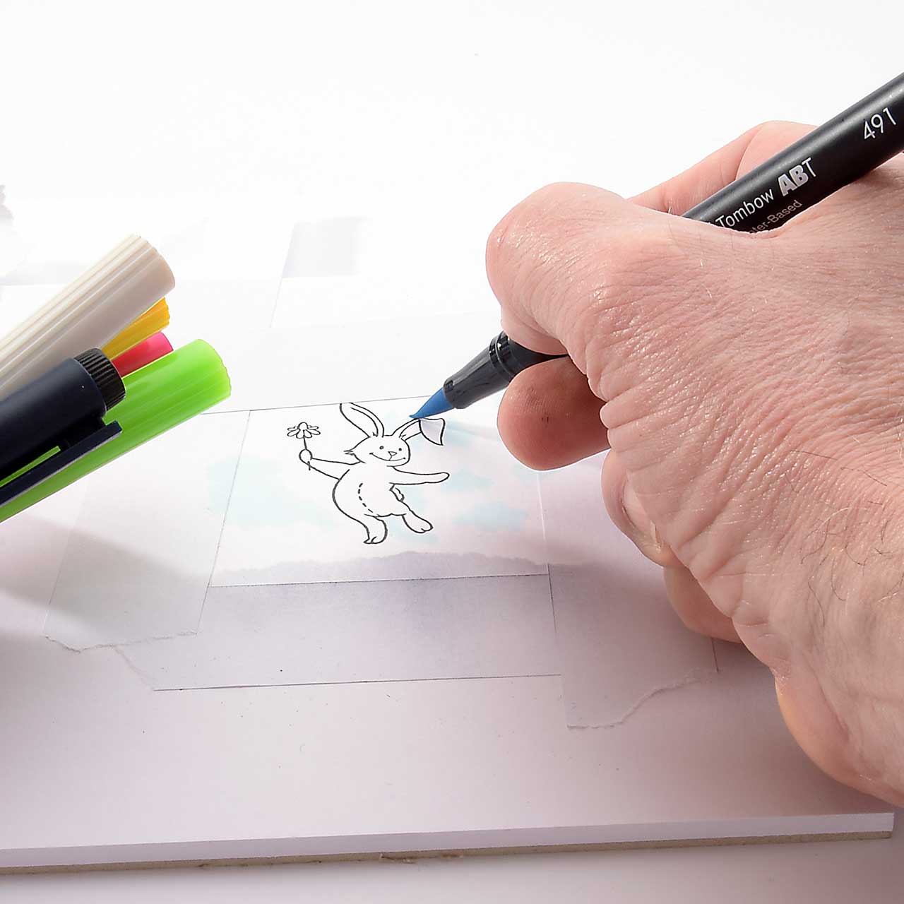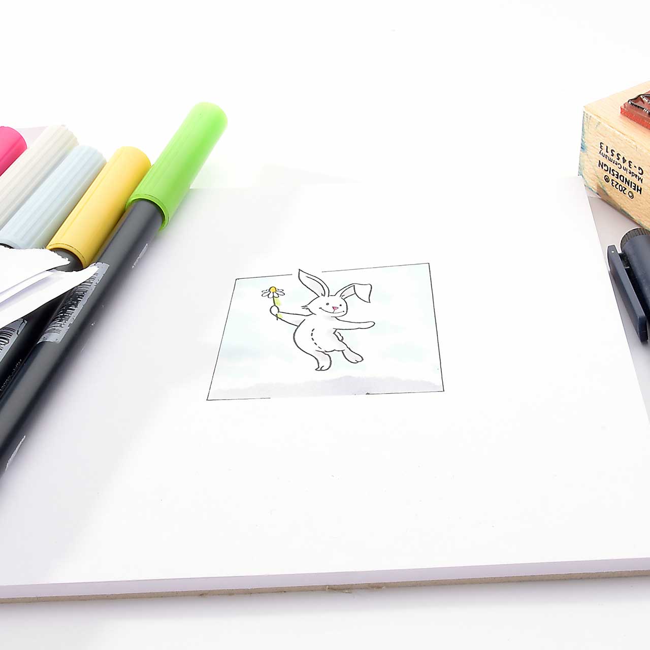 Kolorieren Sie mit dem hellblauen Tombow Dual Brushpen Faserschreiber (ABT) den „Himmel“ rings um das Hasi Motiv.