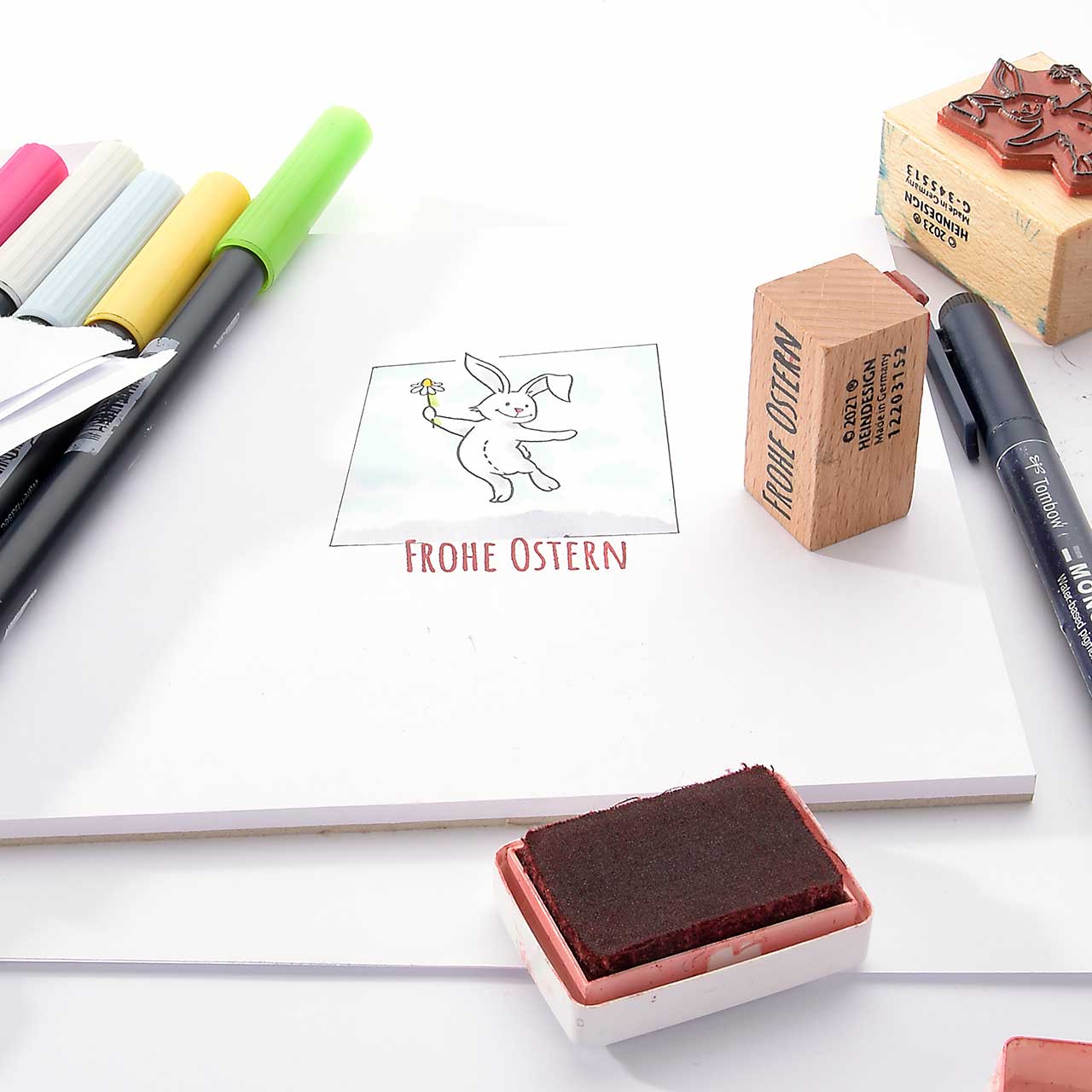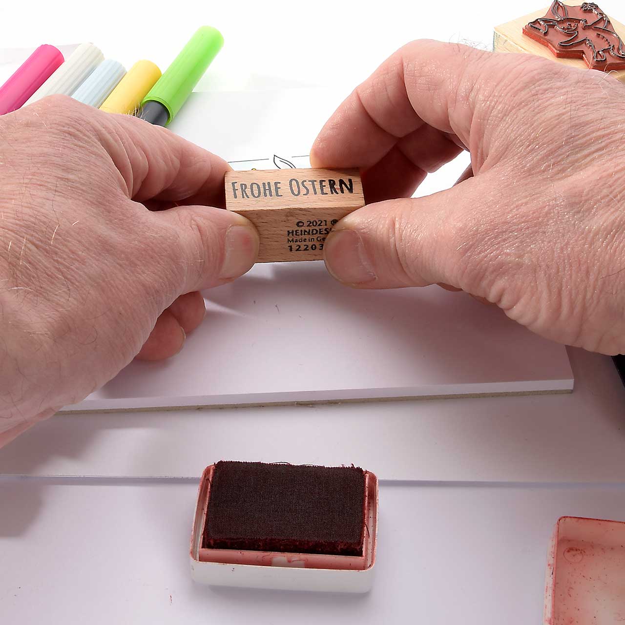 Stempeln Sie das „Frohe Ostern“ Textmotiv mit dem roten Stempelkissen.