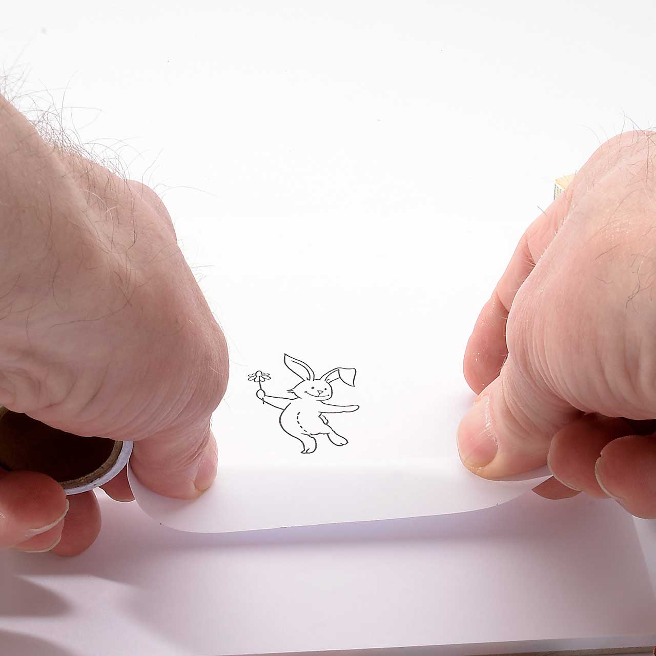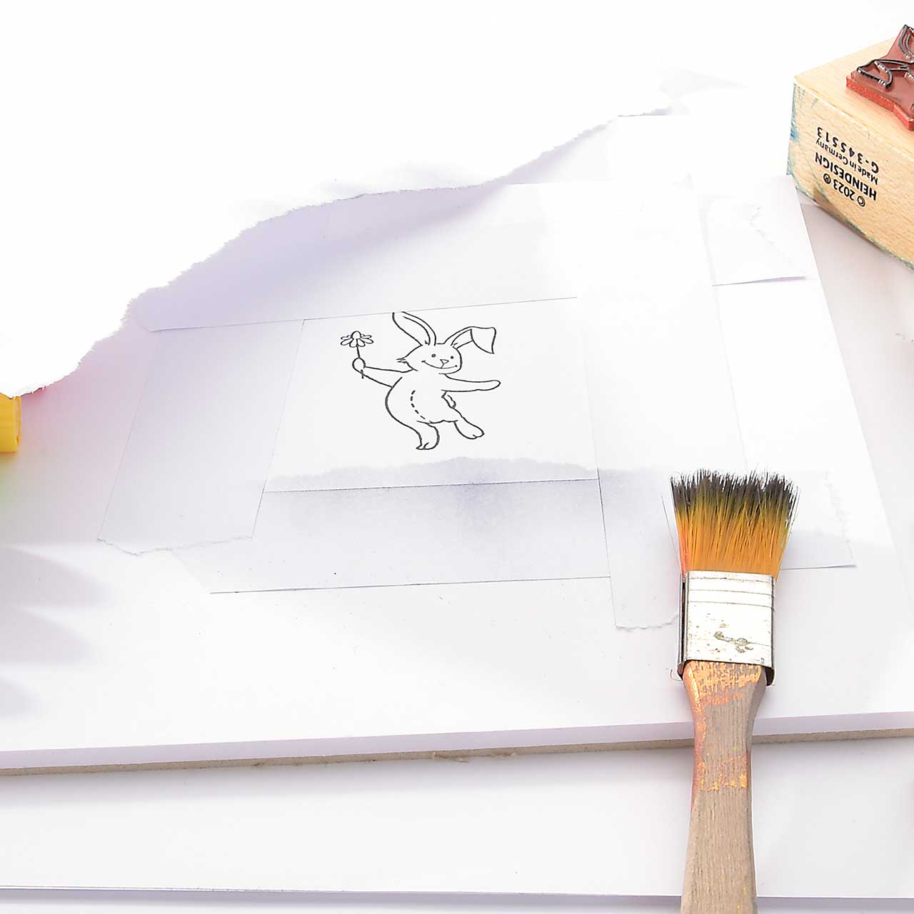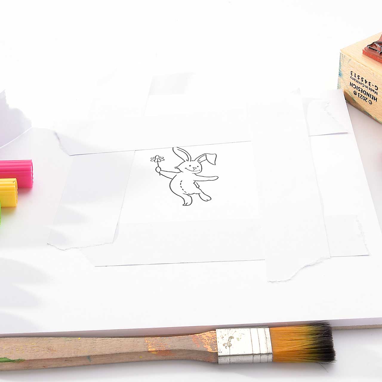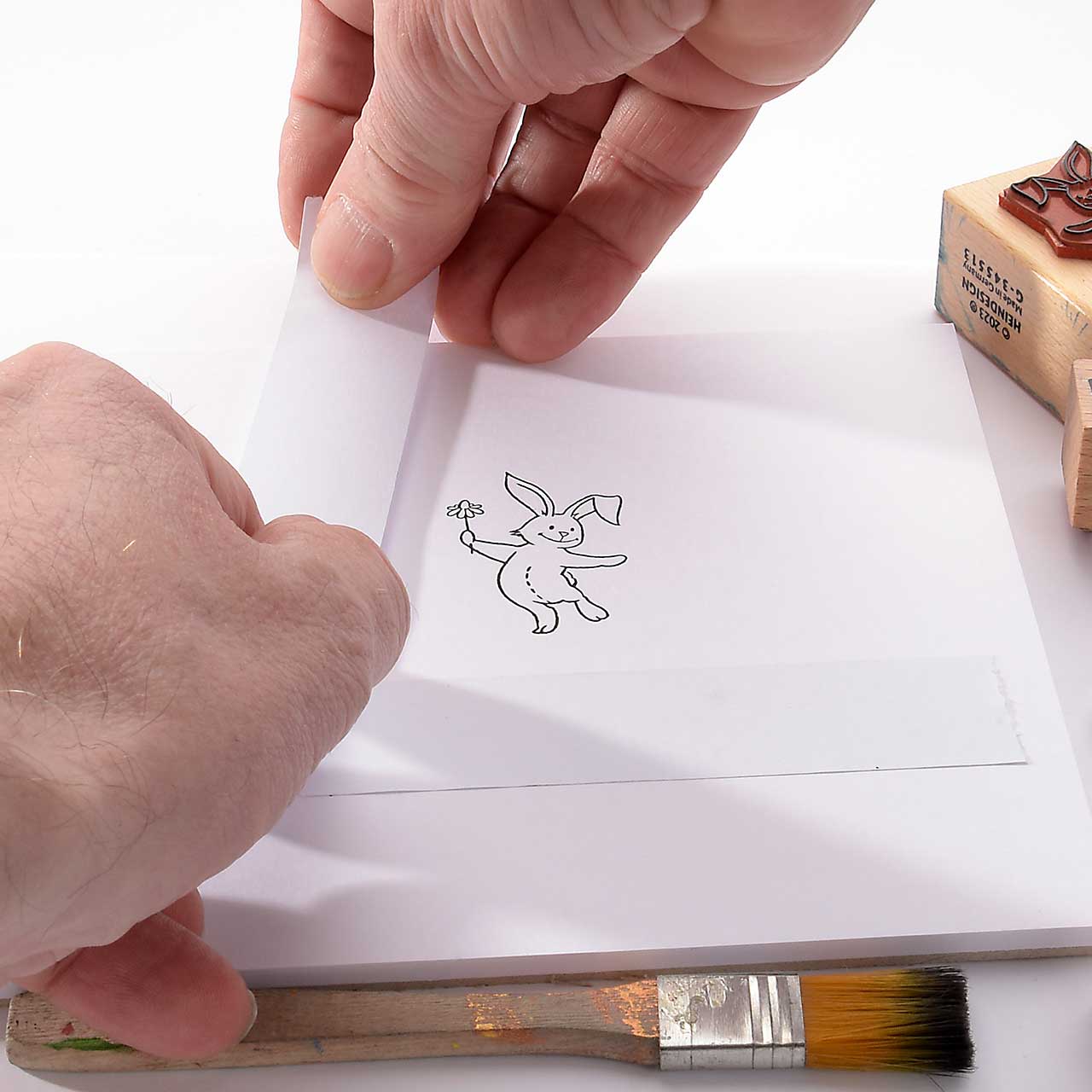Legen Sie das Papier auf Ihre Karte, so dass das Hasi Motiv abgedeckt ist, und tupfen Sie vorsichtig mit dem Pinsel etwas Farbe aus dem schwarzen Stempelkissen auf.