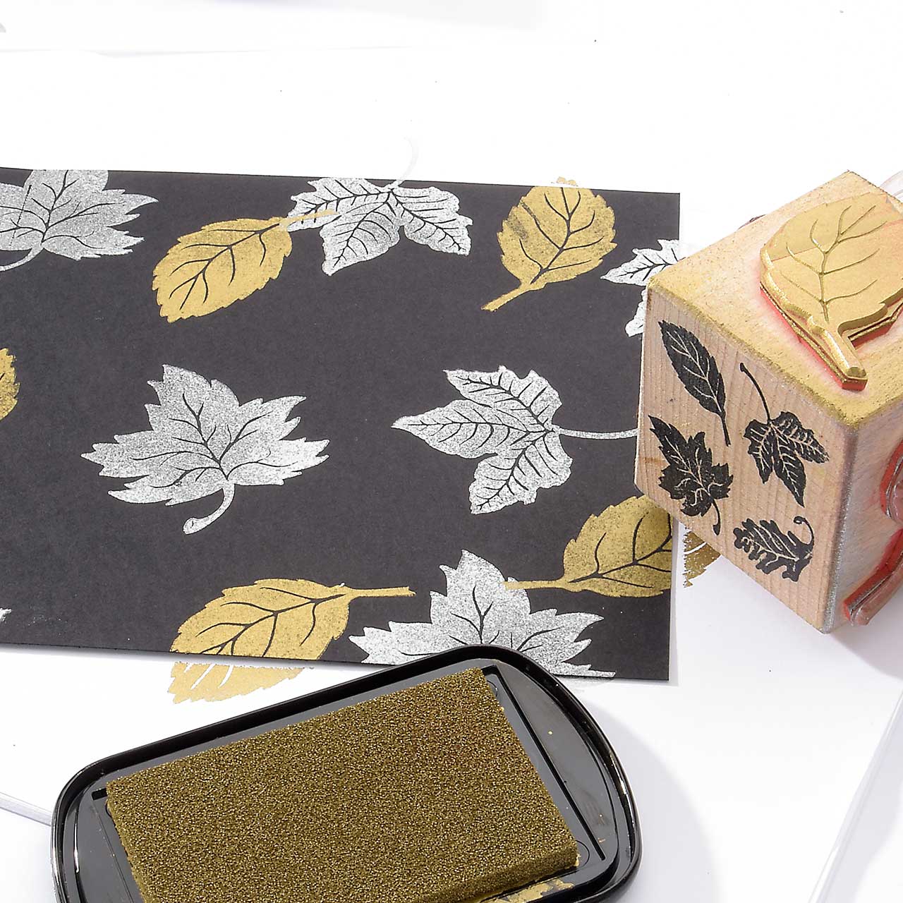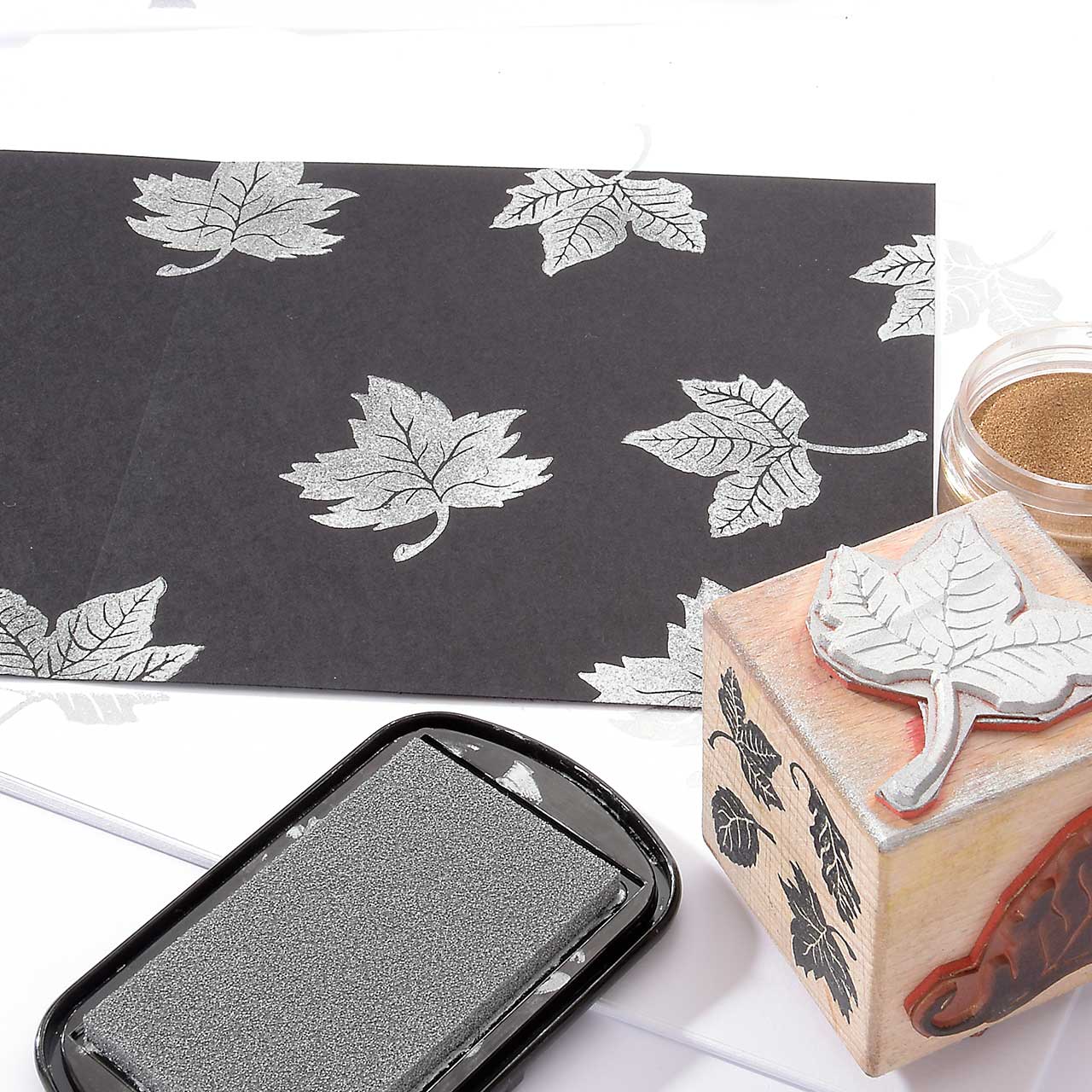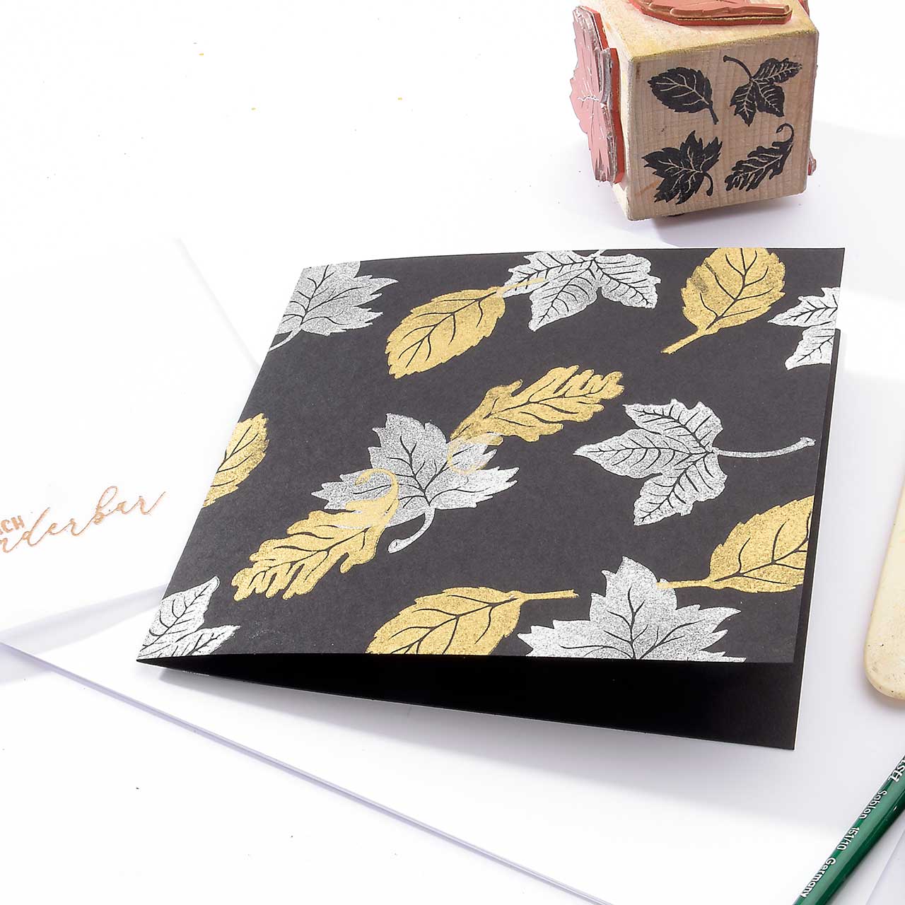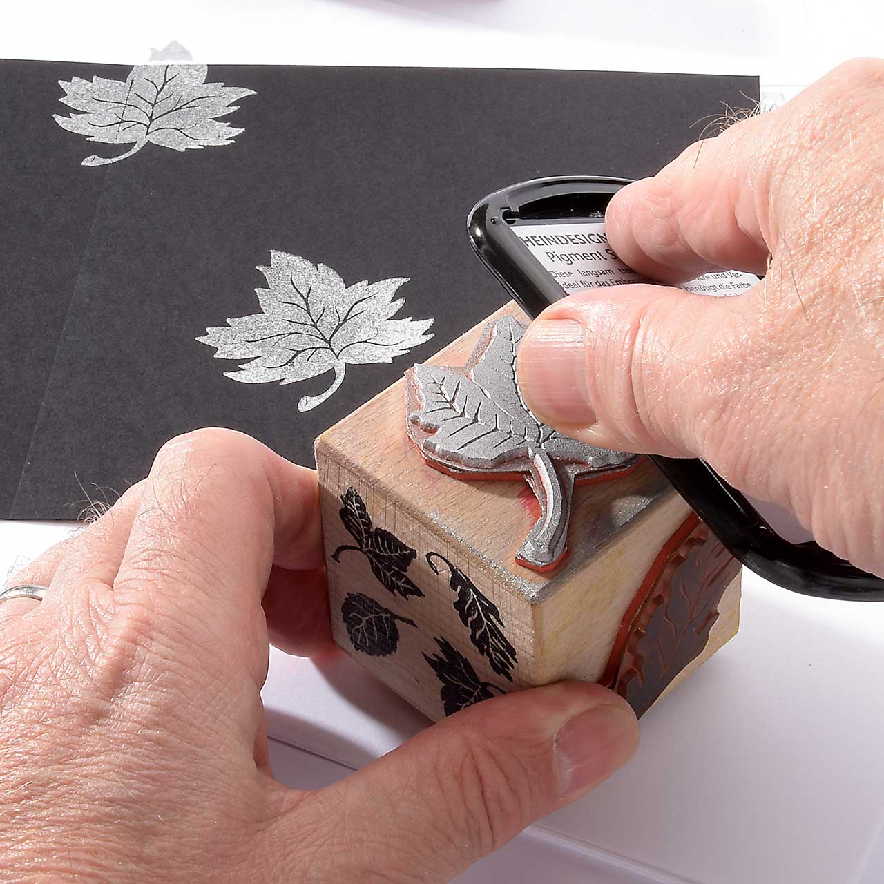 Stempeln Sie das vierte, der vier fallenden Blätter Motive mit dem silbernen Stempelkissen mehrfach auf Ihre Karte. Für ein gleichmäßiges Druckbild färben Sie den Stempel vor jedem Abdruck erneut ein.