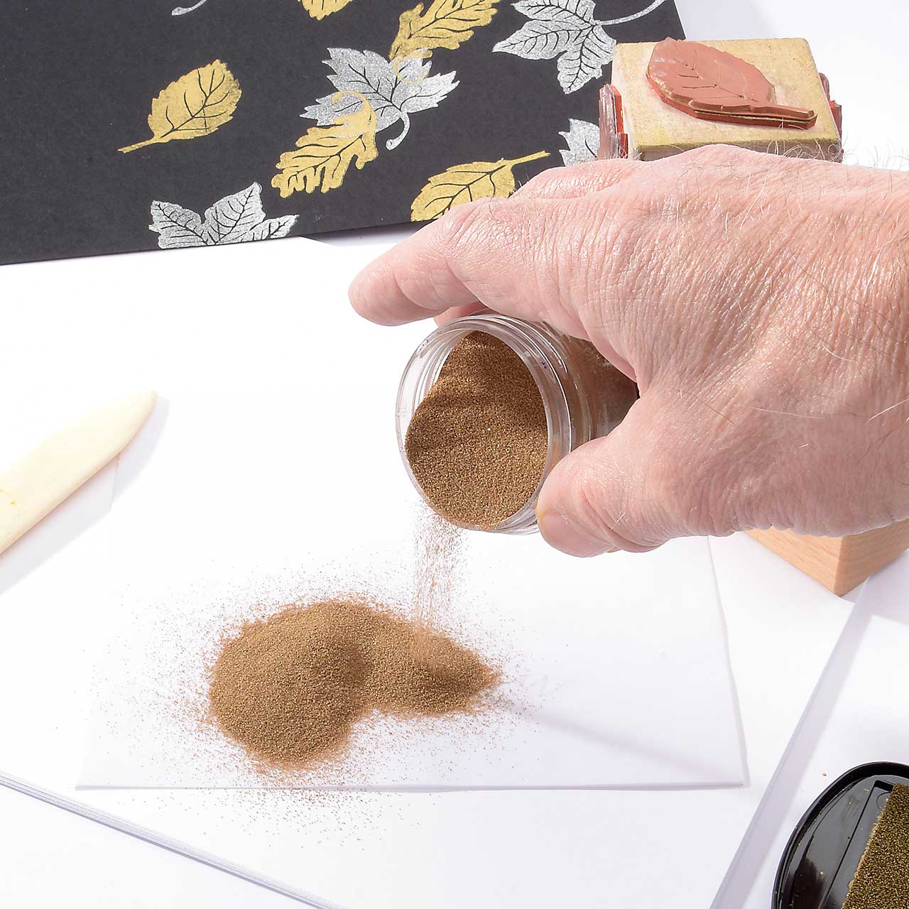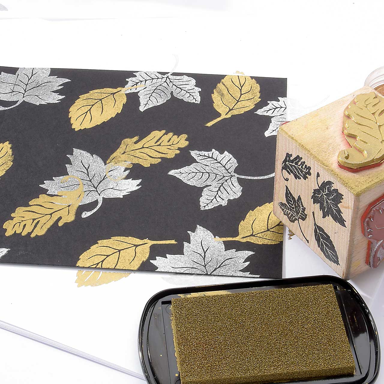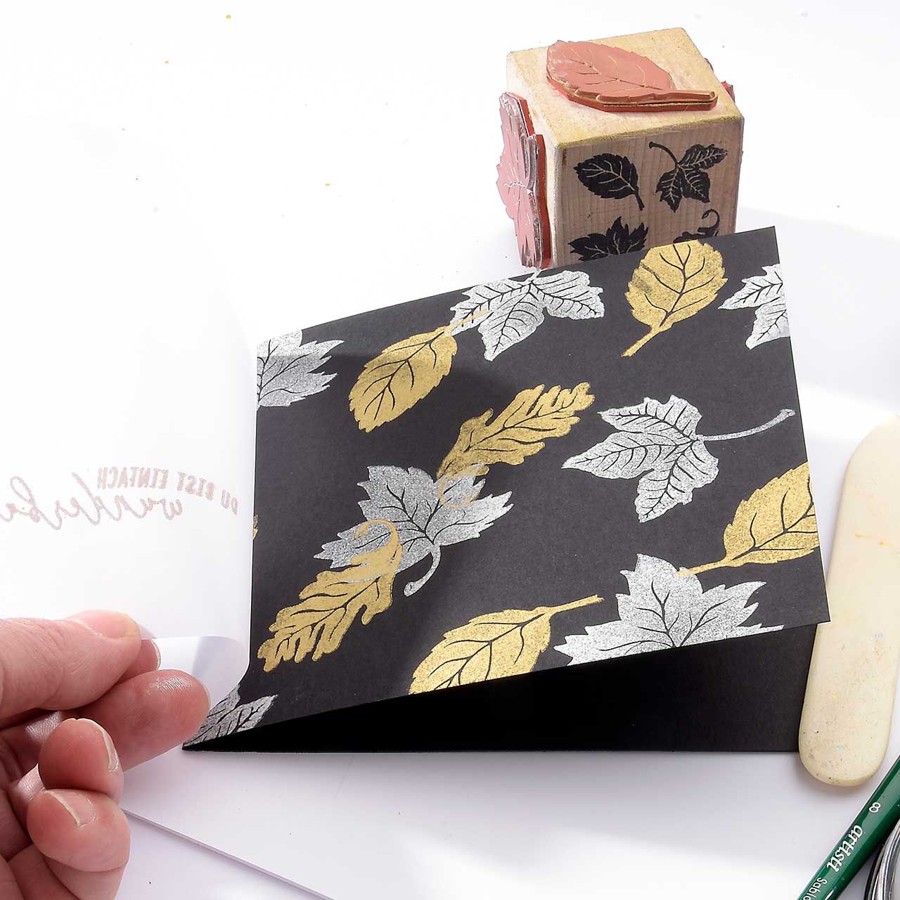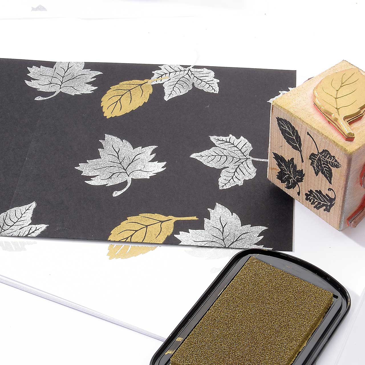 Stempeln Sie das vierte, der vier fallenden Blätter Motive mit dem silbernen Stempelkissen mehrfach auf Ihre Karte. Für ein gleichmäßiges Druckbild färben Sie den Stempel vor jedem Abdruck erneut ein.