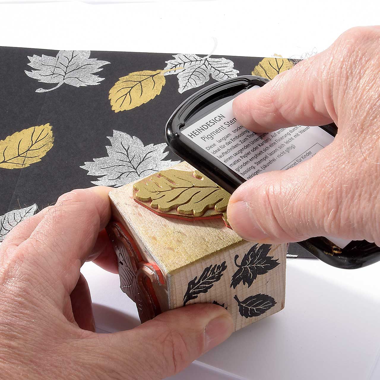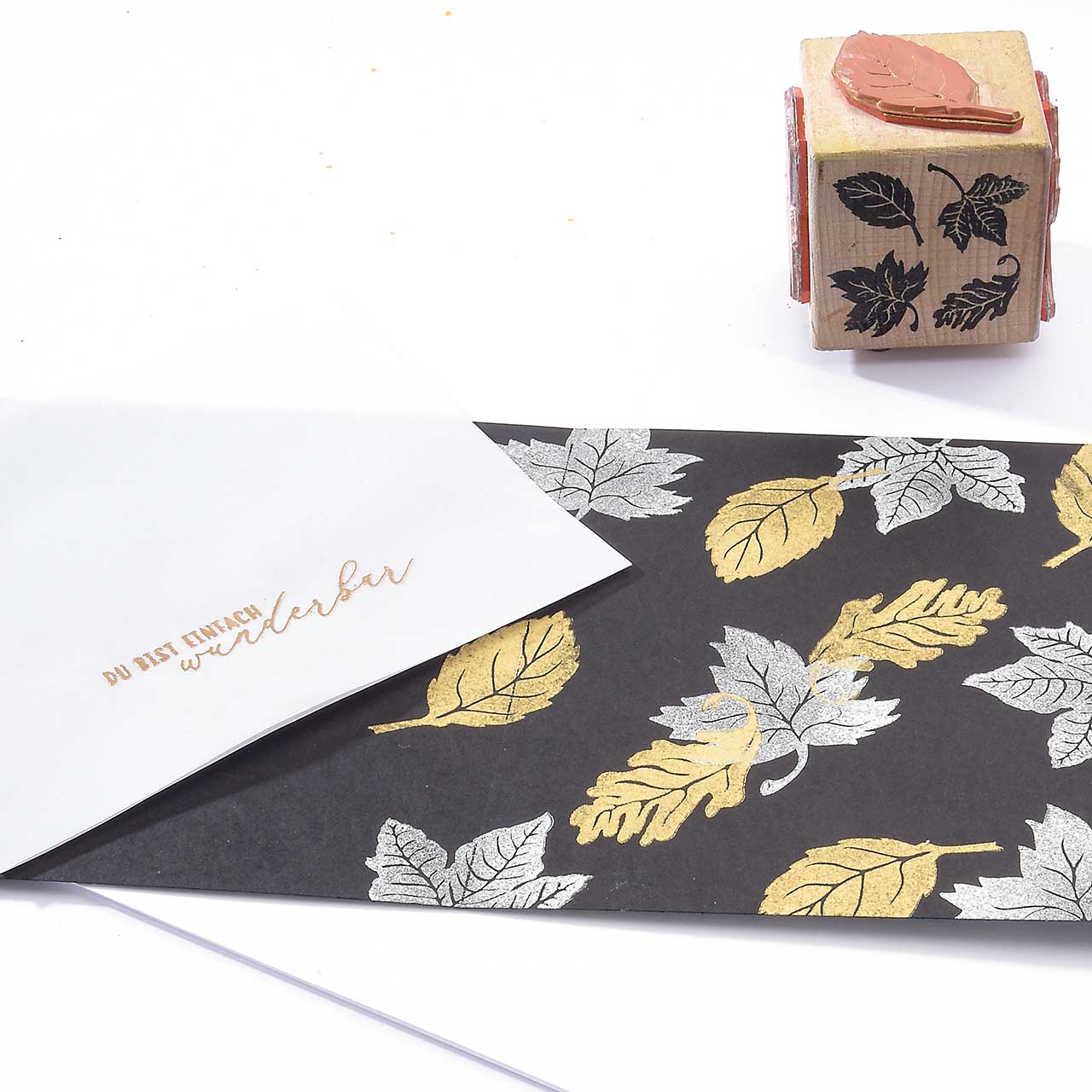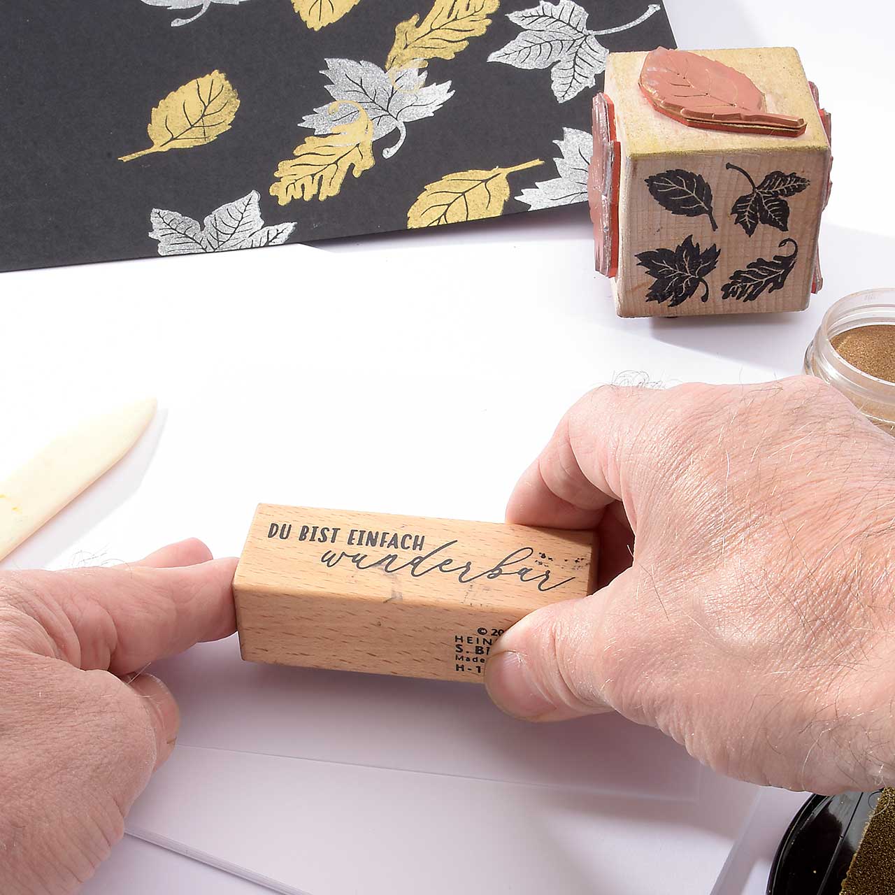 Stempeln Sie das dritte, der vier fallenden Blätter Motive mit dem goldenen Stempelkissen mehrfach auf Ihre Karte. Für ein gleichmäßiges Druckbild färben Sie den Stempel vor jedem Abdruck erneut ein.