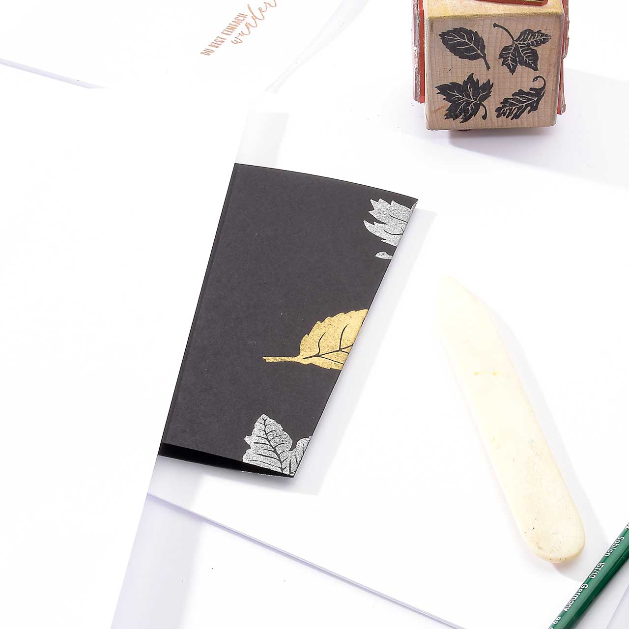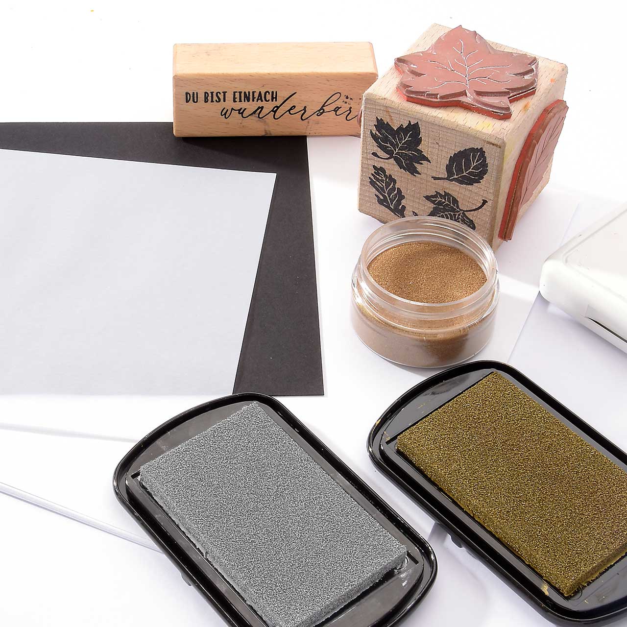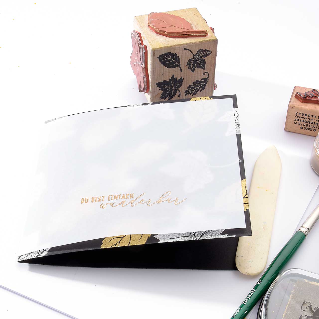 Stempeln Sie das dritte, der vier fallenden Blätter Motive mit dem goldenen Stempelkissen mehrfach auf Ihre Karte. Für ein gleichmäßiges Druckbild färben Sie den Stempel vor jedem Abdruck erneut ein.