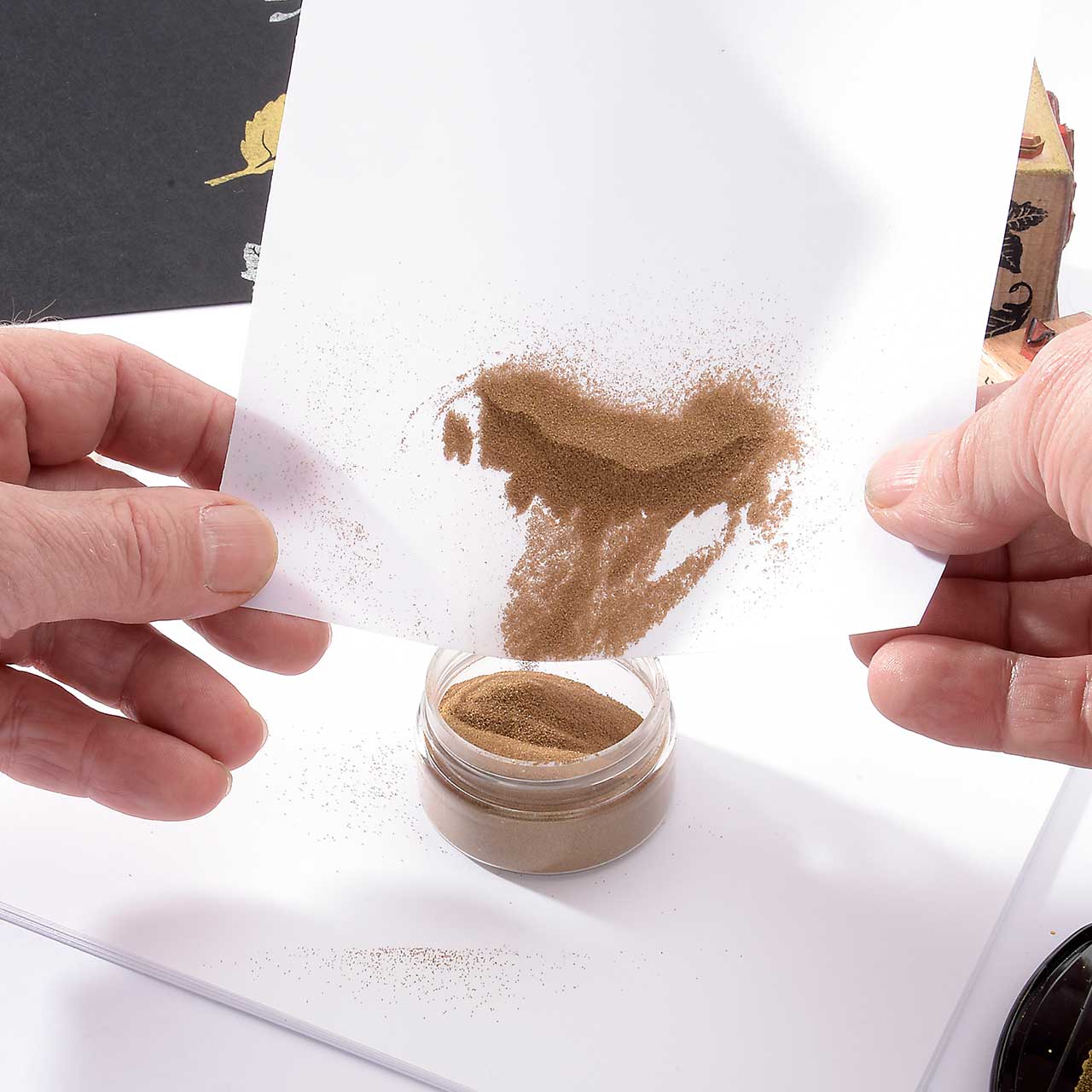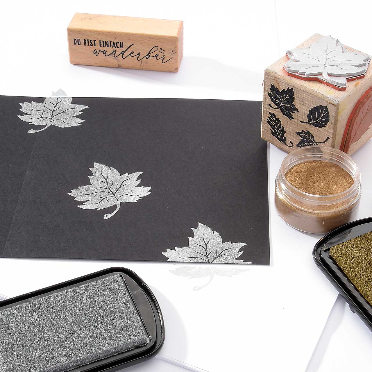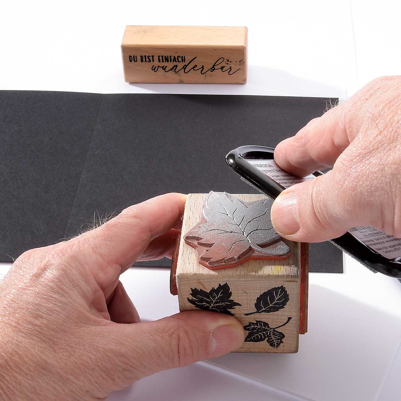 Stempeln Sie eines der vier fallenden Blätter Motive mit dem silbernen Stempelkissen mehrfach auf Ihre Karte. Für ein gleichmäßiges Druckbild färben Sie den Stempel vor jedem Abdruck erneut ein.